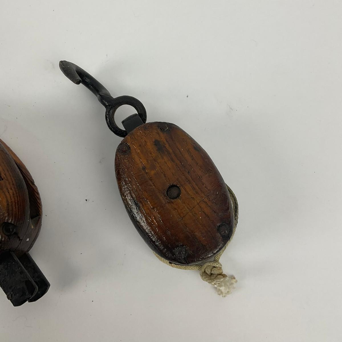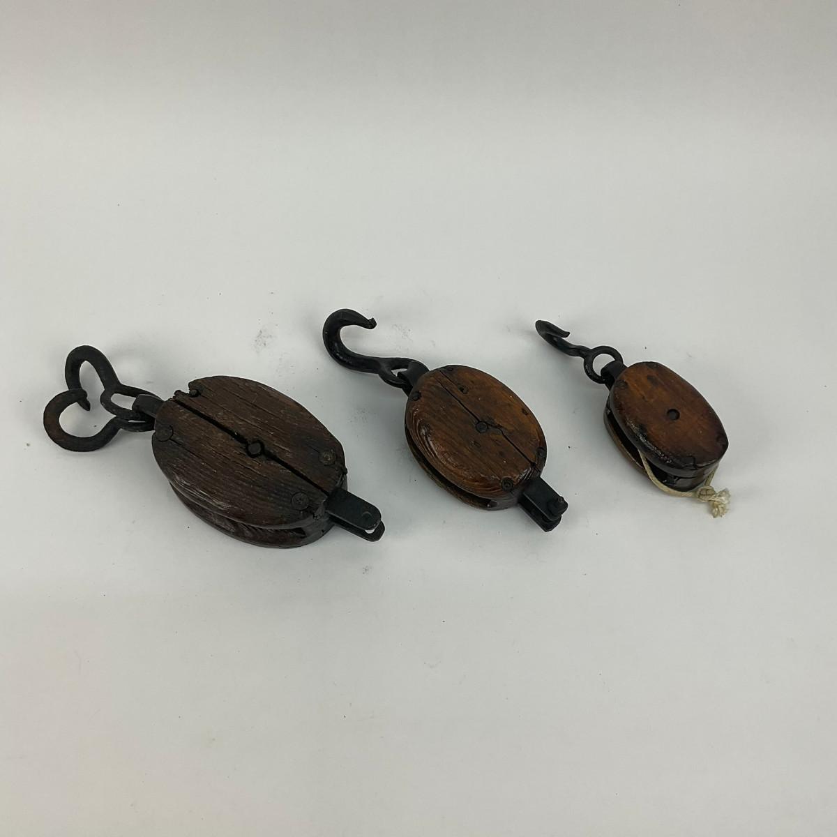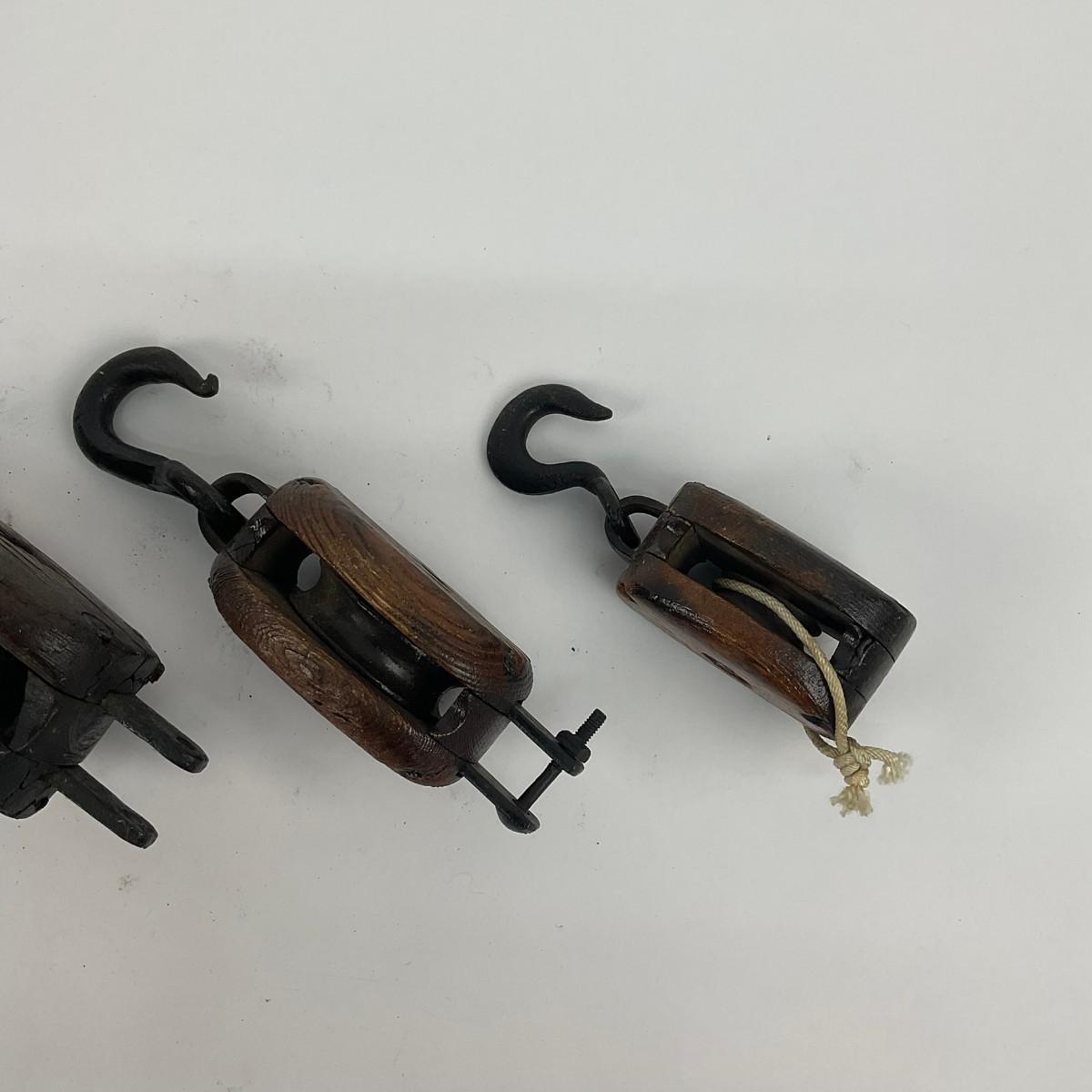 548 Set Of Three Antique Wooden Block And Tackle Pulleys With Iron Hooks