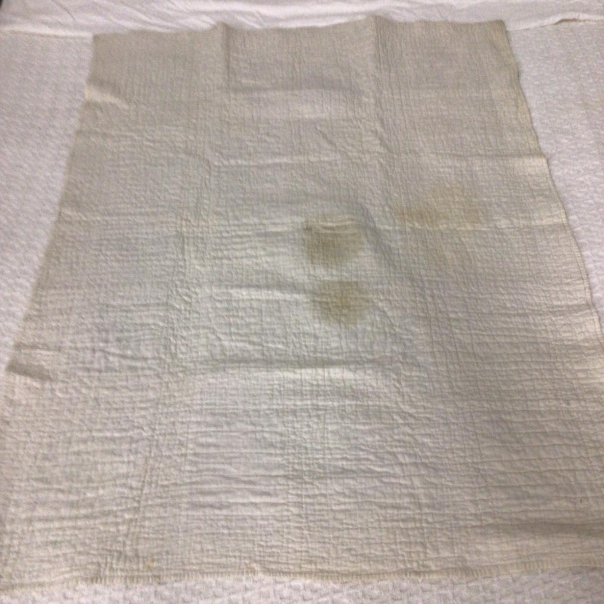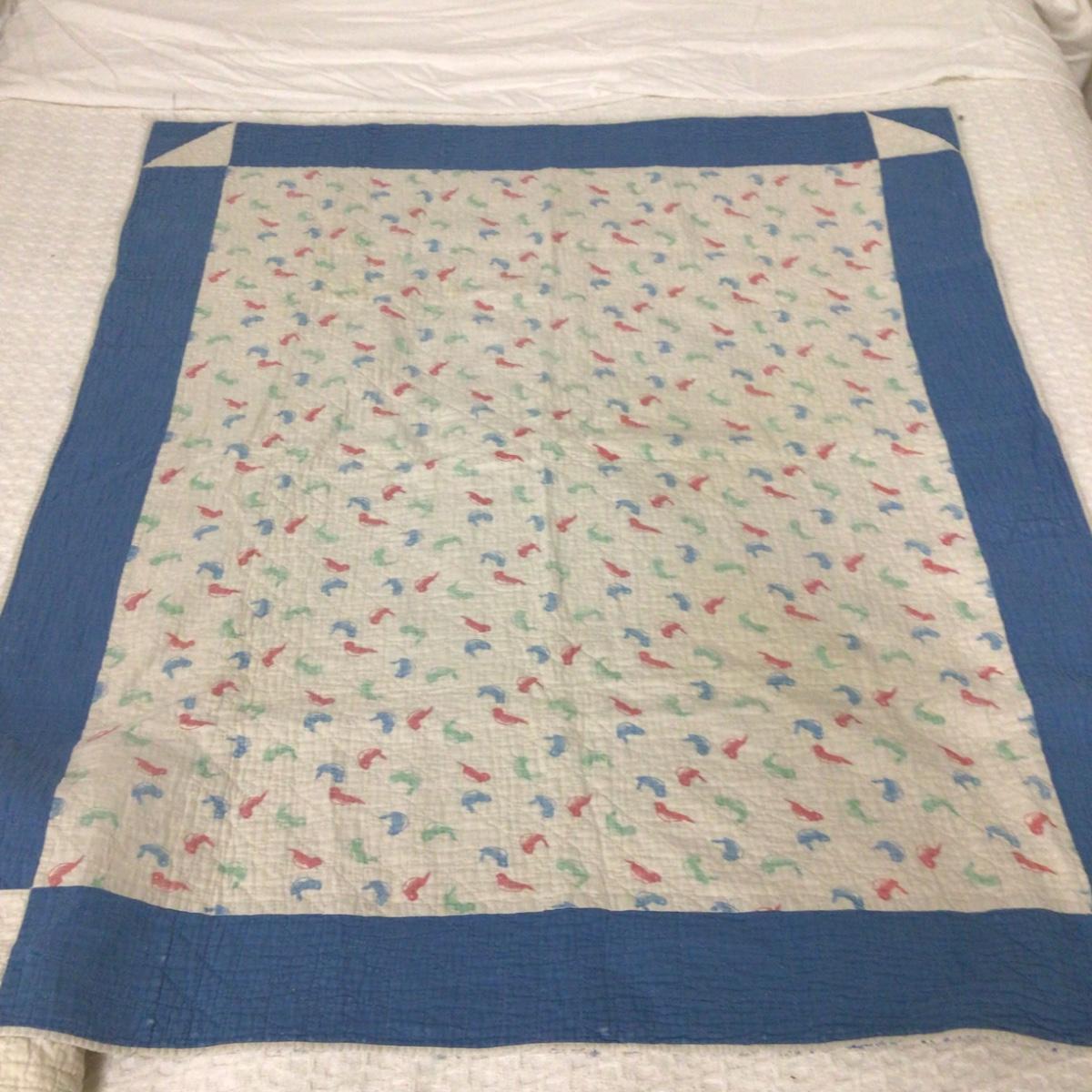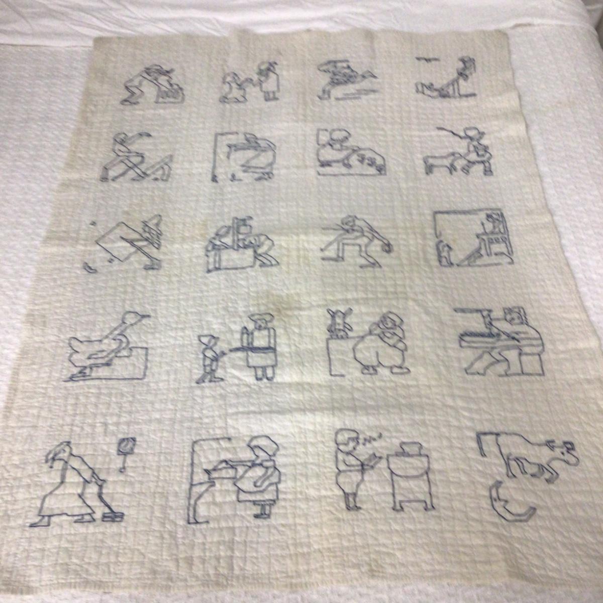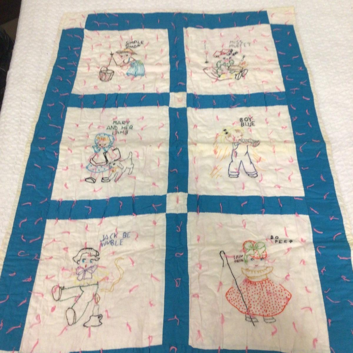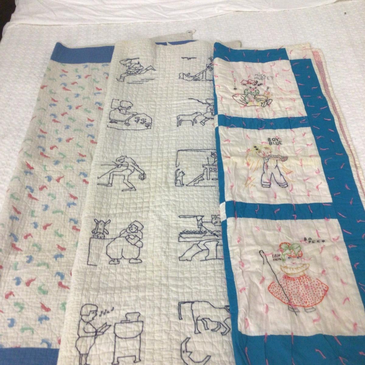 Hand embroidered Art Deco Childs Scene Quilt , one is a blue border with bird pattern quilt and one has Story book themed quilt , hand tied . All three measure approximately 40” x 50”