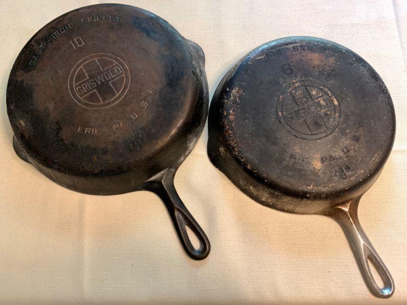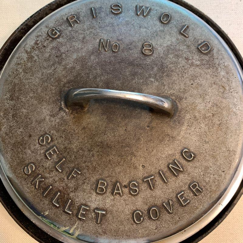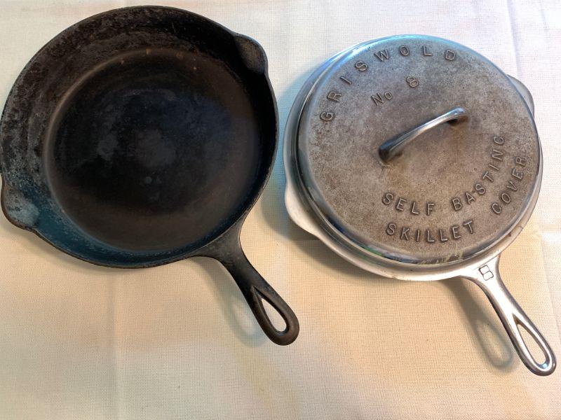 #55  ANTIQUE GRISWALDS CAST IRON SKILLETS & SELF BASTING SKILLET LID