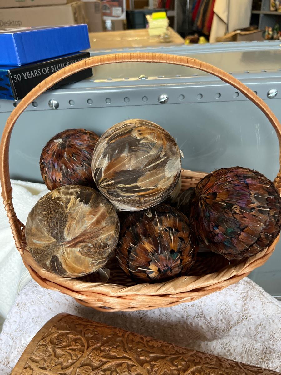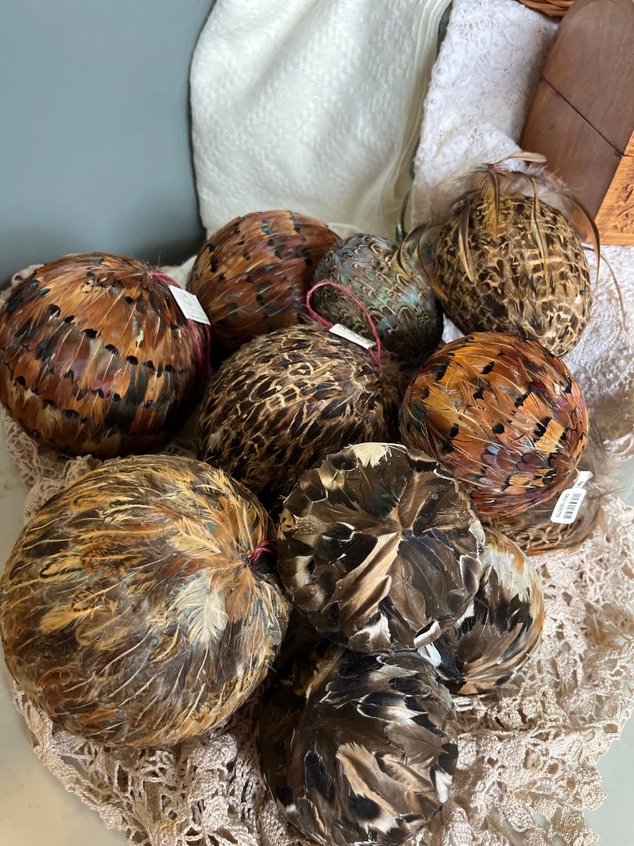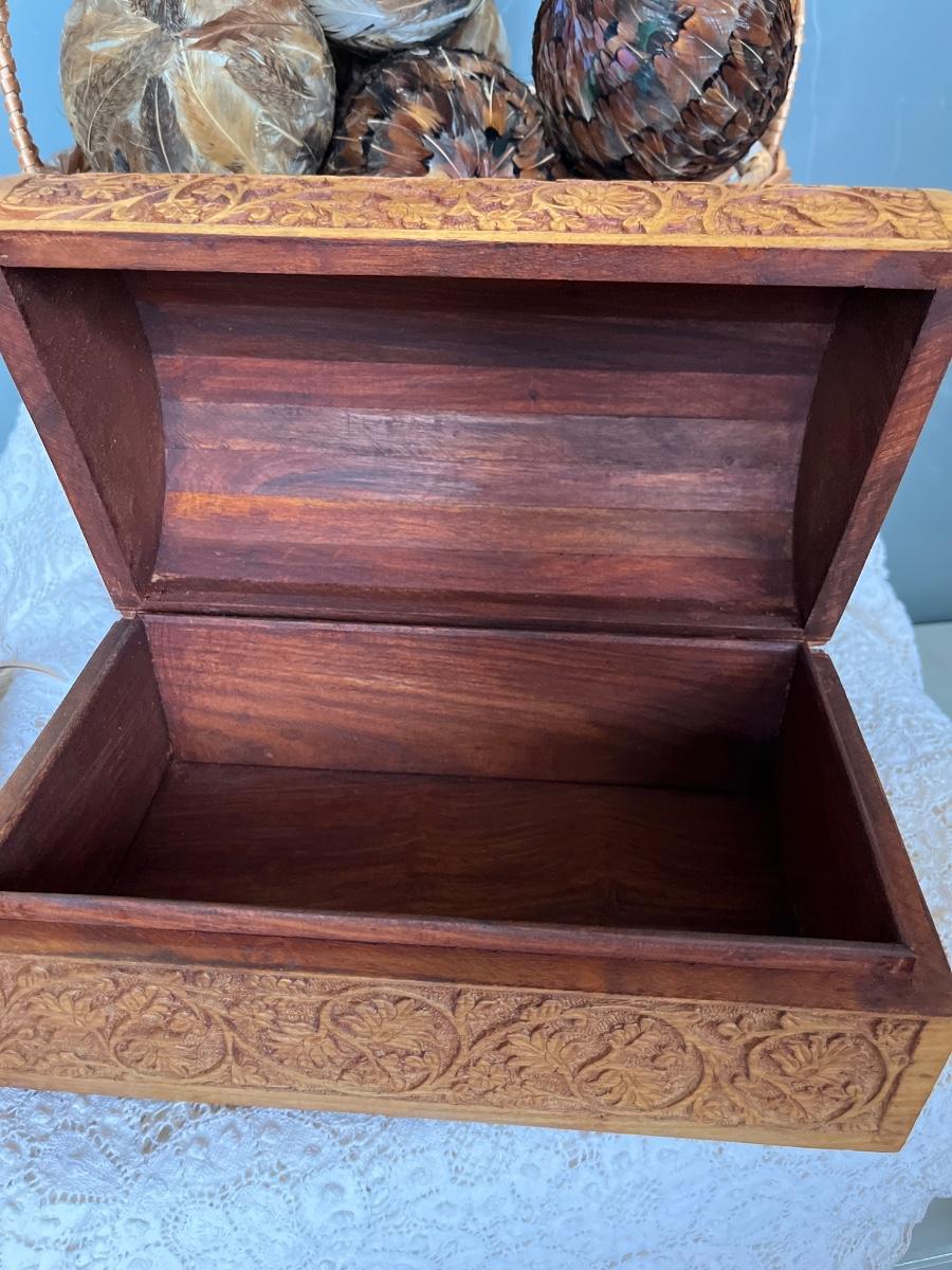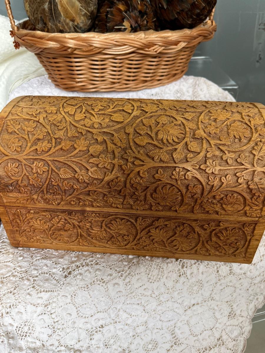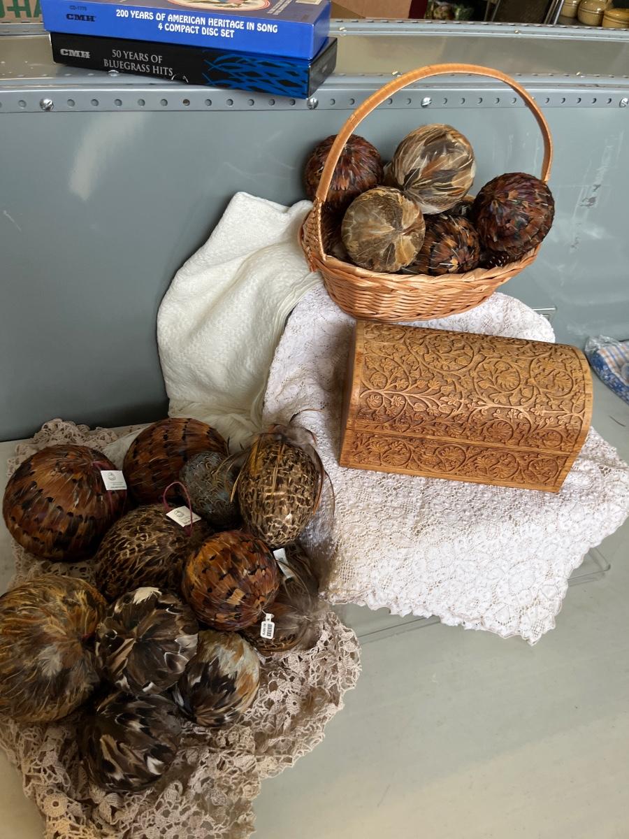55- Feather decor, carved jewelry box, crochet tablecloths