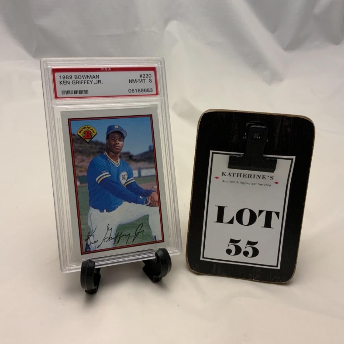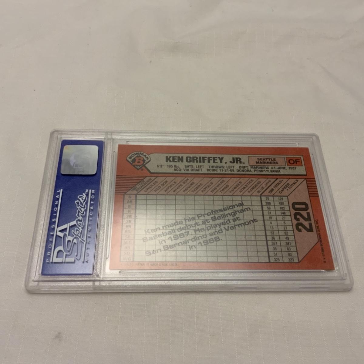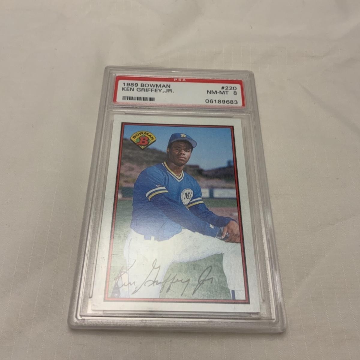 Graded Ken Griffey Jr Bowman Card #220 from the 1989 Series. Graded by PSA NM-MT 9. Please see photos for details and condition. ::: Shipping is available on this lot. If you require shipping you must let us know at the close of the auction. We will coordinate with you after the item has been won. Shipping fees will include insurance up to or exceeding the value of all items being mailed. If you have any questions regarding this lot please contact the auctioneer either via this website, by direct email or by phone. PICK UP TIMES and other important information can be found in the TERMS and DESCRIPTION of the auction. Please take a look for pertinent information. Thanks!