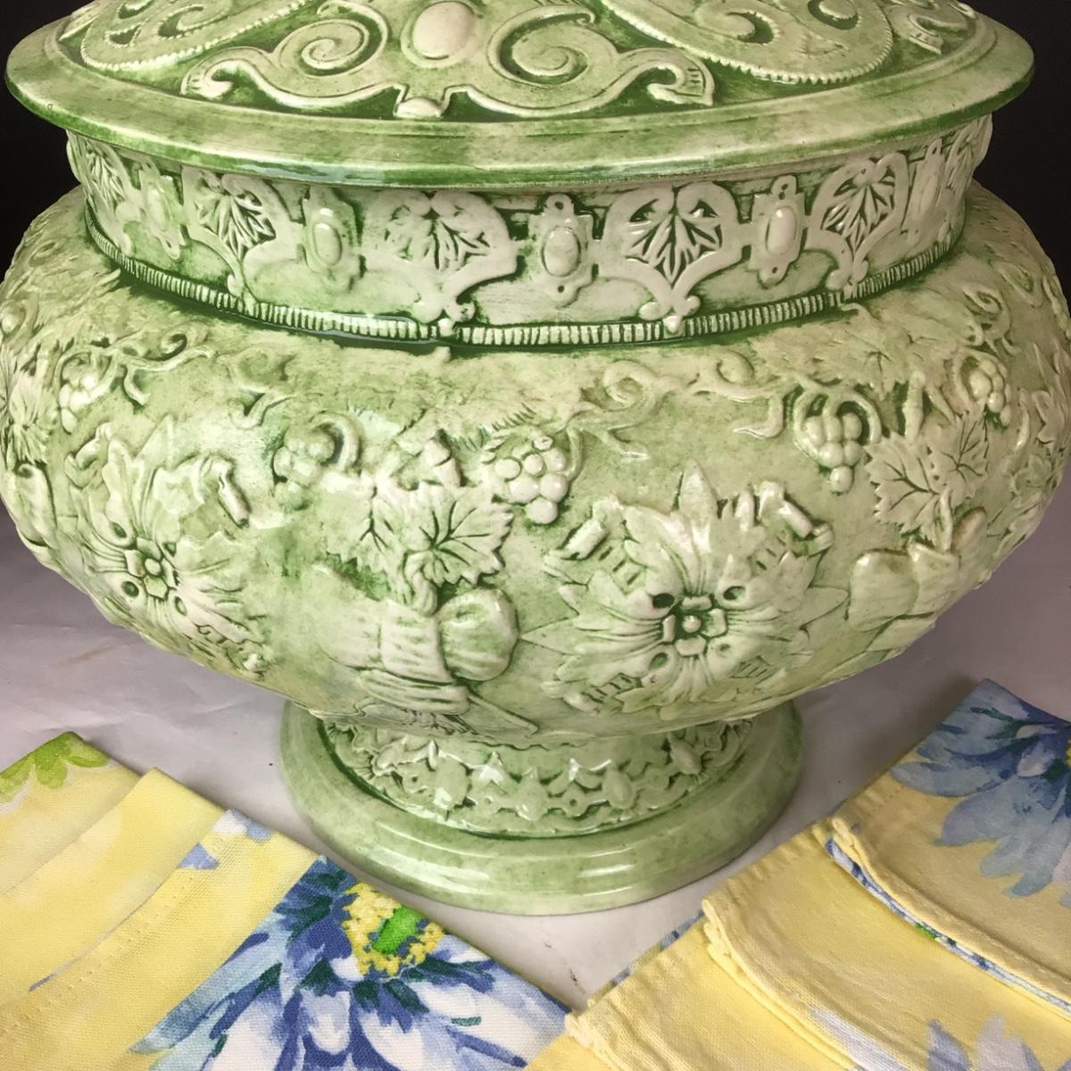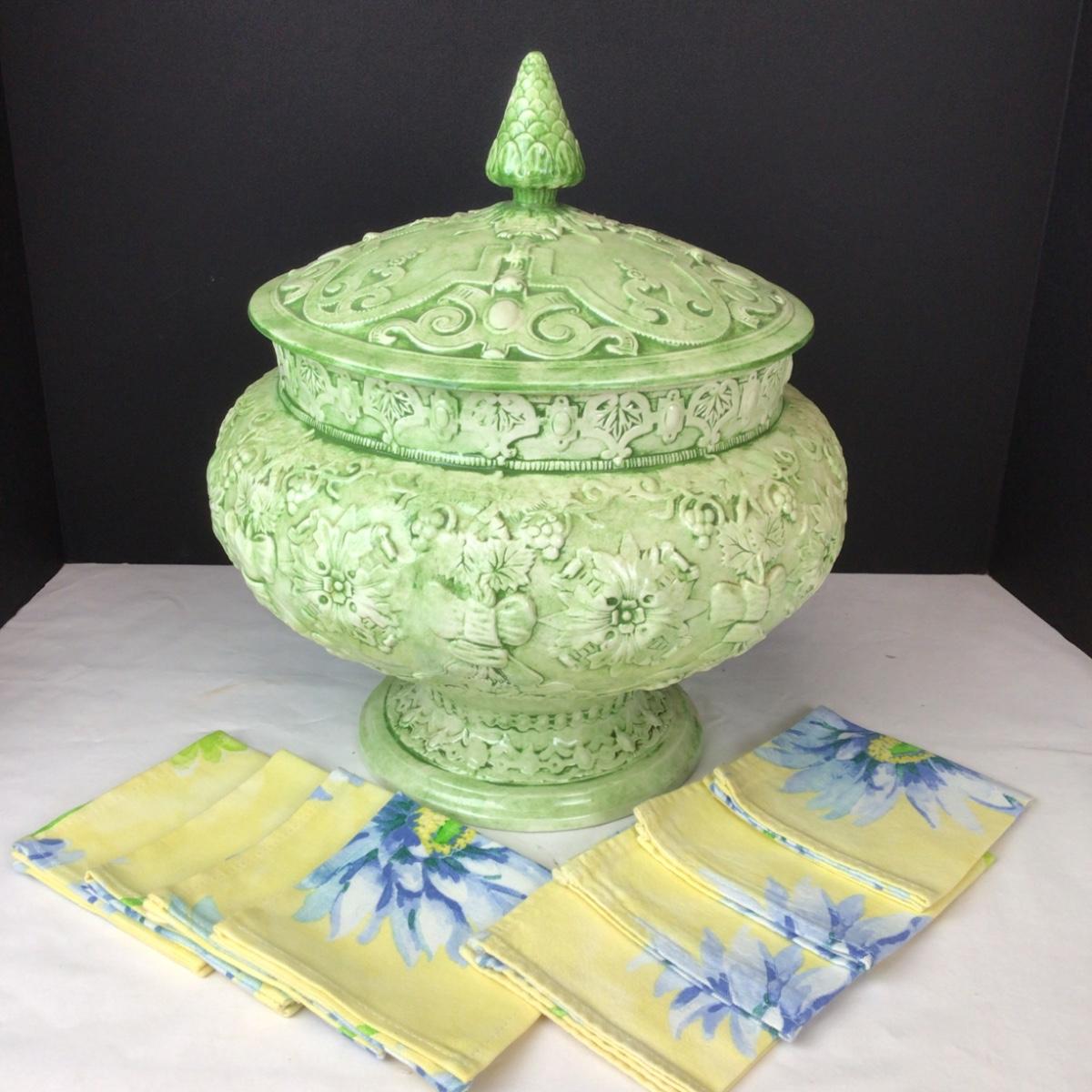 Tureen is handpainted-cast mold, signed Jo and dated 1970, measures 14” tall and 10”wide.