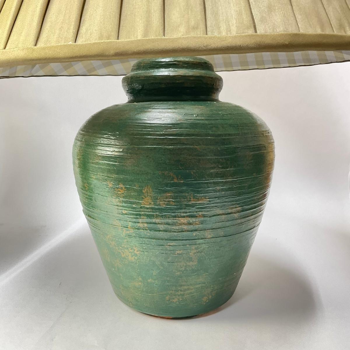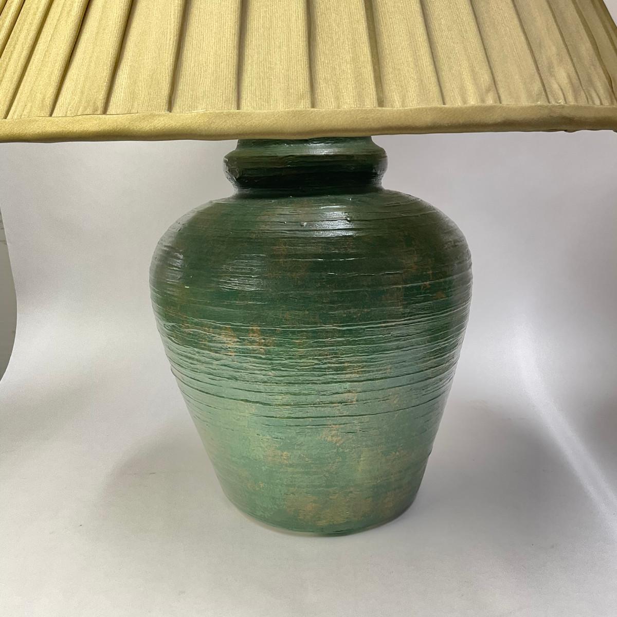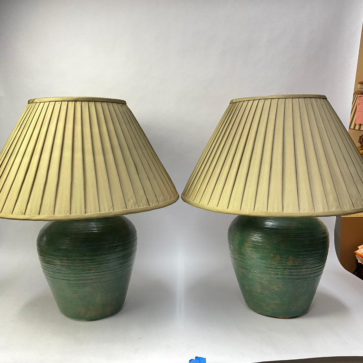 554 Pair Of Green Pottery Lamps With Silk Shades
