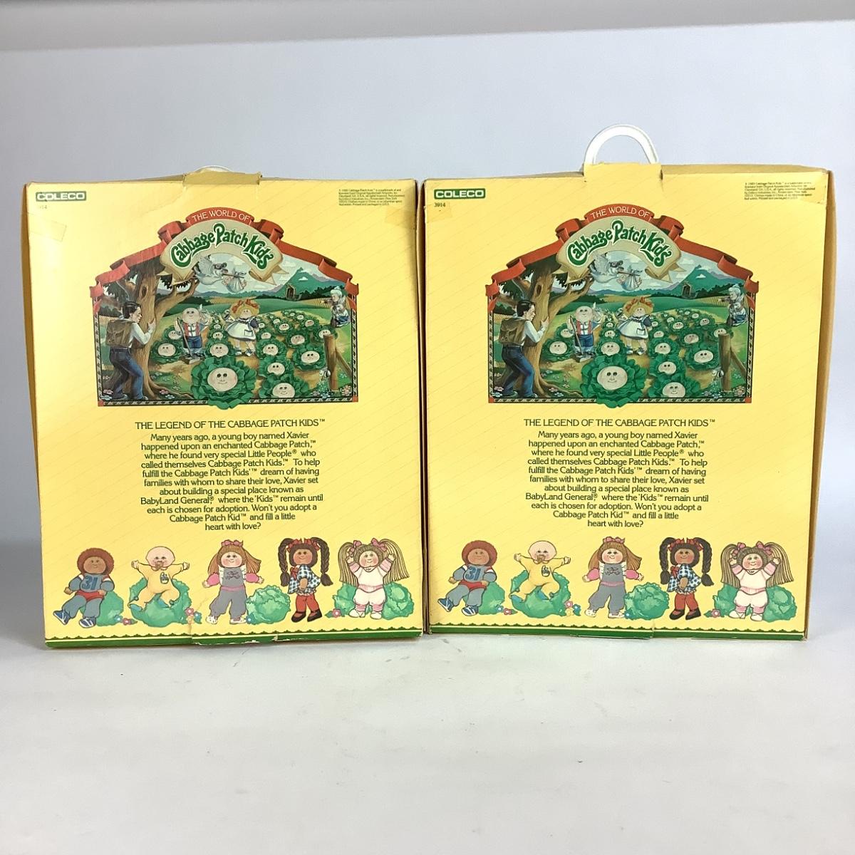 By Coleco Cabbage Patch Kids, the whole outfit comes in both boxes but the shoes have fell on their display place and are sitting in the bottom of the box. The boxes have dents and rips to both of them.