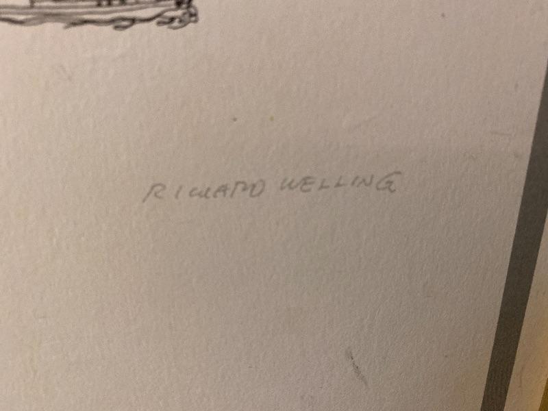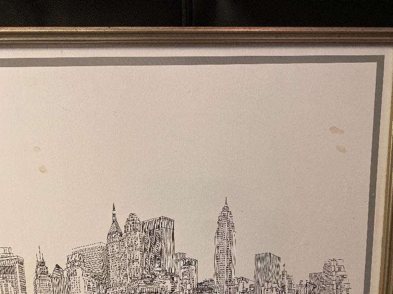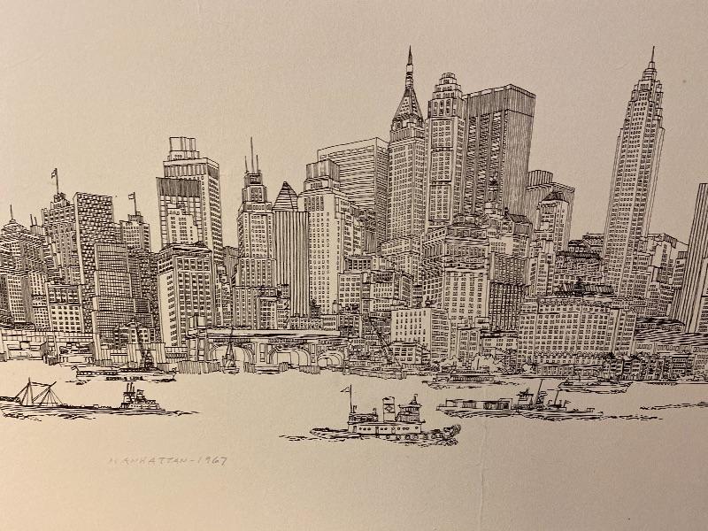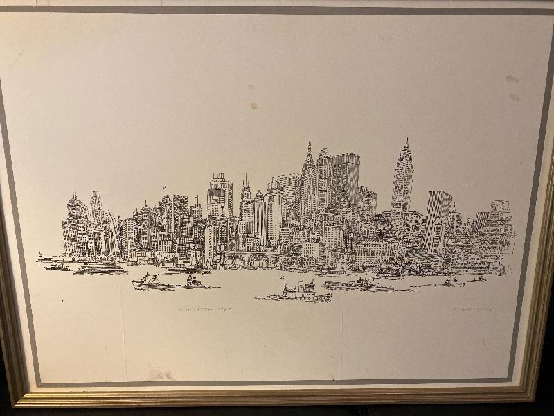 Manhattan in 1967 art by Richard Welling measures 25.25" wide x 19" tall (has small spot near the top of the frame )