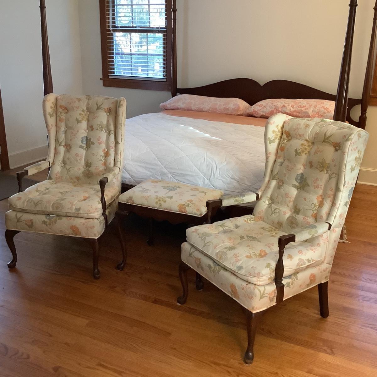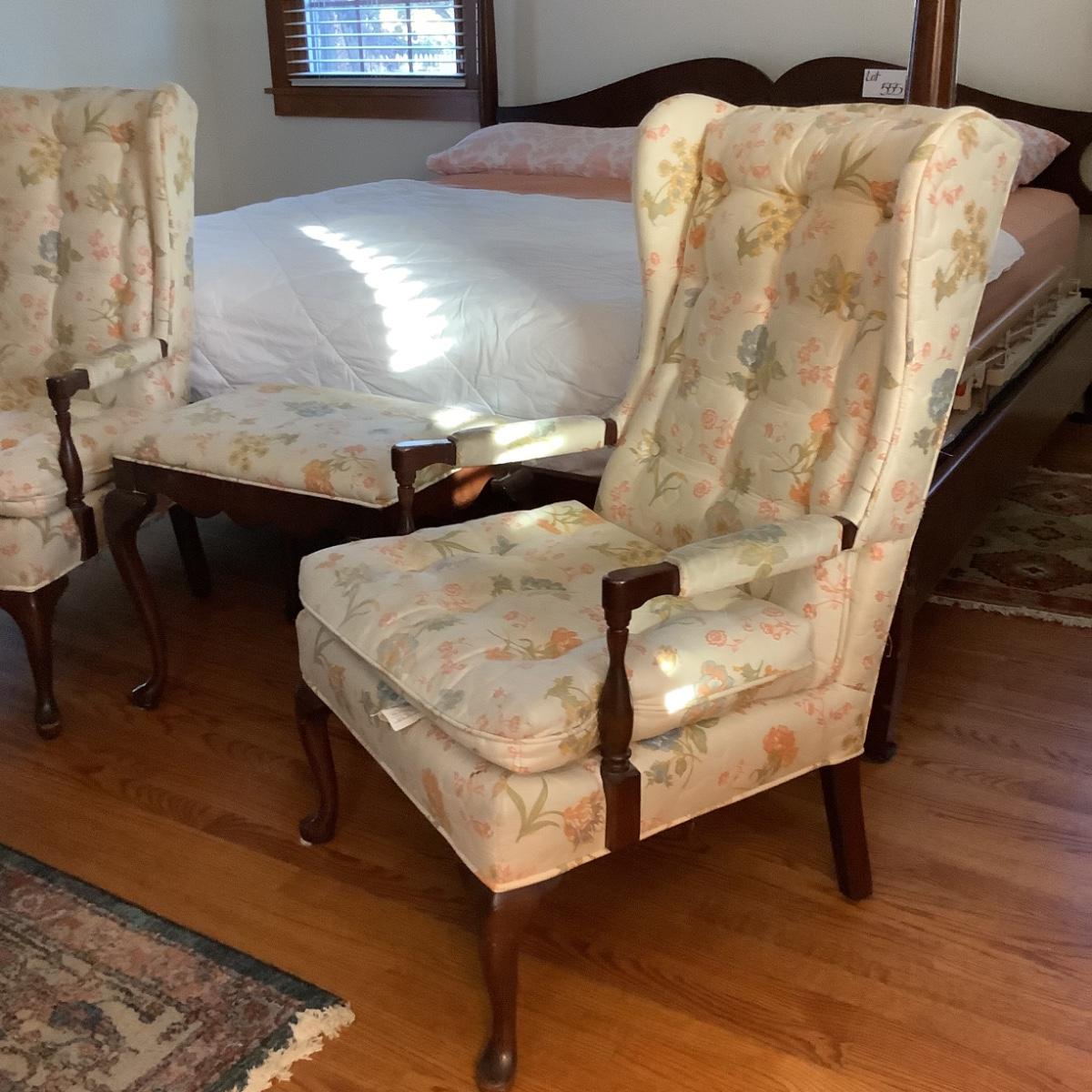 Signs of wear due to age . Chair measures 40"high x 23" wide x 23" deep x 15" seat height x 18" seat depth