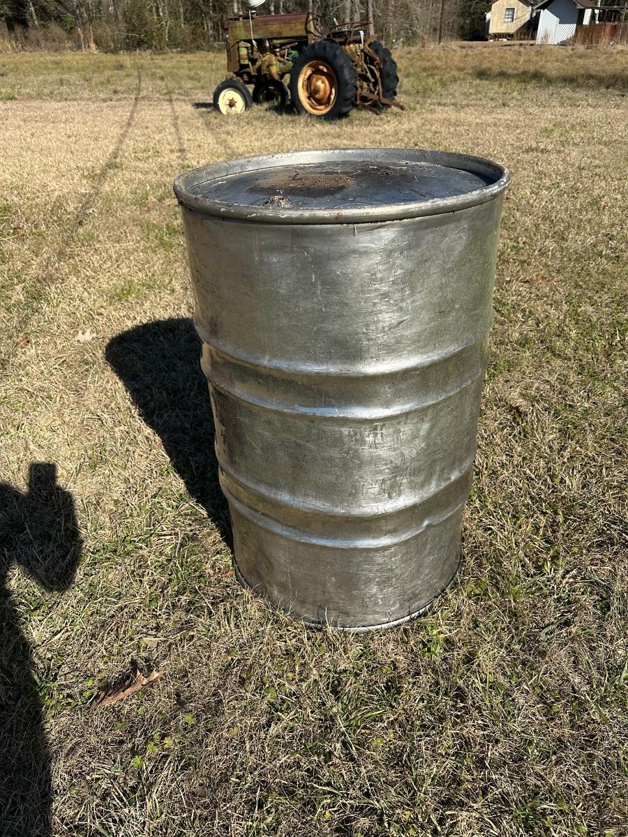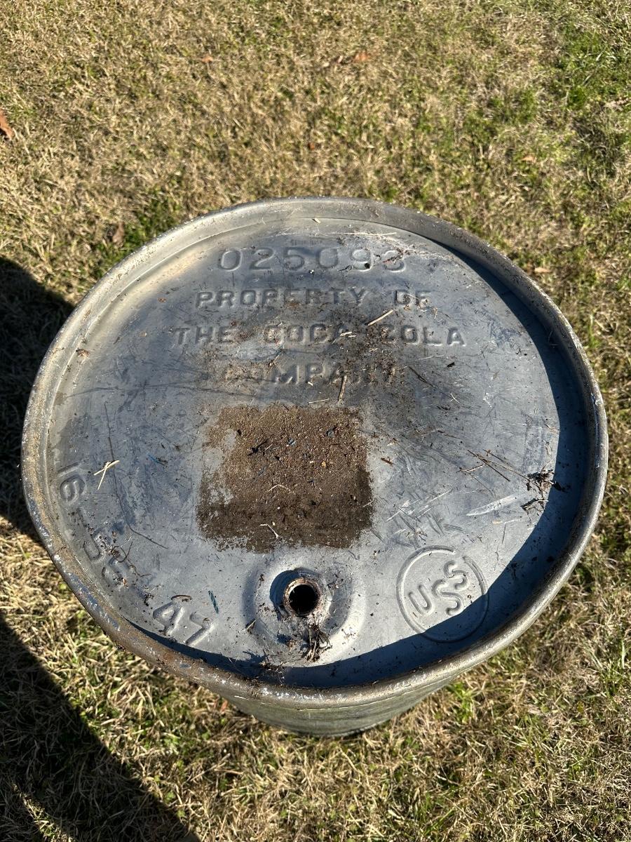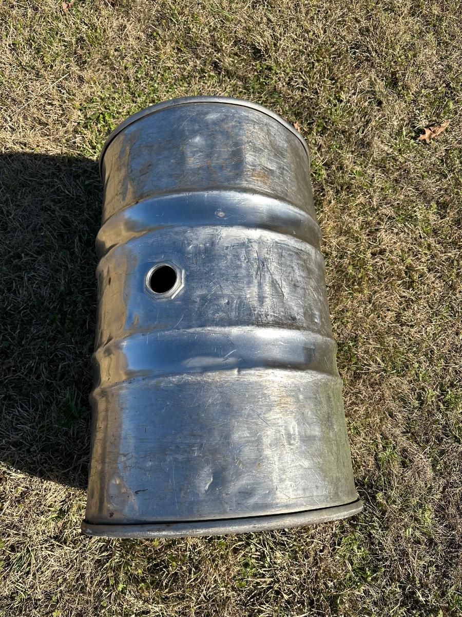 Heavy-duty 55-gallon stainless steel drum with original stamped lid marked “Property of The Coca-Cola Co.” Drum appears to be food-grade stainless with rolled rim and side bung opening. Bung opening measures approximately 2 inches (see photos). Shows scratches, dirt, and cosmetic wear from outdoor storage but remains solid and intact. Ideal for farm use, rain collection, fire pit conversion, smoker build, shop use, or industrial décor.