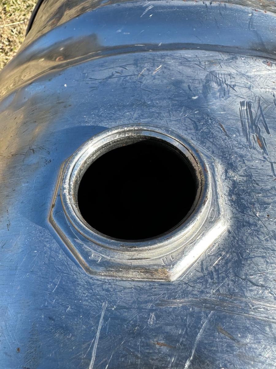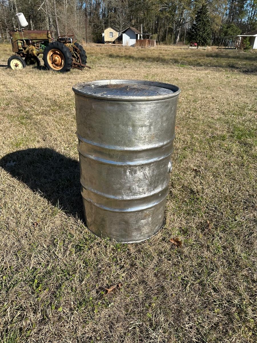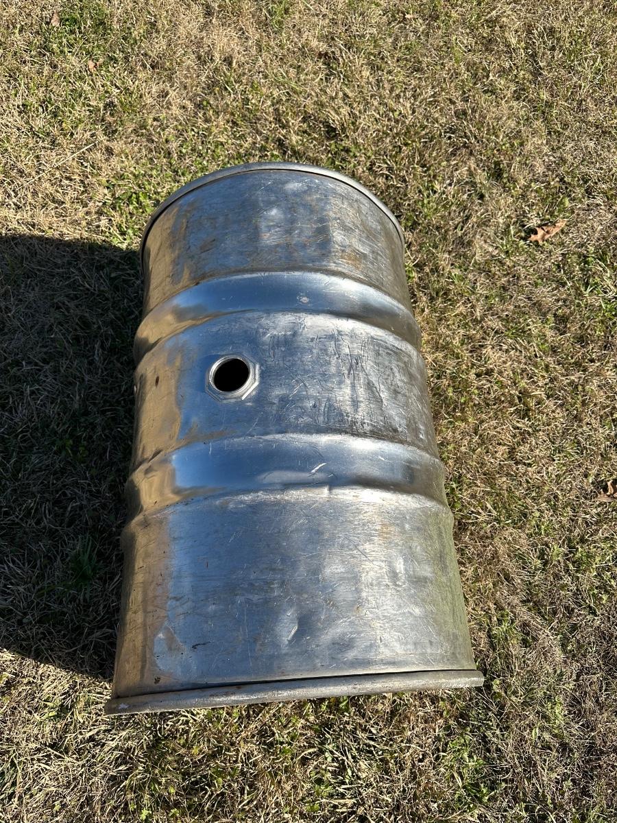 Heavy-duty 55-gallon stainless steel drum with original stamped lid marked “Property of The Coca-Cola Co.” Drum appears to be food-grade stainless with rolled rim and side bung opening. Bung opening measures approximately 2 inches (see photos). Shows scratches, dirt, and cosmetic wear from outdoor storage but remains solid and intact. Ideal for farm use, rain collection, fire pit conversion, smoker build, shop use, or industrial décor.