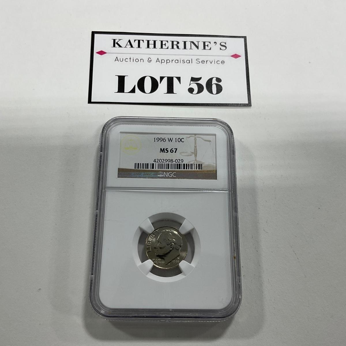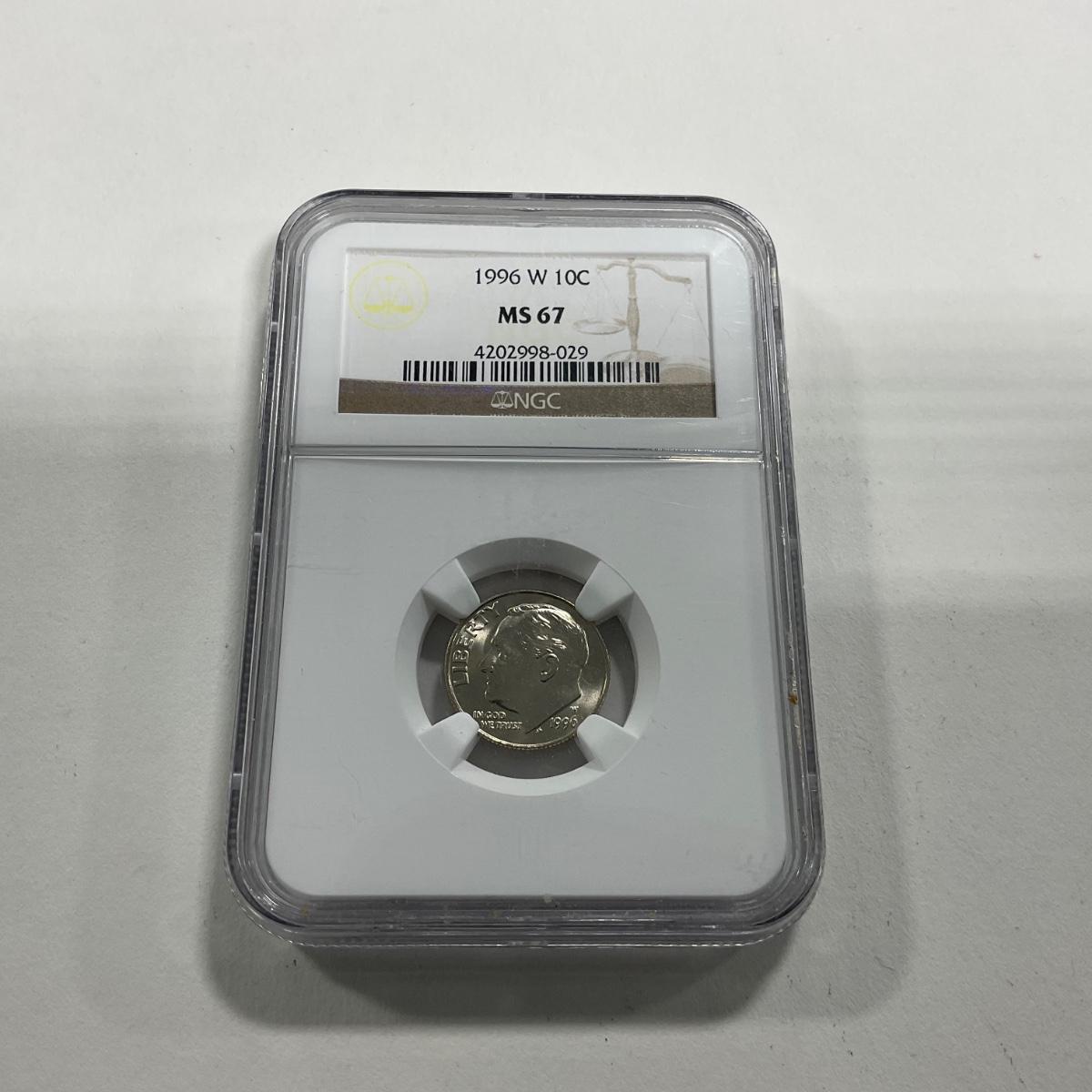 One graded 1996-W Roosevelt Dime NGC-MS67 coin. The West Point Mint. Please see photos for details and condition. ::: Shipping is available on this lot. If you require shipping you must let us know at the close of the auction. We will coordinate with you after the item has been won. Shipping fees will include insurance up to or exceeding the value of all items being mailed. If you have any questions regarding this lot please contact the auctioneer either via this website, by direct email or by phone. PICK UP TIMES and other important information can be found in the TERMS and DESCRIPTION of the auction. Please take a look for pertinent information. Thanks!
