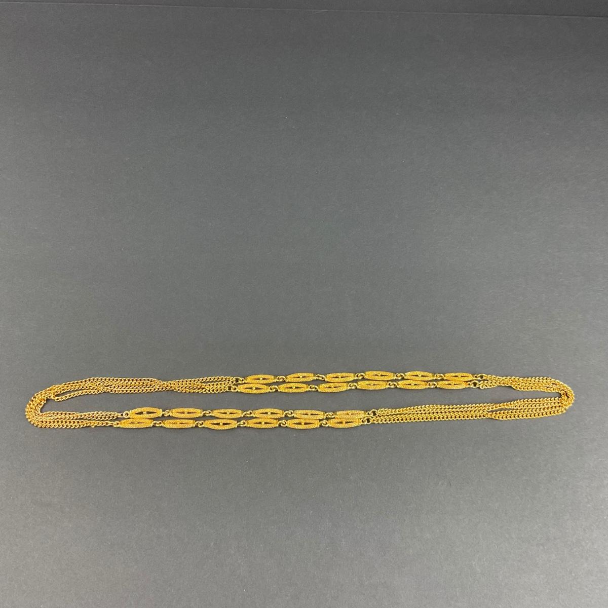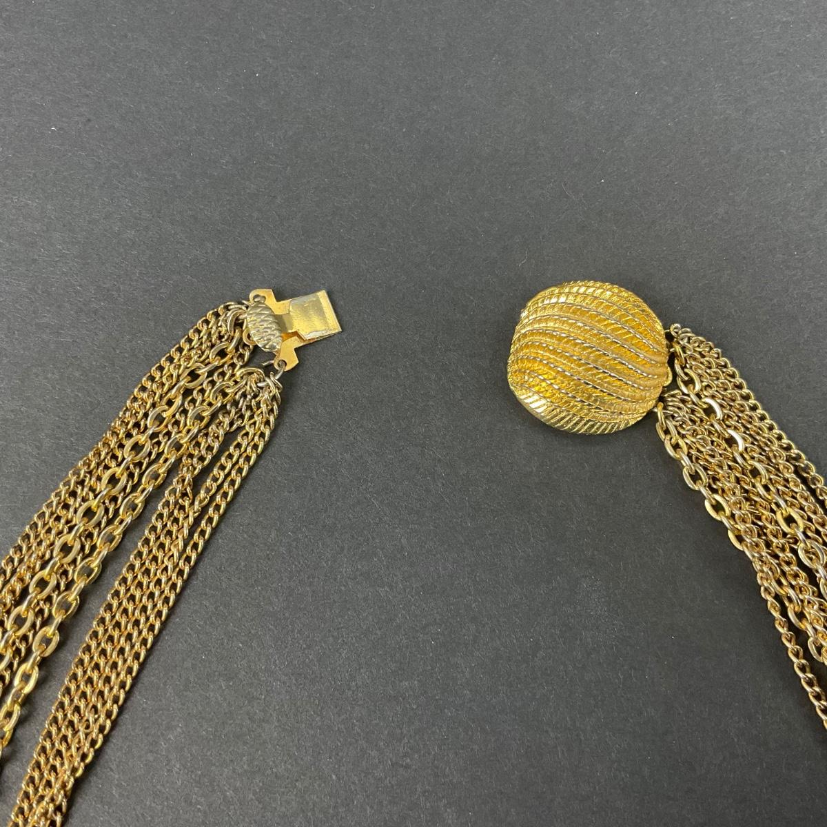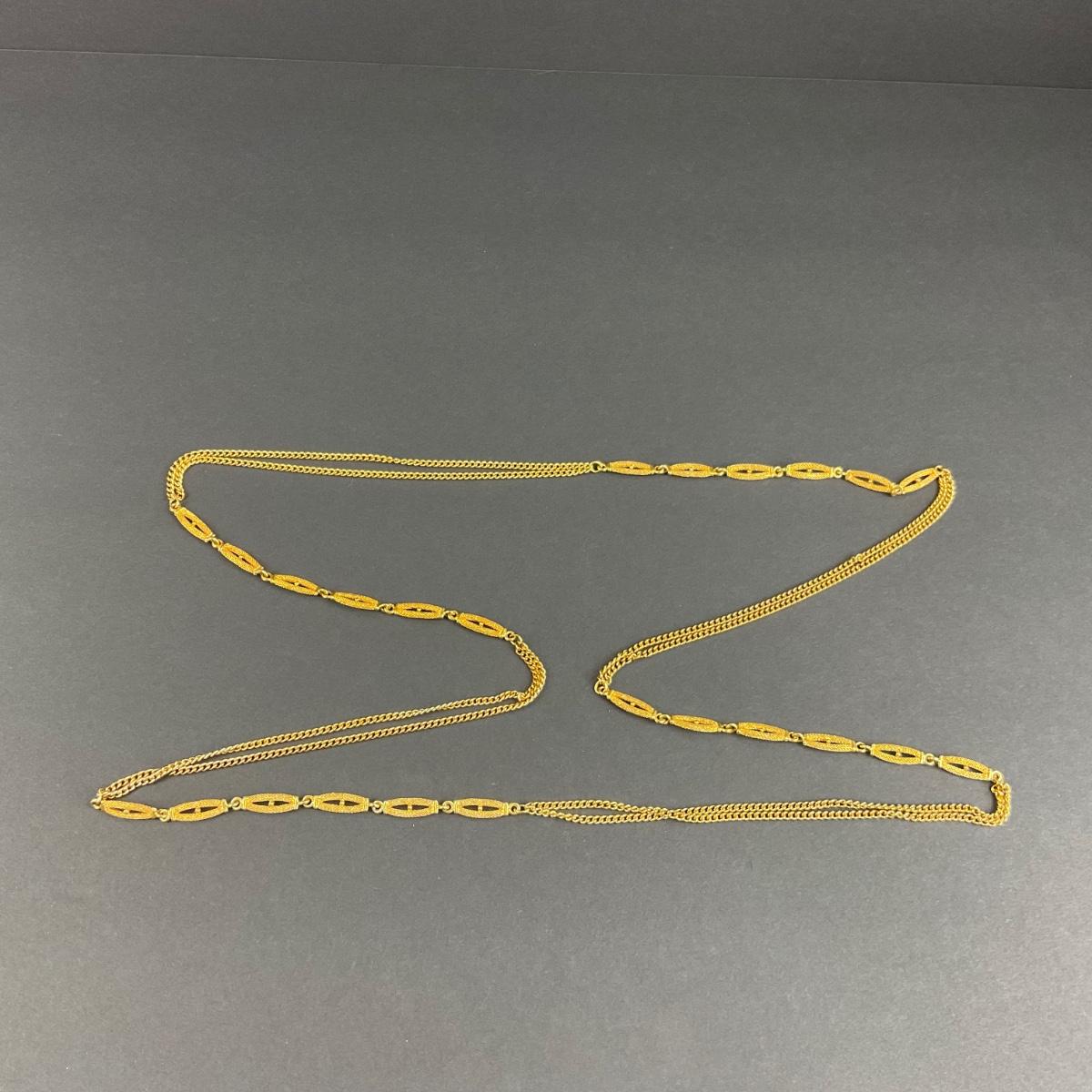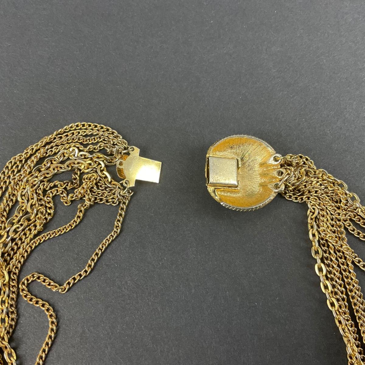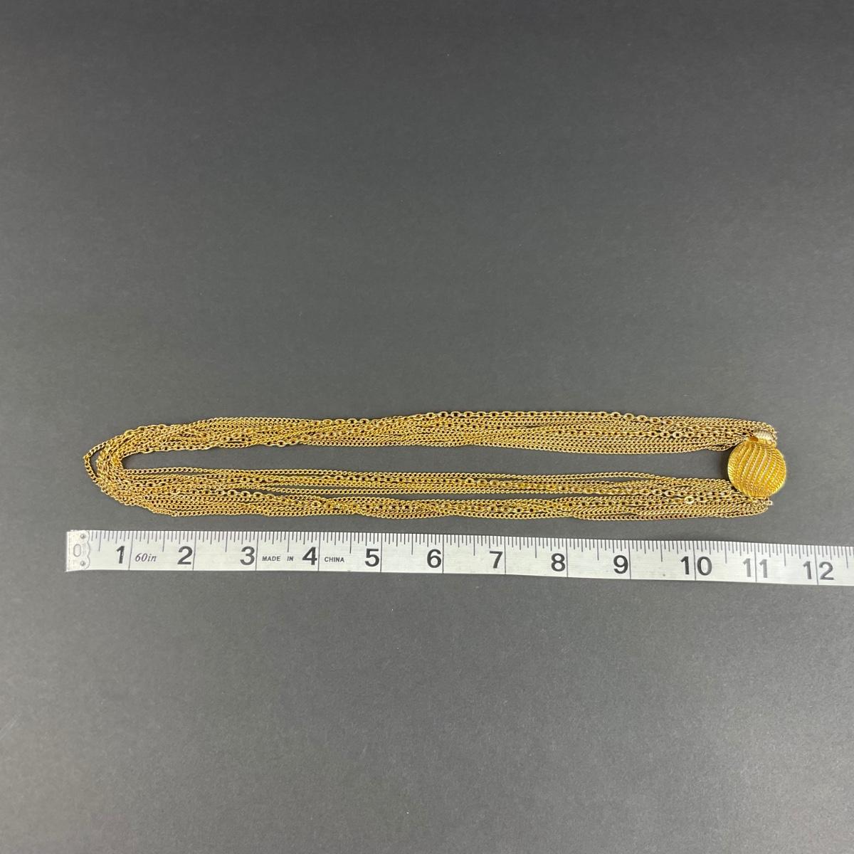 two vintage unmarked gold tone costume jewelry necklaces. One is very long. Please see photos for details and condition. Any condition statement is given as a courtesy to a client, is an opinion, and should not be treated as a statement of fact. Reference to condition written, oral or within a condition report shall not be regarded as a full account of condition and may not include all defects, alterations, or restorations. Absence of a condition report does not imply a lot is flawless or lacking imperfections or damage. Katherine’s Auction & Appraisal Service shall have no responsibility for any error or omission. Returns shall not be accepted on the basis of condition. ::: Shipping is available on this lot. If you require shipping you must let us know at the close of the auction. We will coordinate with you after the item has been won. Shipping fees will include insurance up to or exceeding the value of all items being mailed. If you have any questions regarding this lot please contact the auctioneer either via this website, by direct email or by phone. PICK UP TIMES and other important information can be found in the TERMS and DESCRIPTION of the auction. Please take a look for pertinent information. Thanks!