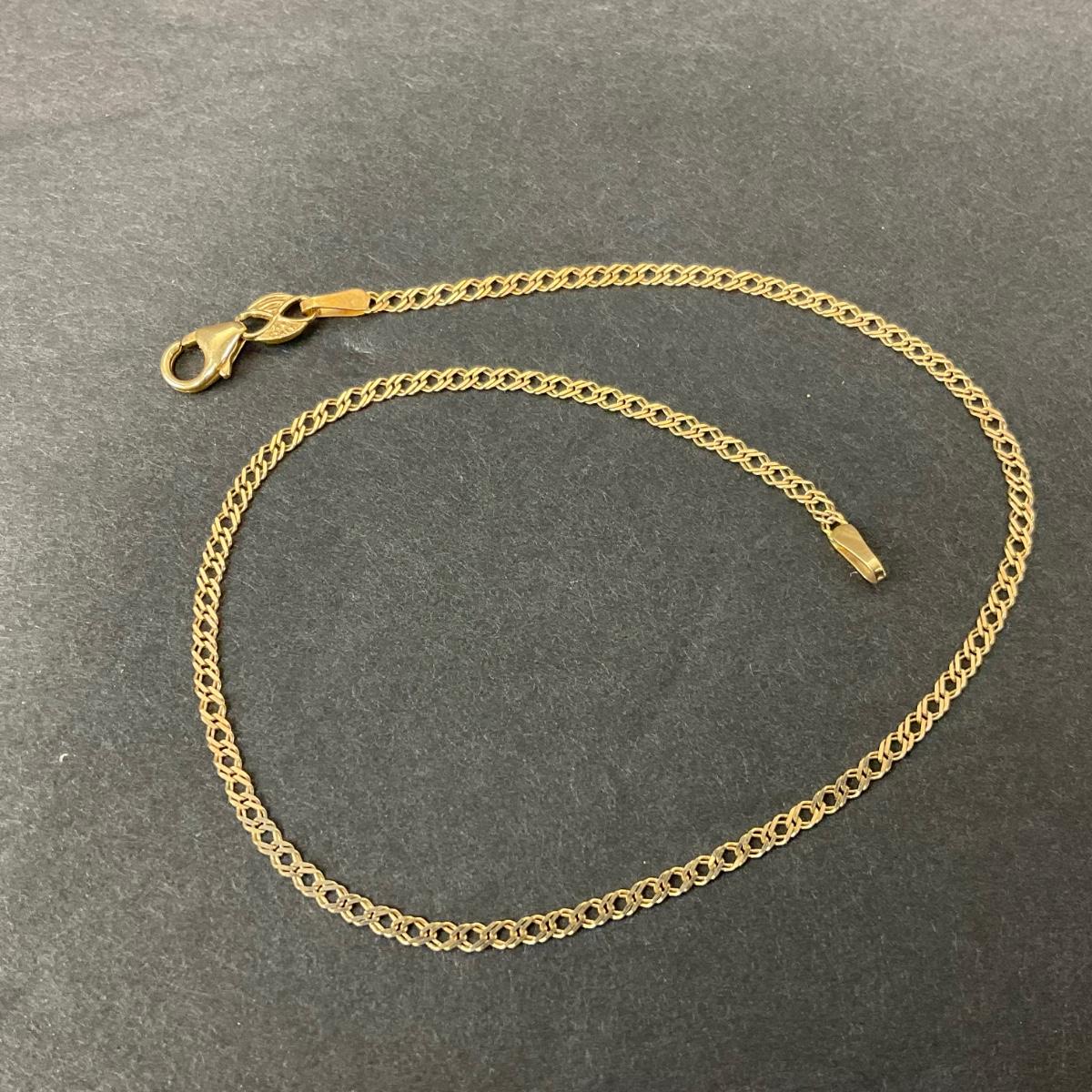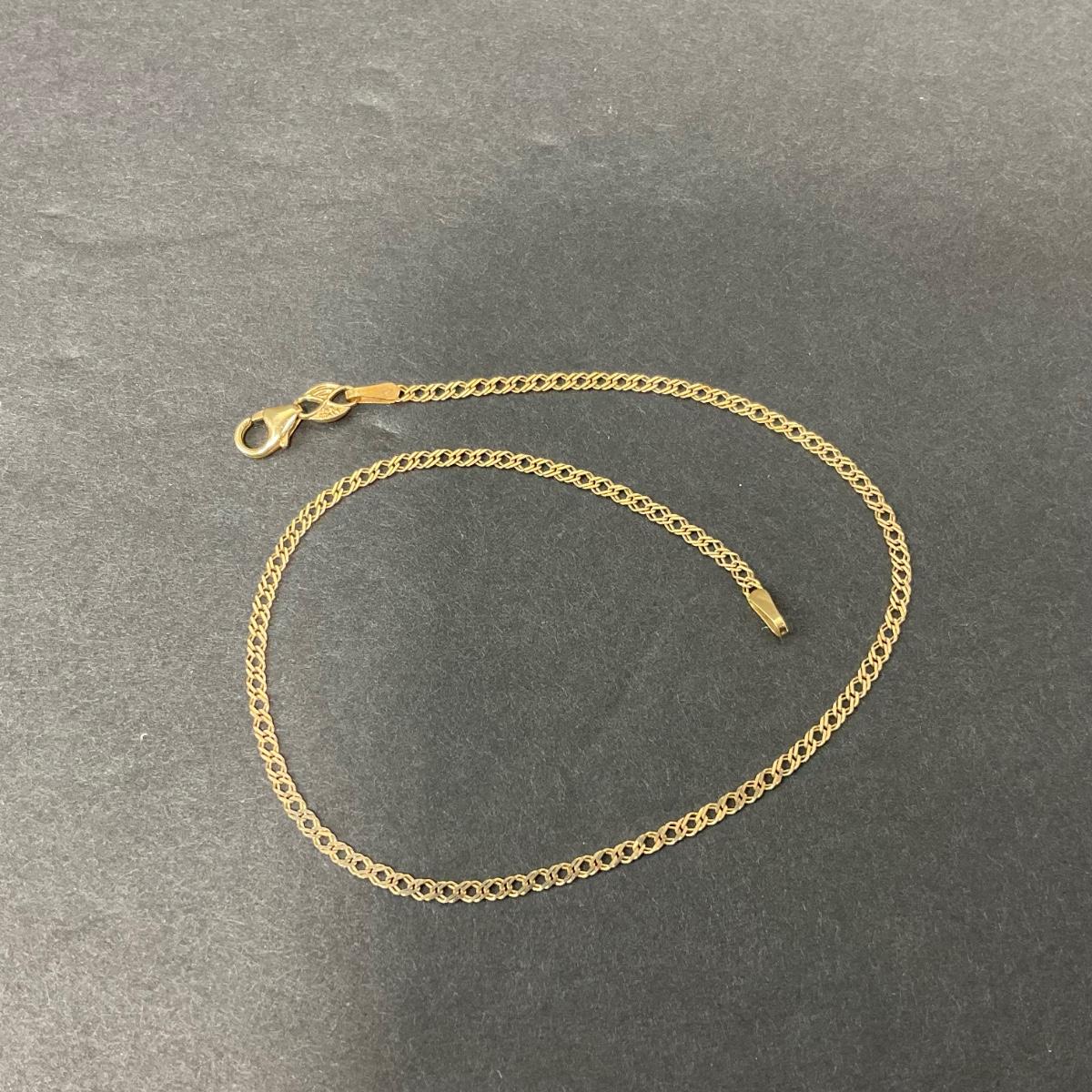 One marked 14K gold bracelet or anklet. The total weight for this piece is 1 DWT. Please see photos for details and condition. Any condition statement is given as a courtesy to a client, is an opinion, and should not be treated as a statement of fact. Reference to condition written, oral or within a condition report shall not be regarded as a full account of condition and may not include all defects, alterations, or restorations. Absence of a condition report does not imply a lot is flawless or lacking imperfections or damage. Katherine’s Auction & Appraisal Service shall have no responsibility for any error or omission. Returns shall not be accepted on the basis of condition. ::: Shipping is available on this lot. If you require shipping you must let us know at the close of the auction. We will coordinate with you after the item has been won. Shipping fees will include insurance up to or exceeding the value of all items being mailed. If you have any questions regarding this lot please contact the auctioneer either via this website, by direct email or by phone. PICK UP TIMES and other important information can be found in the TERMS and DESCRIPTION of the auction. Please take a look for pertinent information. Thanks!