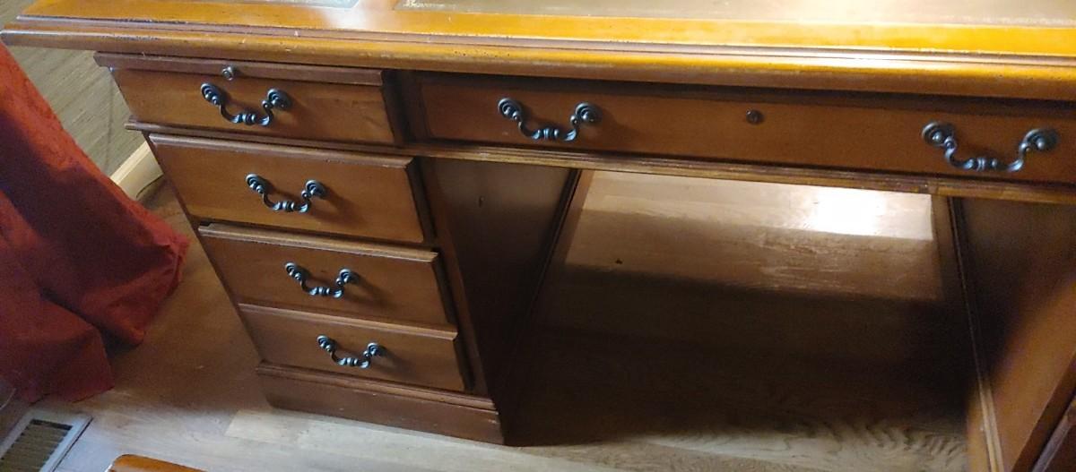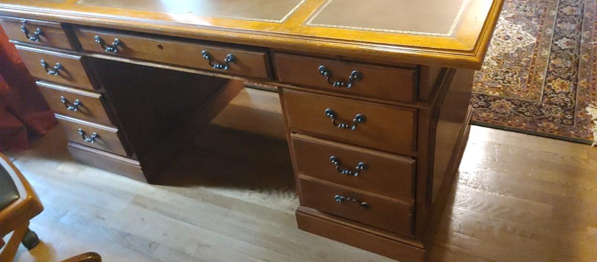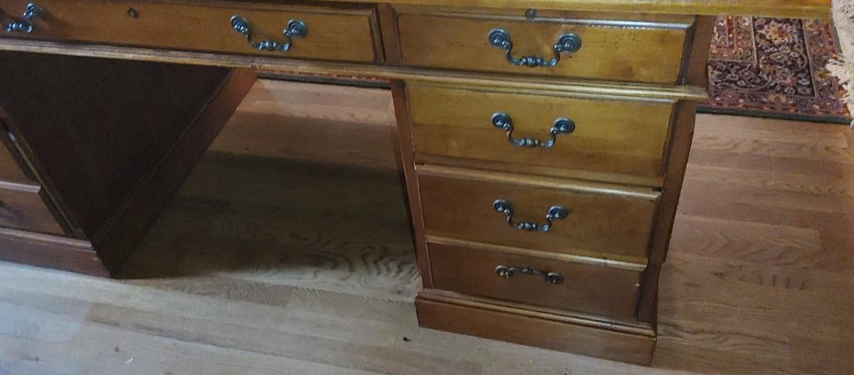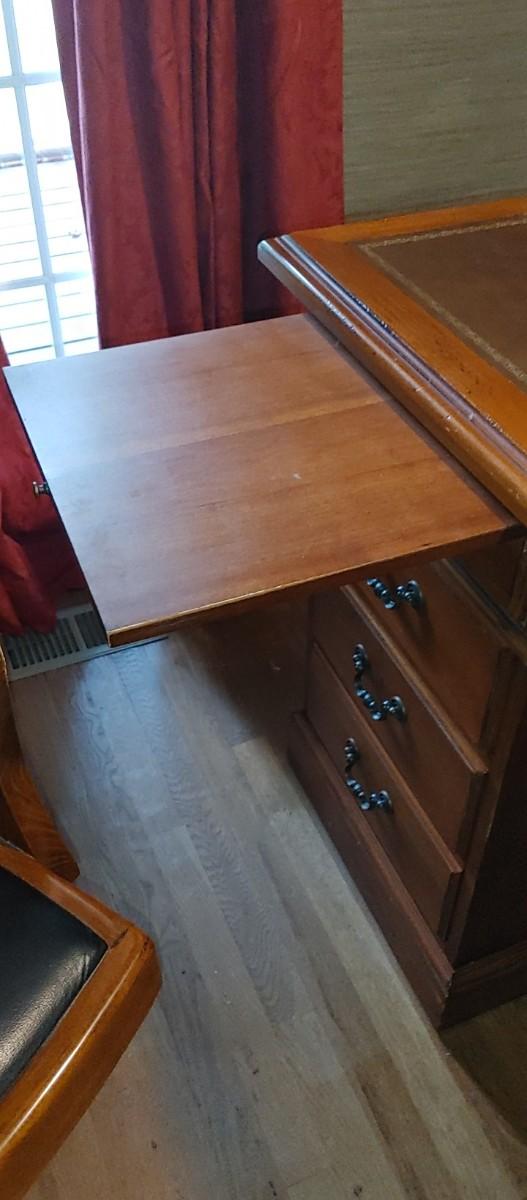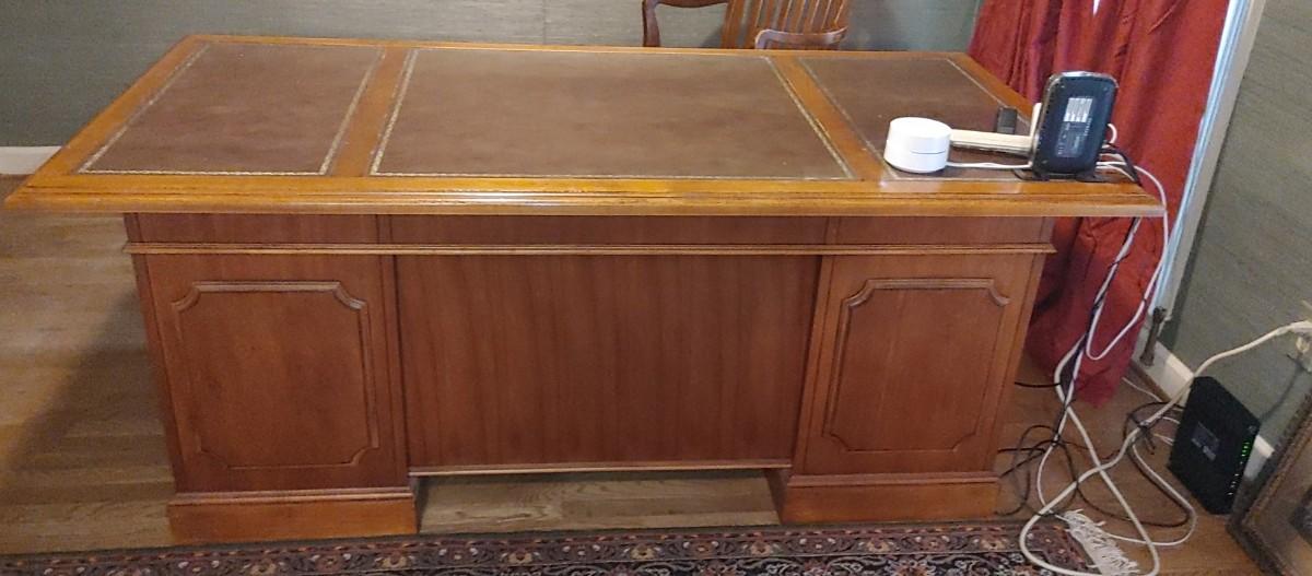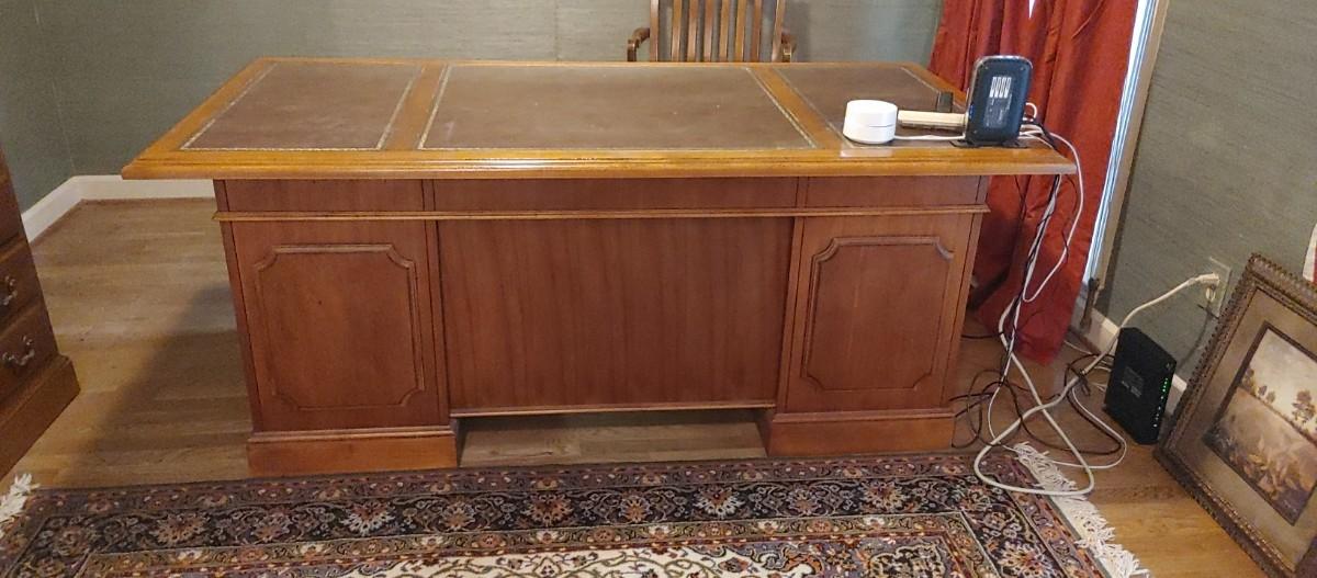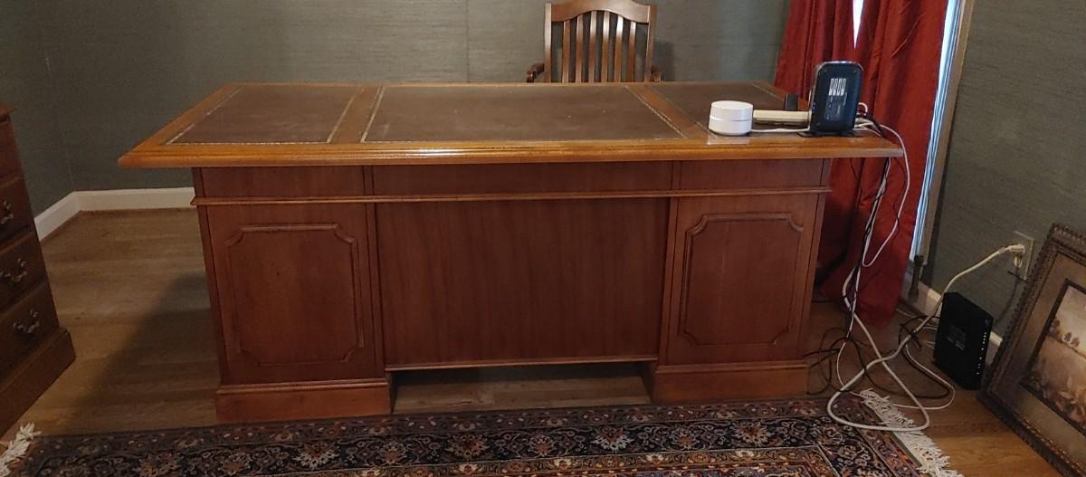 #58 Hooker Furniture Leather Top Executive Knee Hole Desk is absolutely a top of the line high quality desk. Fit for the finest office! Leather to is beautiful with slight wear to the gold design on the leather at the seating area.
