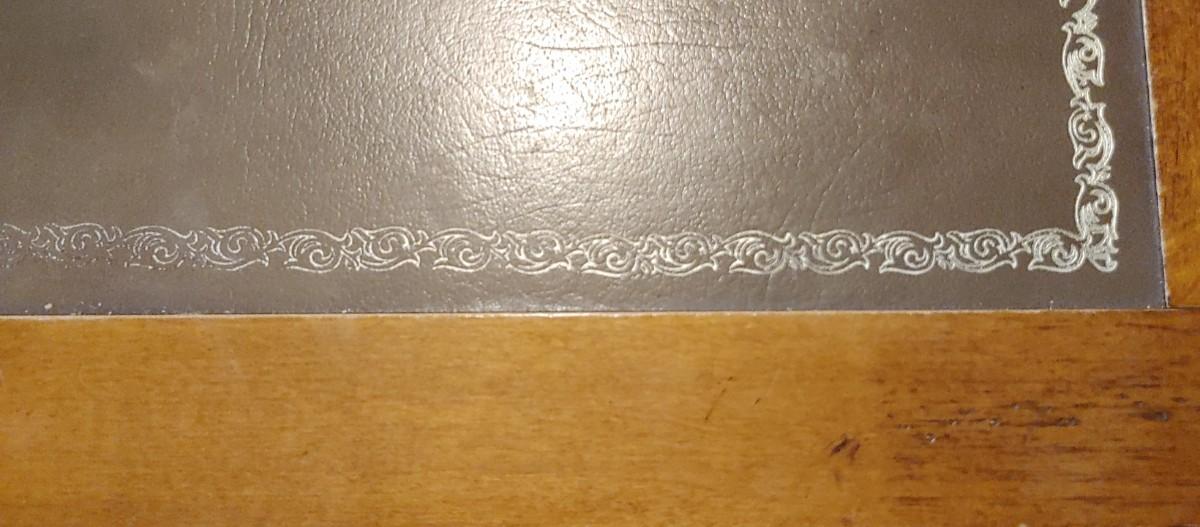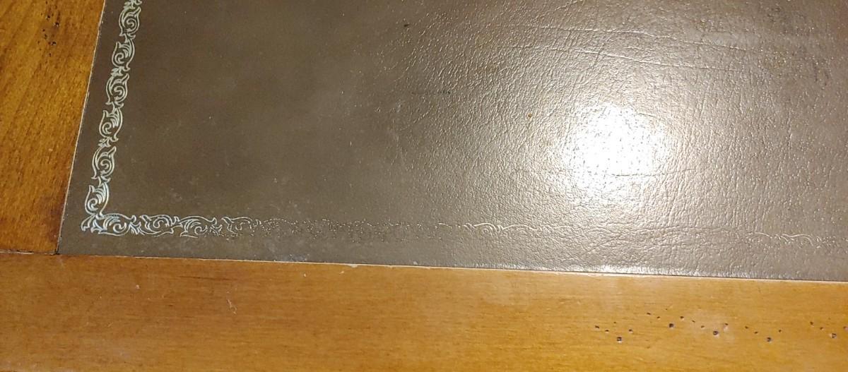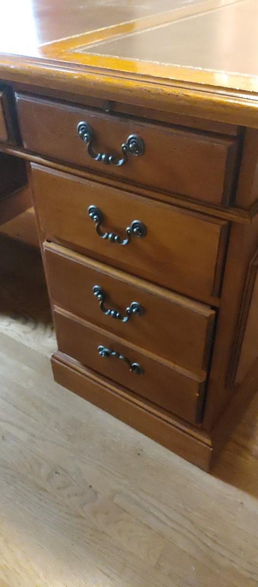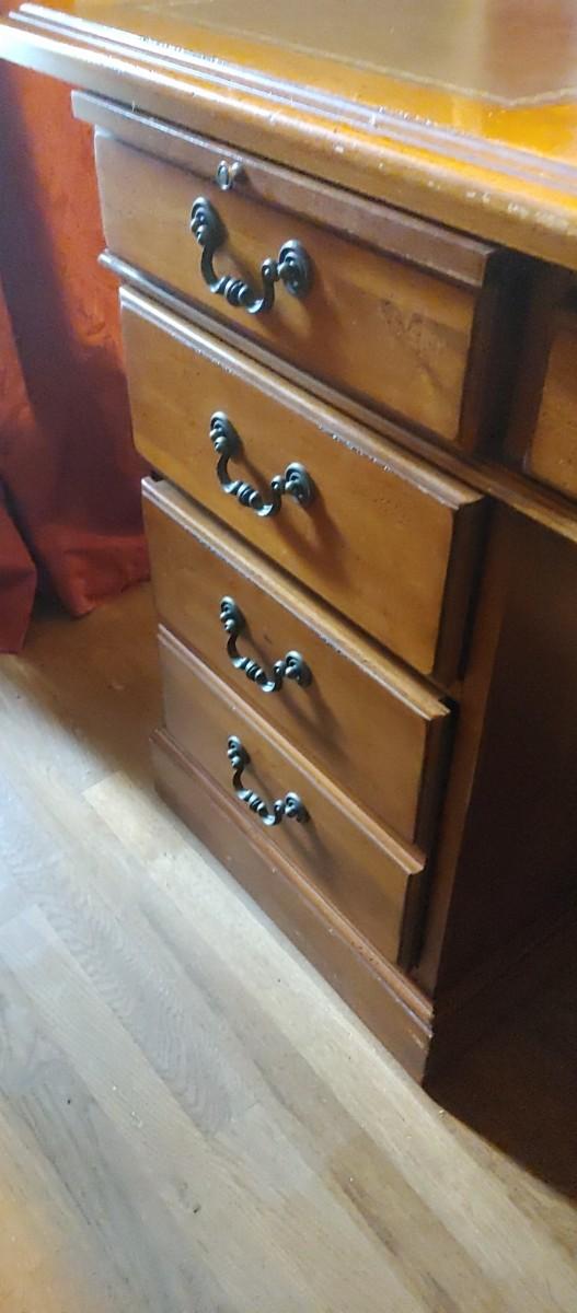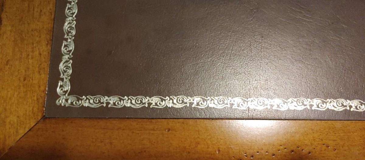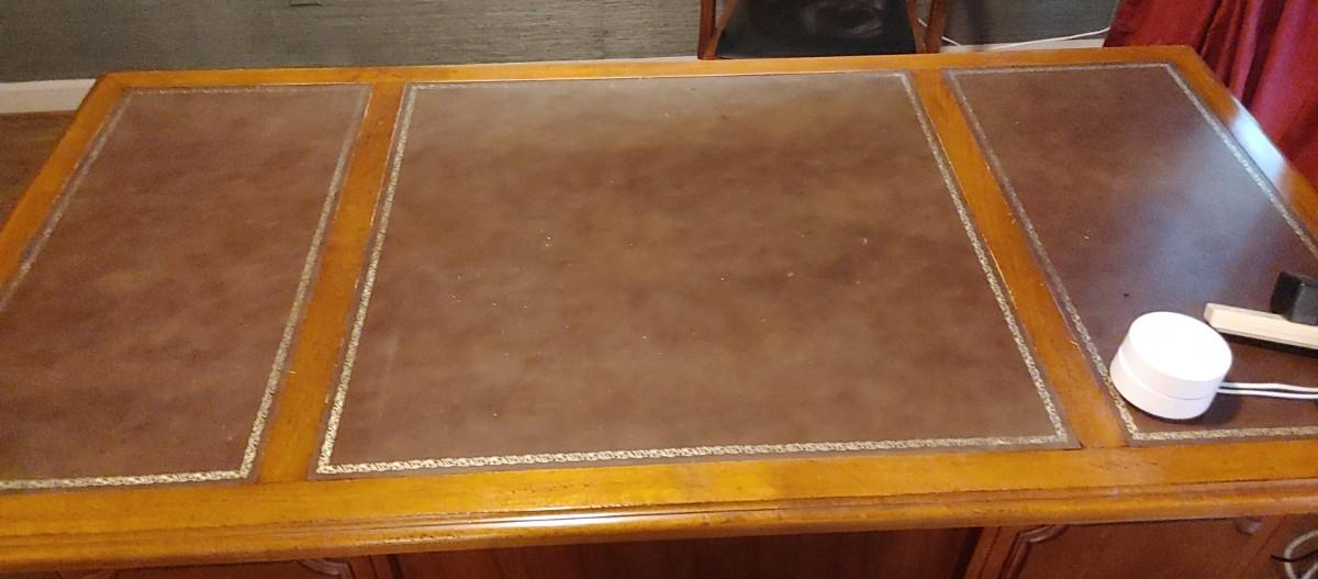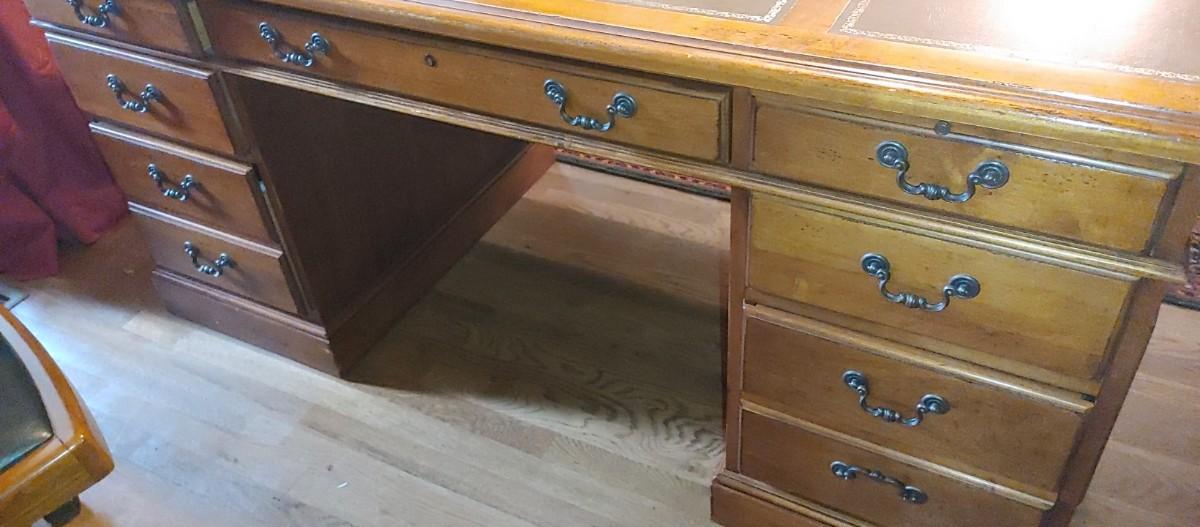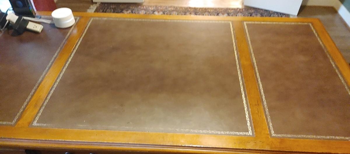 #58 Hooker Furniture Leather Top Executive Knee Hole Desk is absolutely a top of the line high quality desk. Fit for the finest office! Leather to is beautiful with slight wear to the gold design on the leather at the seating area.
