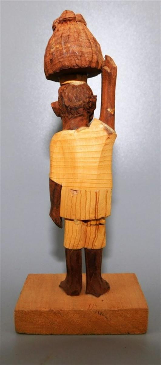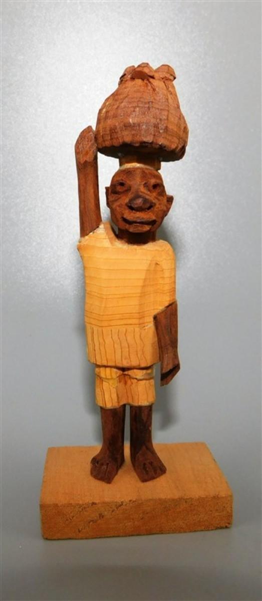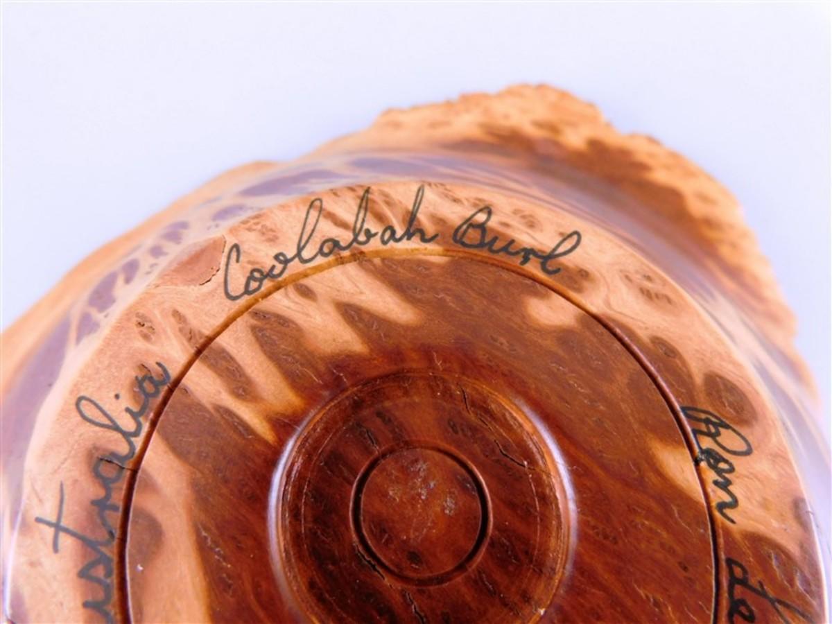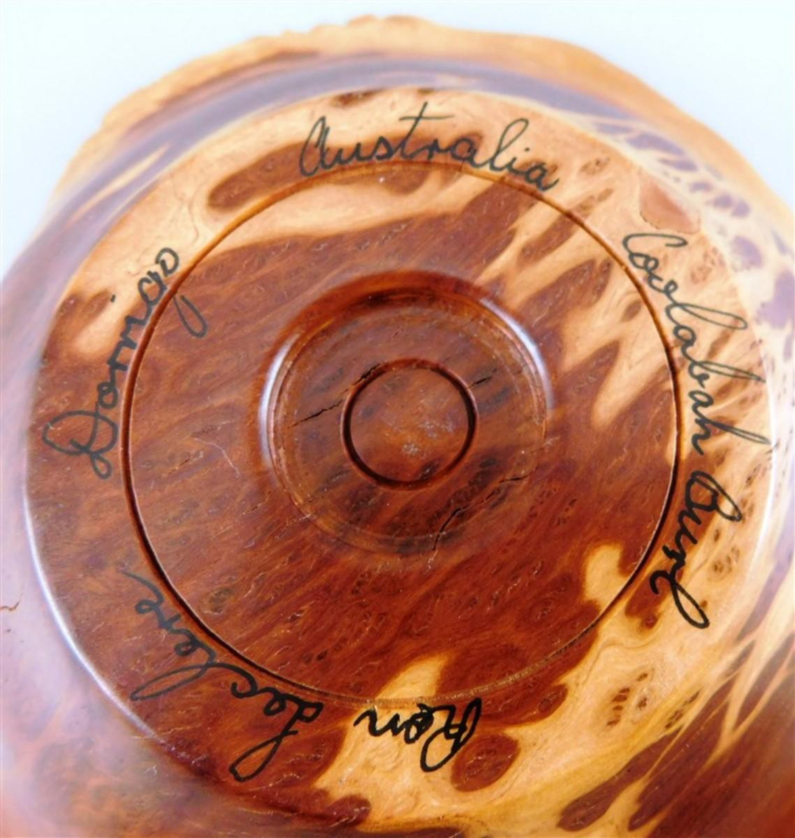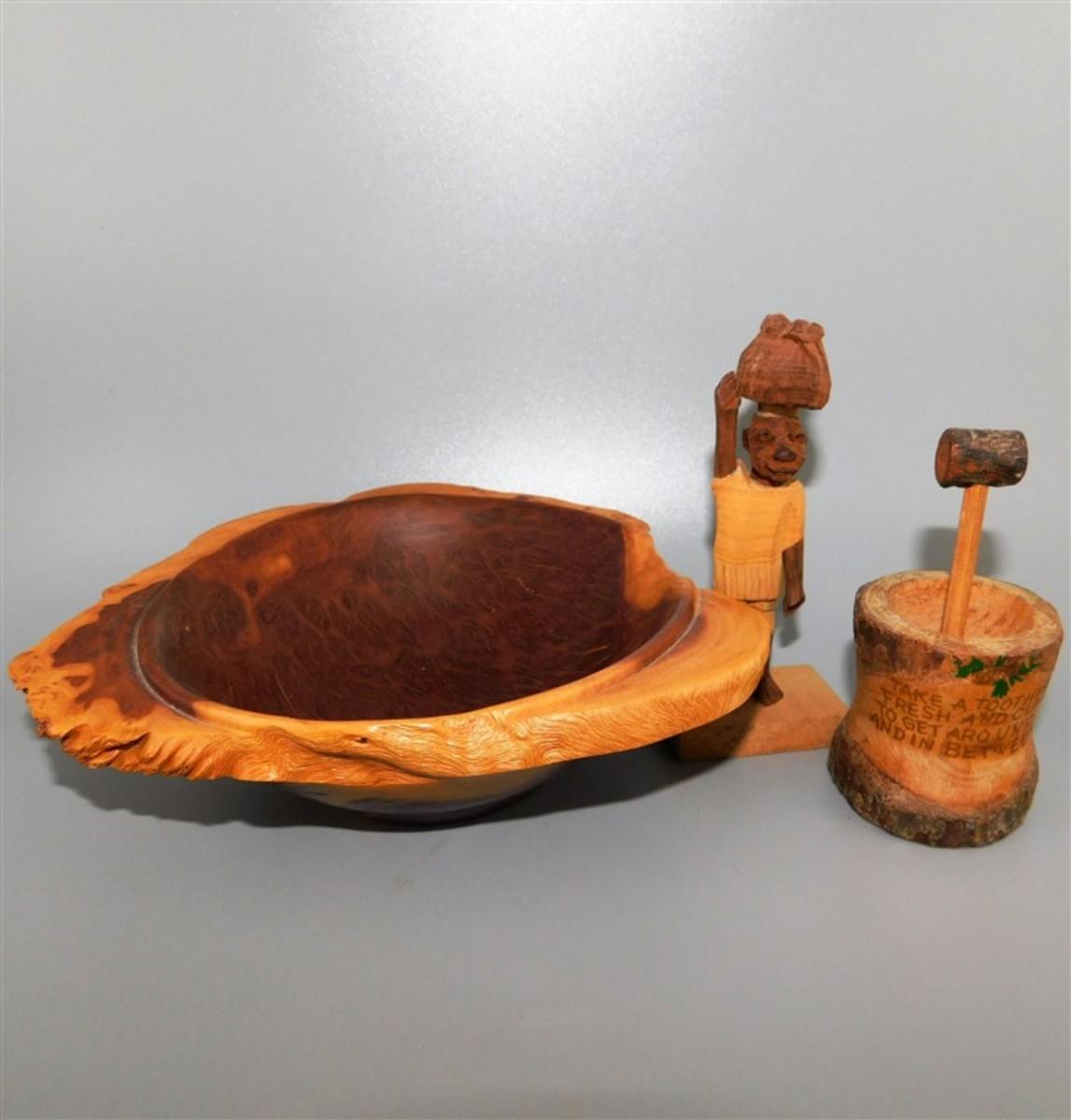 56 Lot of 3 Wood Items - Coolabah Burl Australia Bowl Ron Lecleve Derrigo / Toothpick Holder / Wooden Man Marked Nigeria 7 1/2 x 2