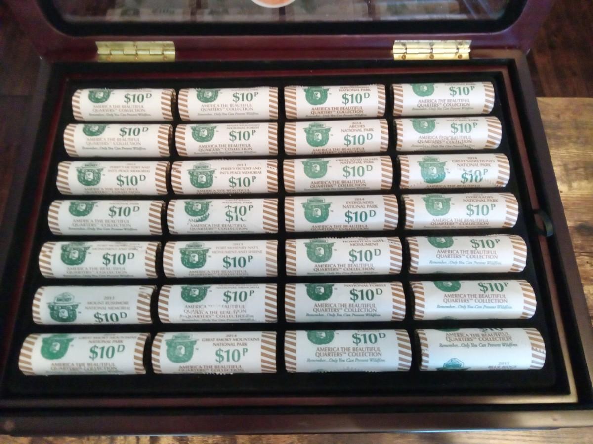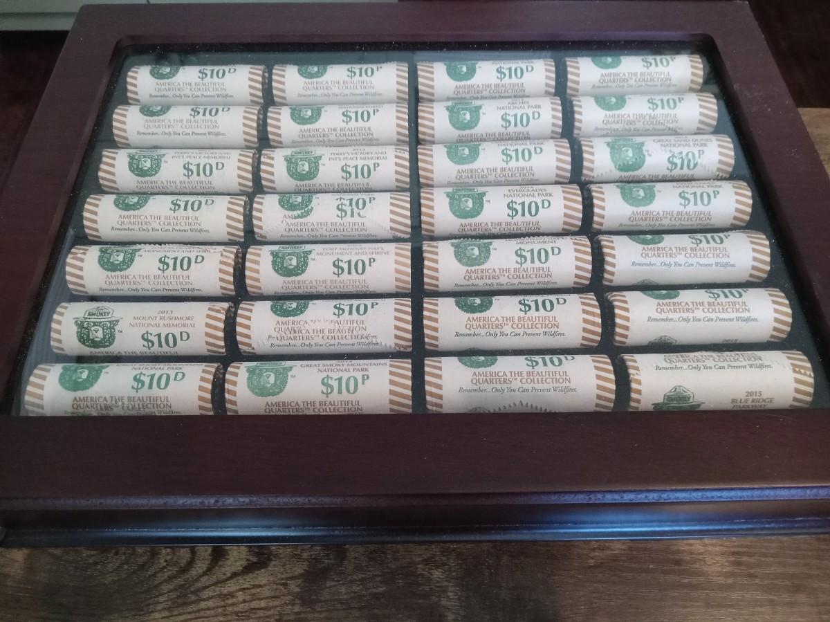 In Display Case. 2 roll layers of 28 rolls of Quarters in Display Case.