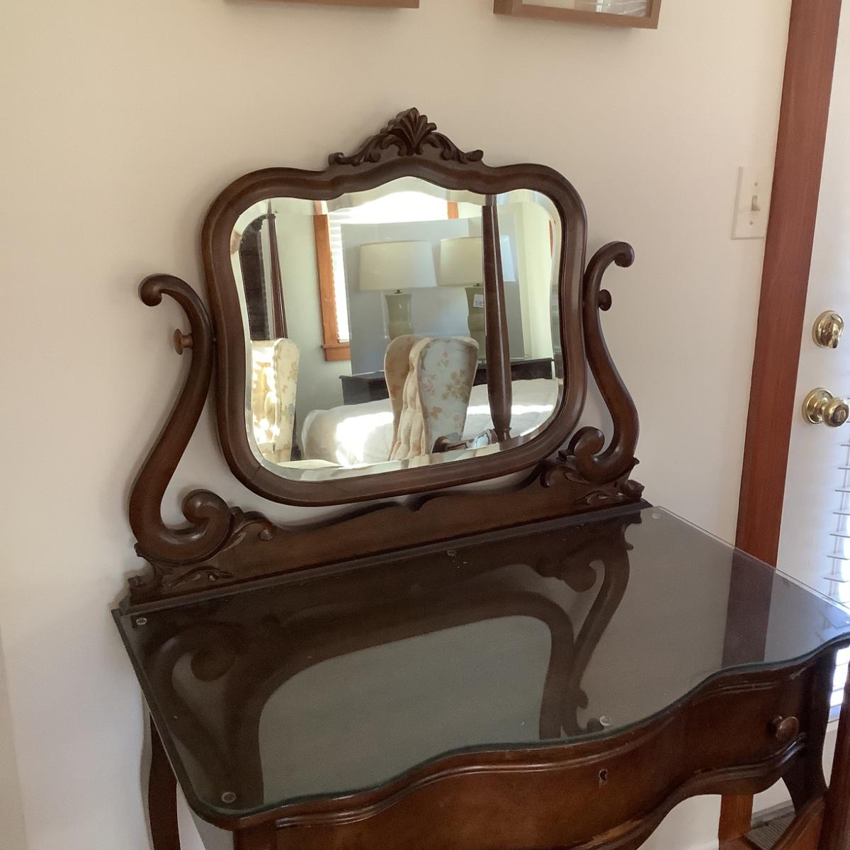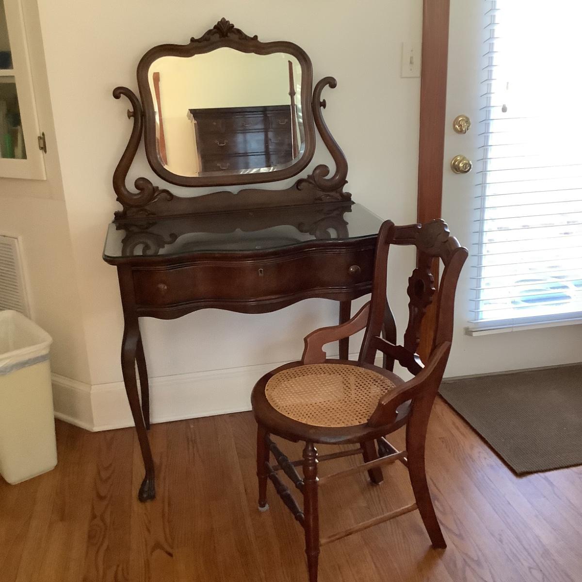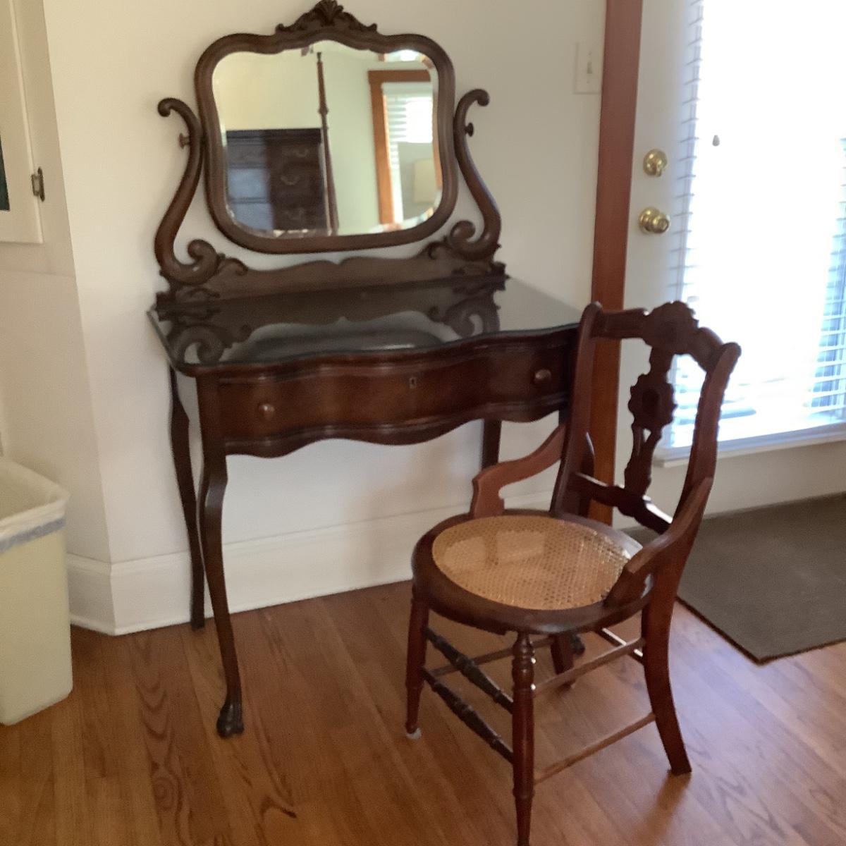 560 Antique Serpentine Glass top Vanity with Beveled Mirror and Chair