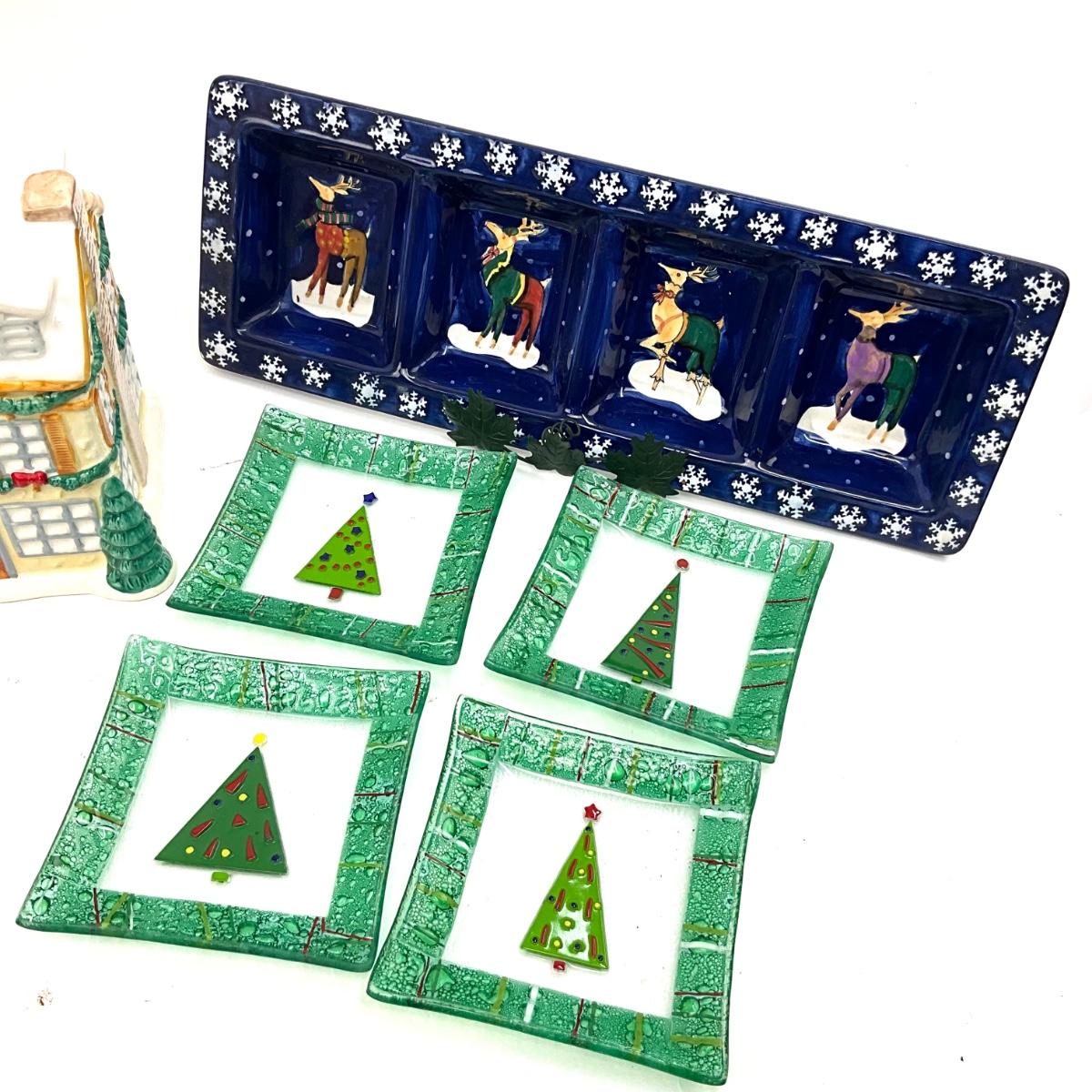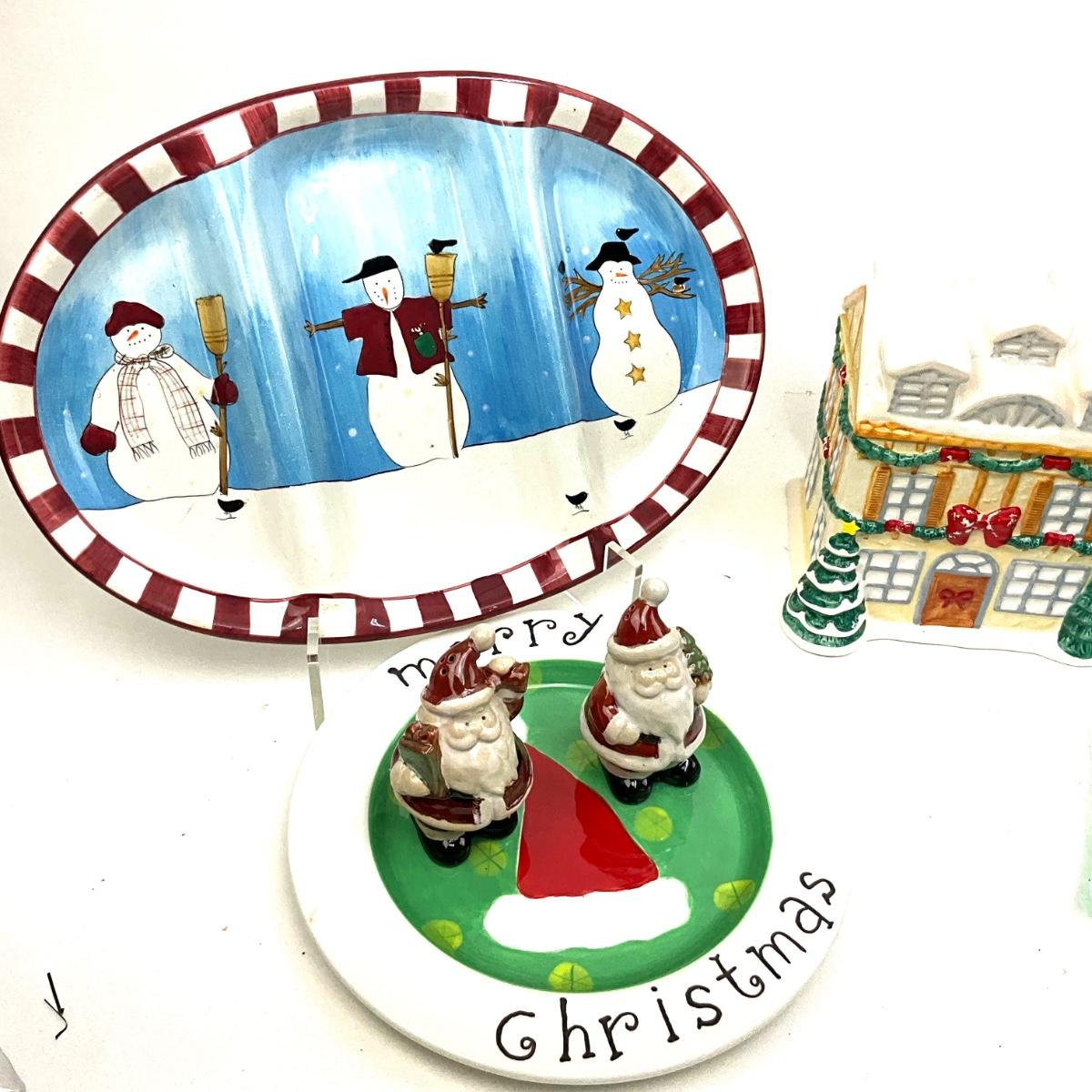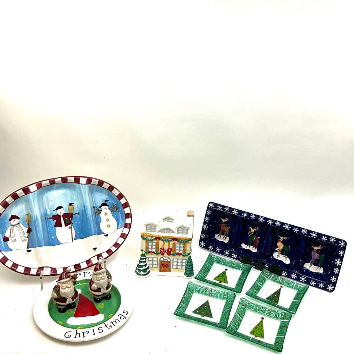 Christmas plate with salt and pepper santa, oval three section snowman serving platter , 4 green glass christmas tree plates, 4 section reindeer serving plate and house cookie jar