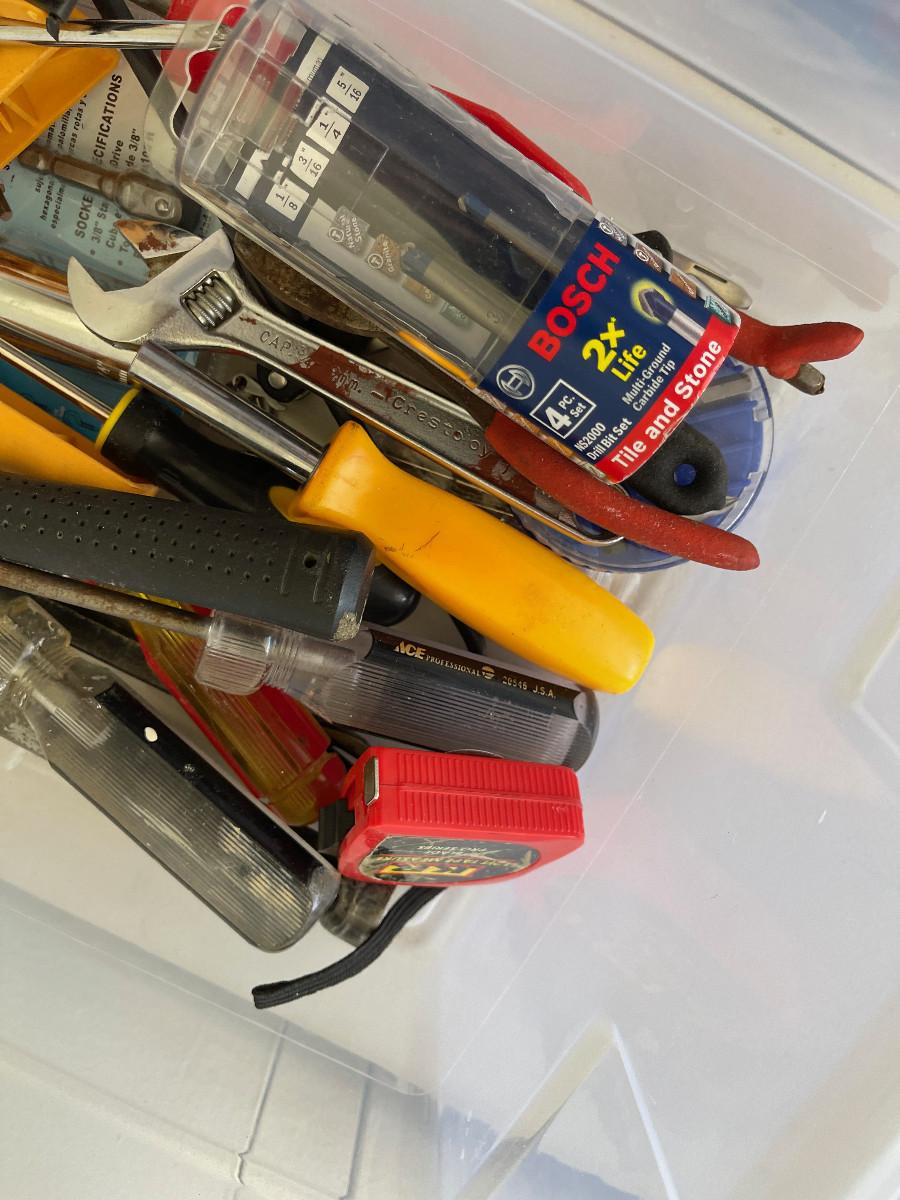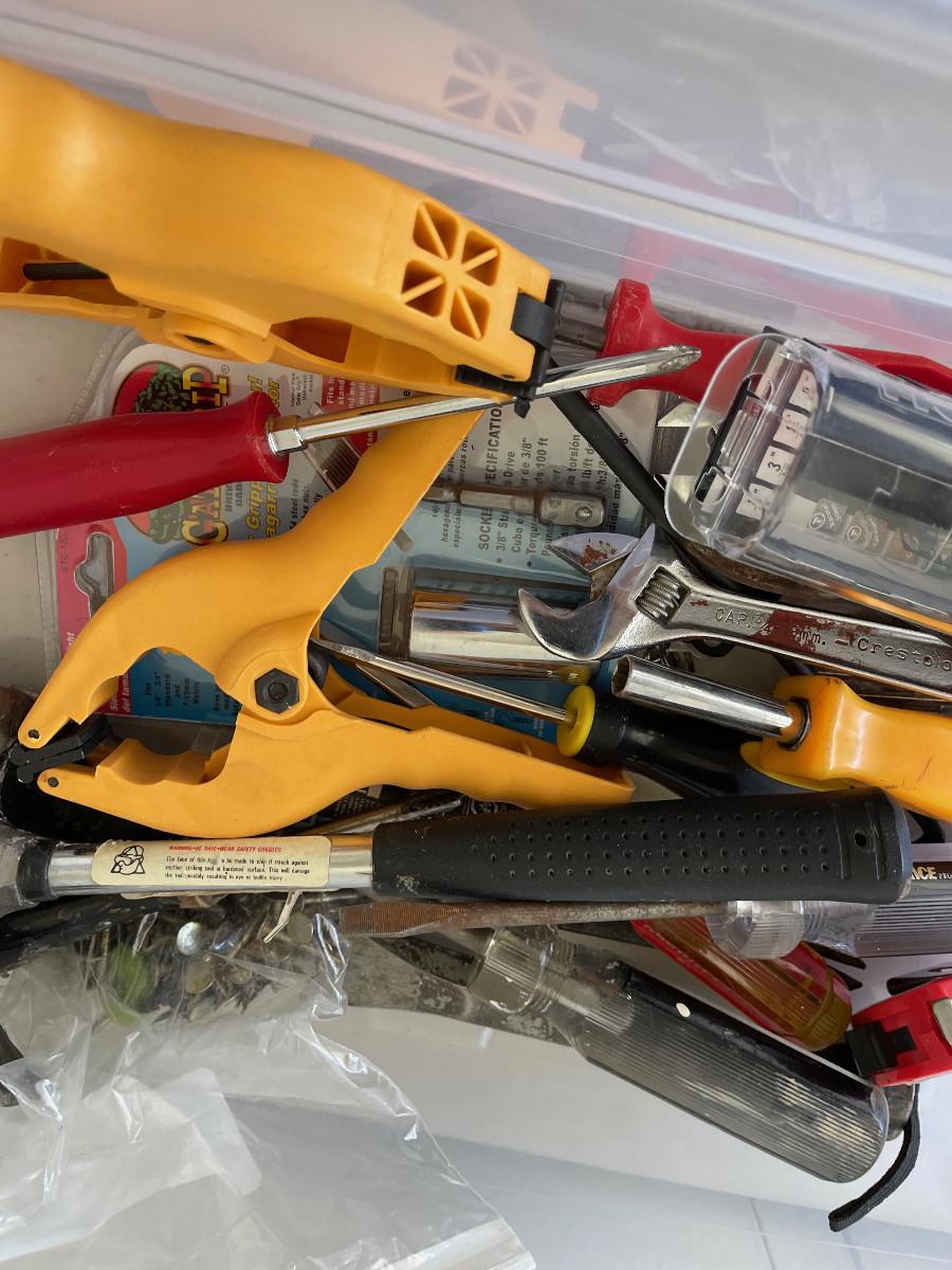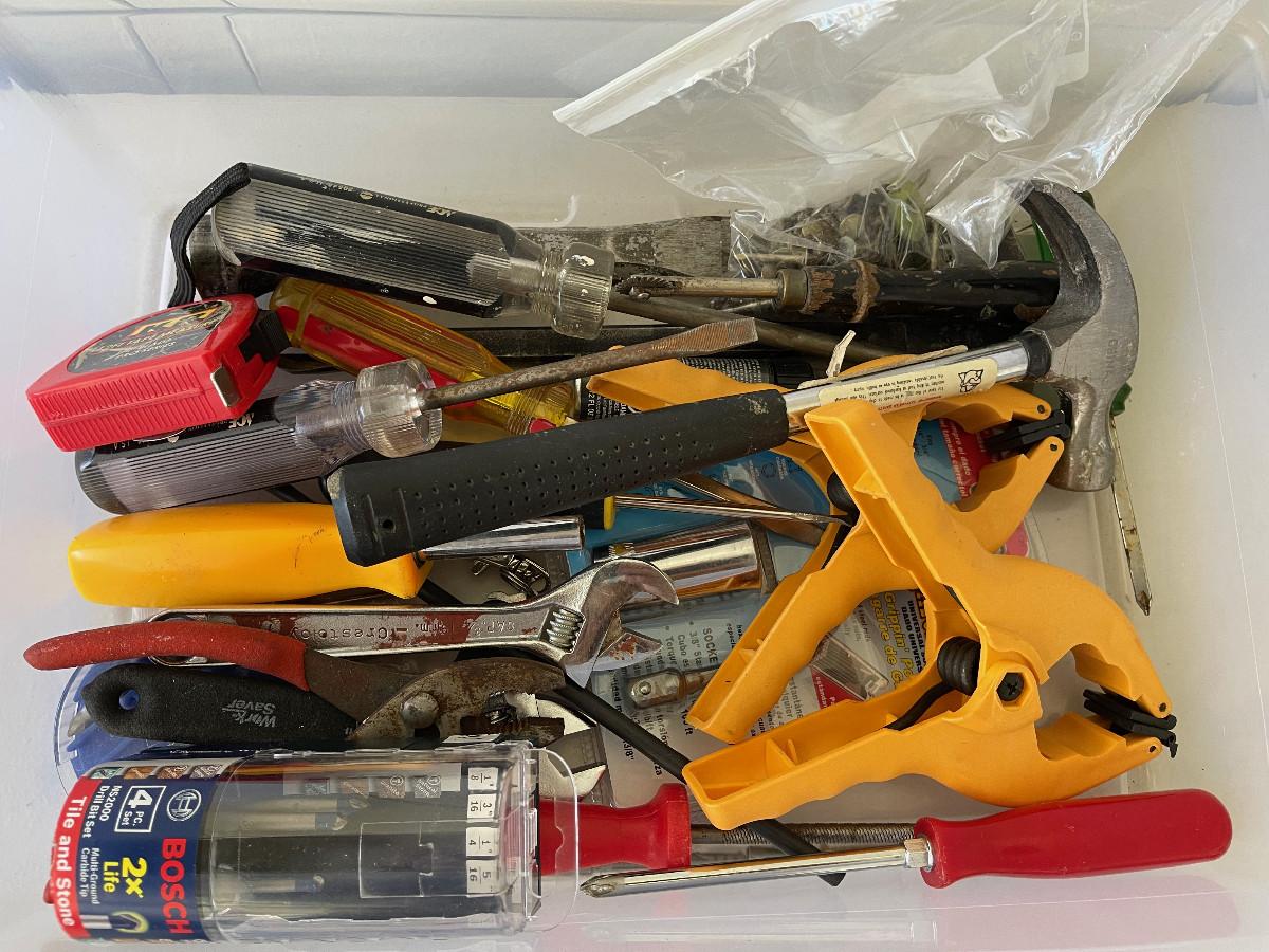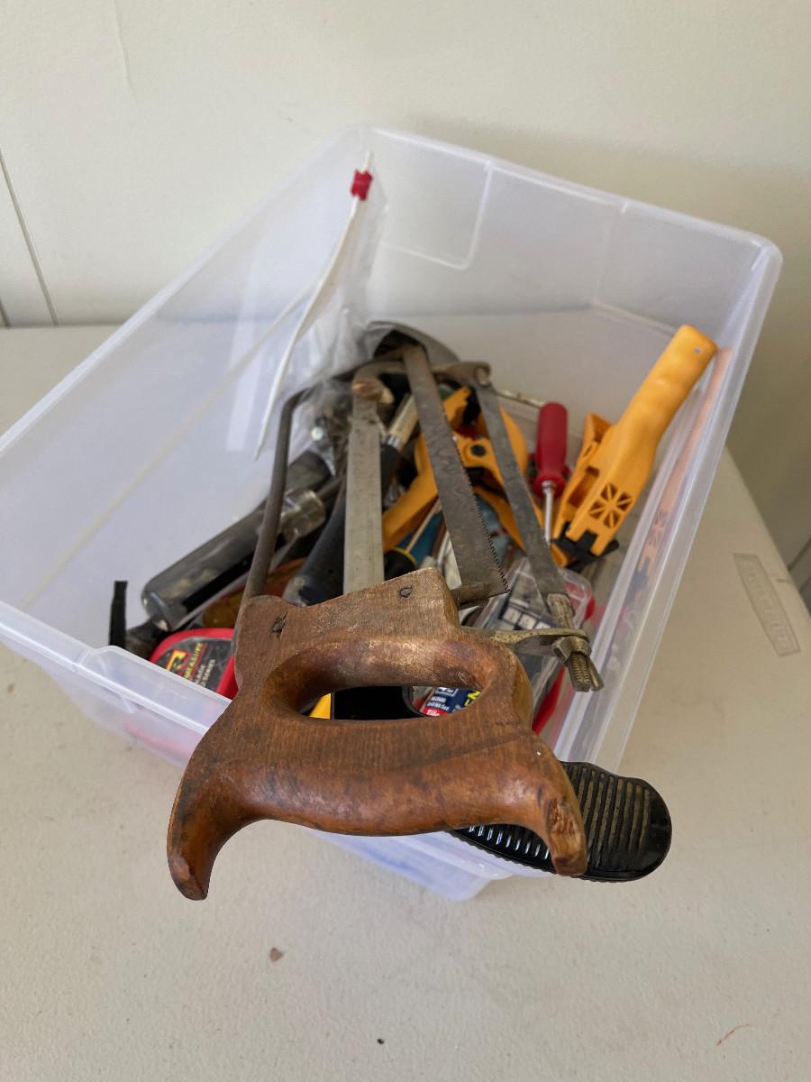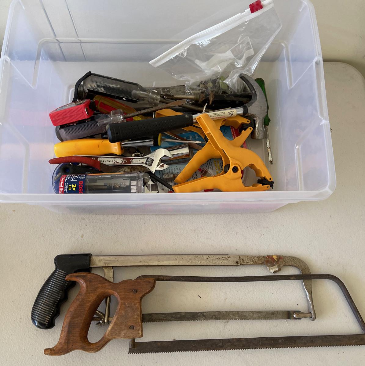 #560 Tub of Tools Screw Driver; Hack Saw, Hammer.