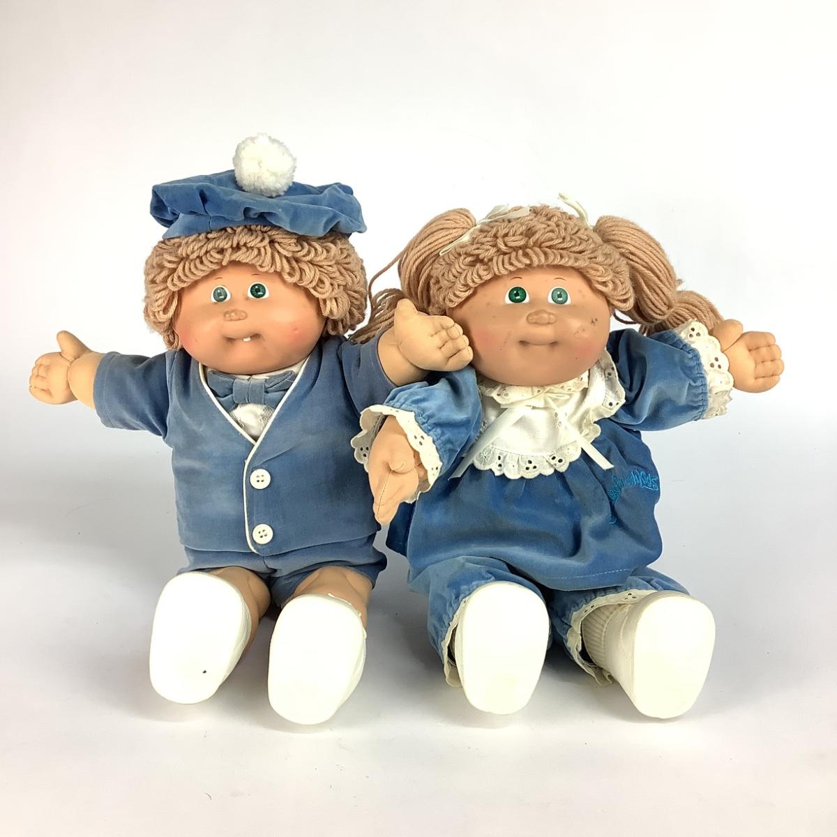 Coleco Cabbage Patch Kid dolls with hard face molds, both have blue signatures and one birth certificate.