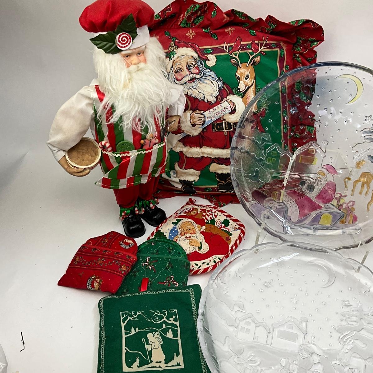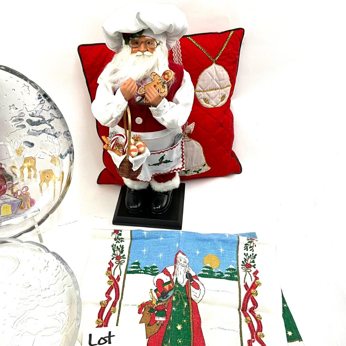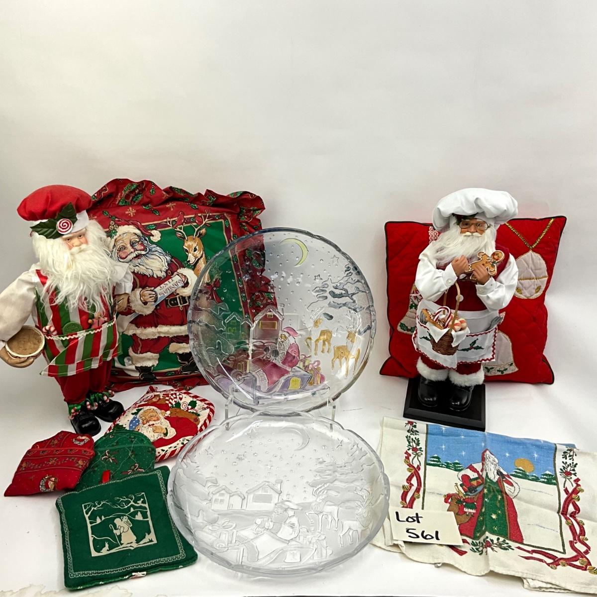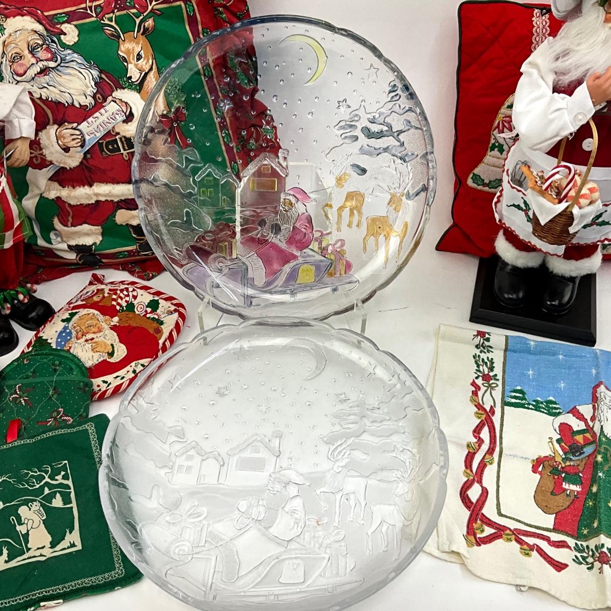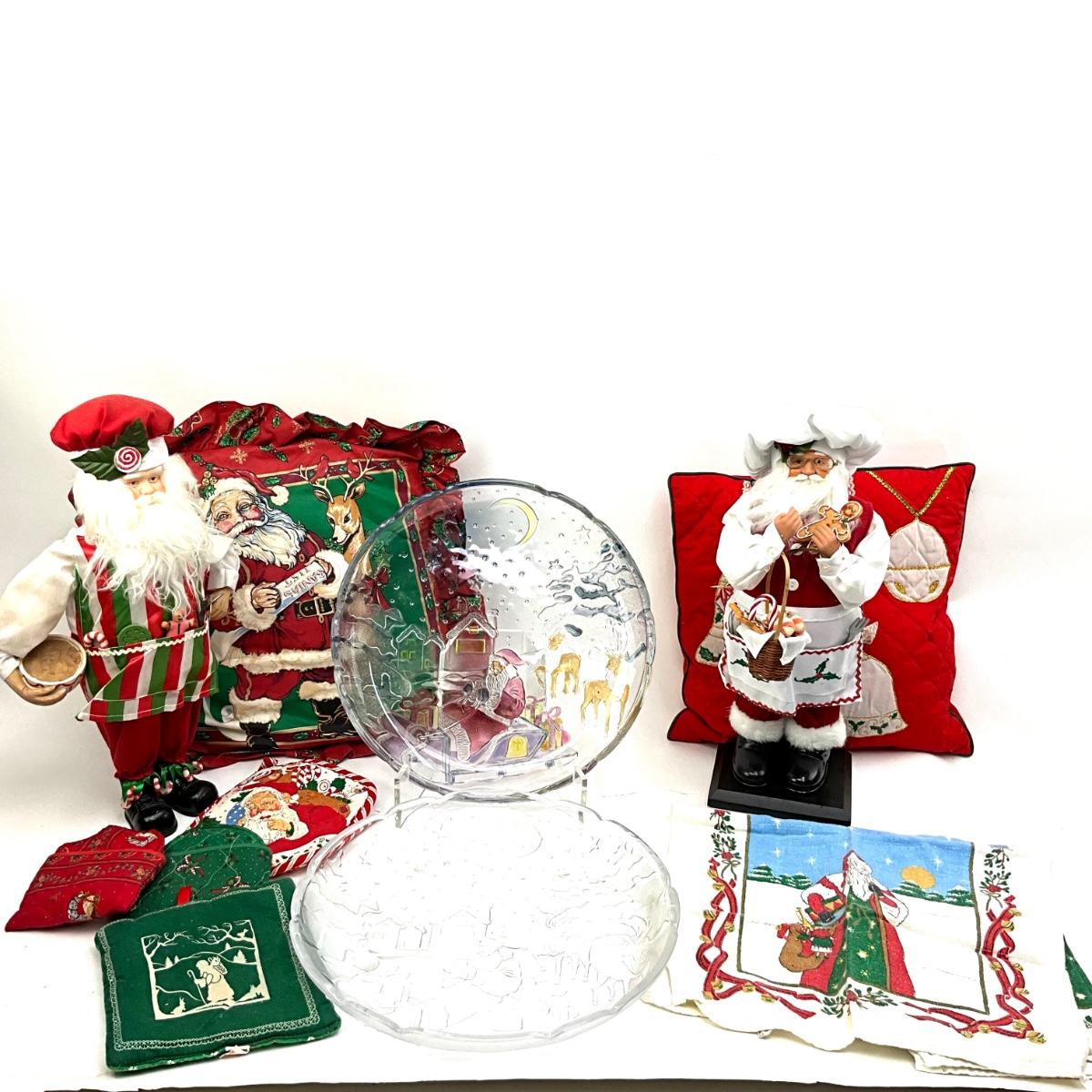 561 Santa Pillow with Two Baking Santa Figures, Linens, Glass Serving Plates