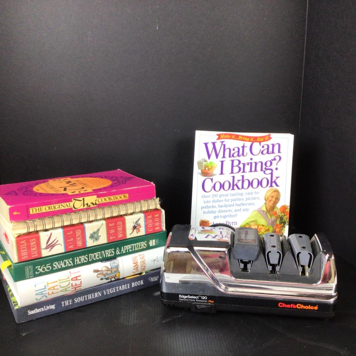 Assorted cookbooks and Edge select 120 knife sharpener.