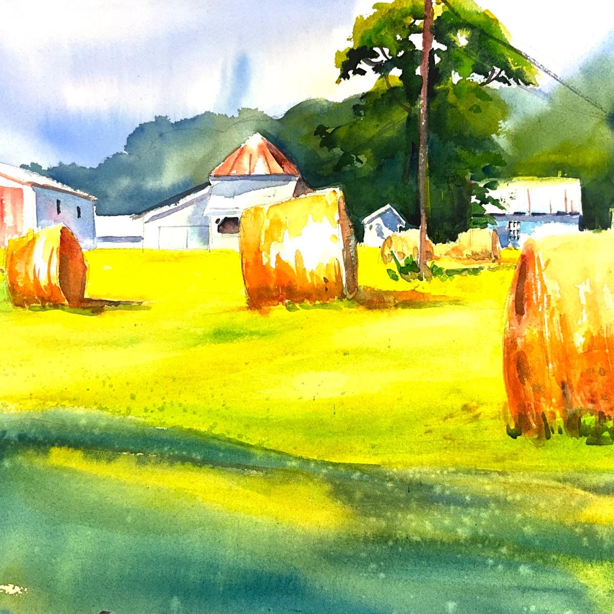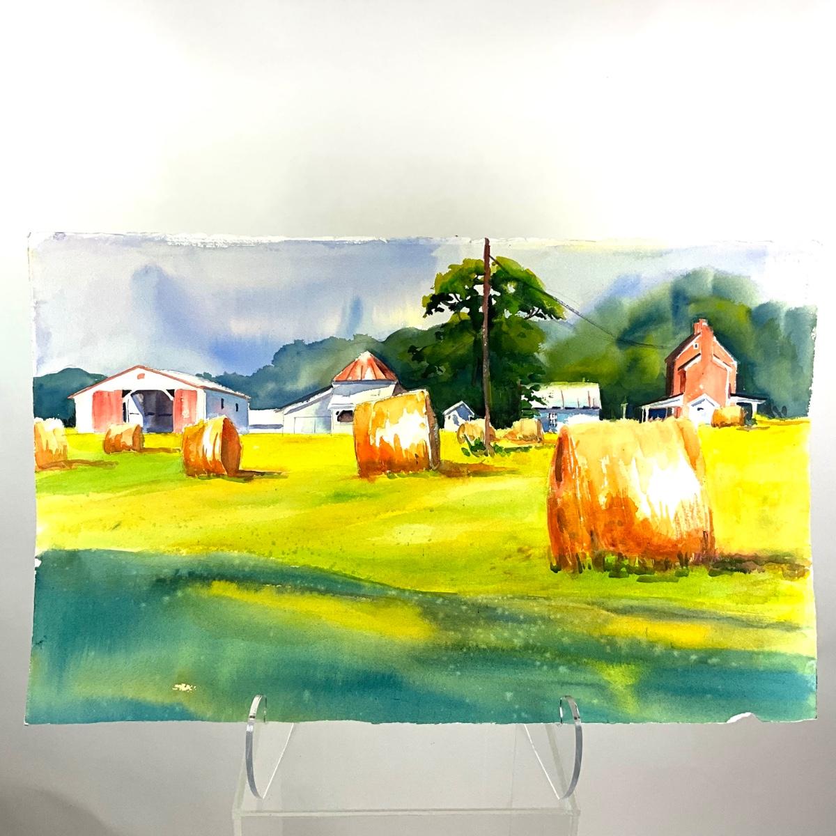 563 Original Watercolor of Hay Bales on Farm by Peggy Blades
