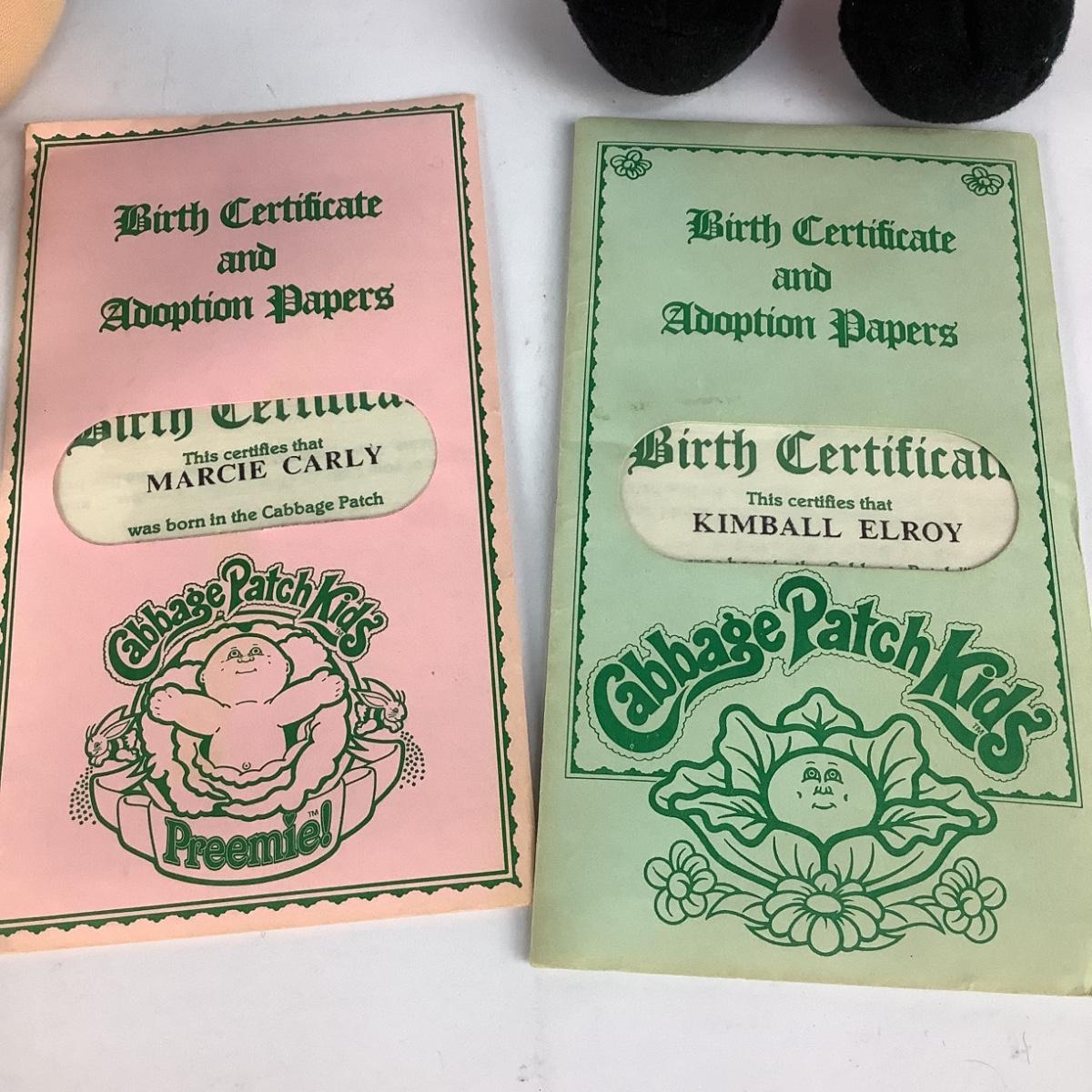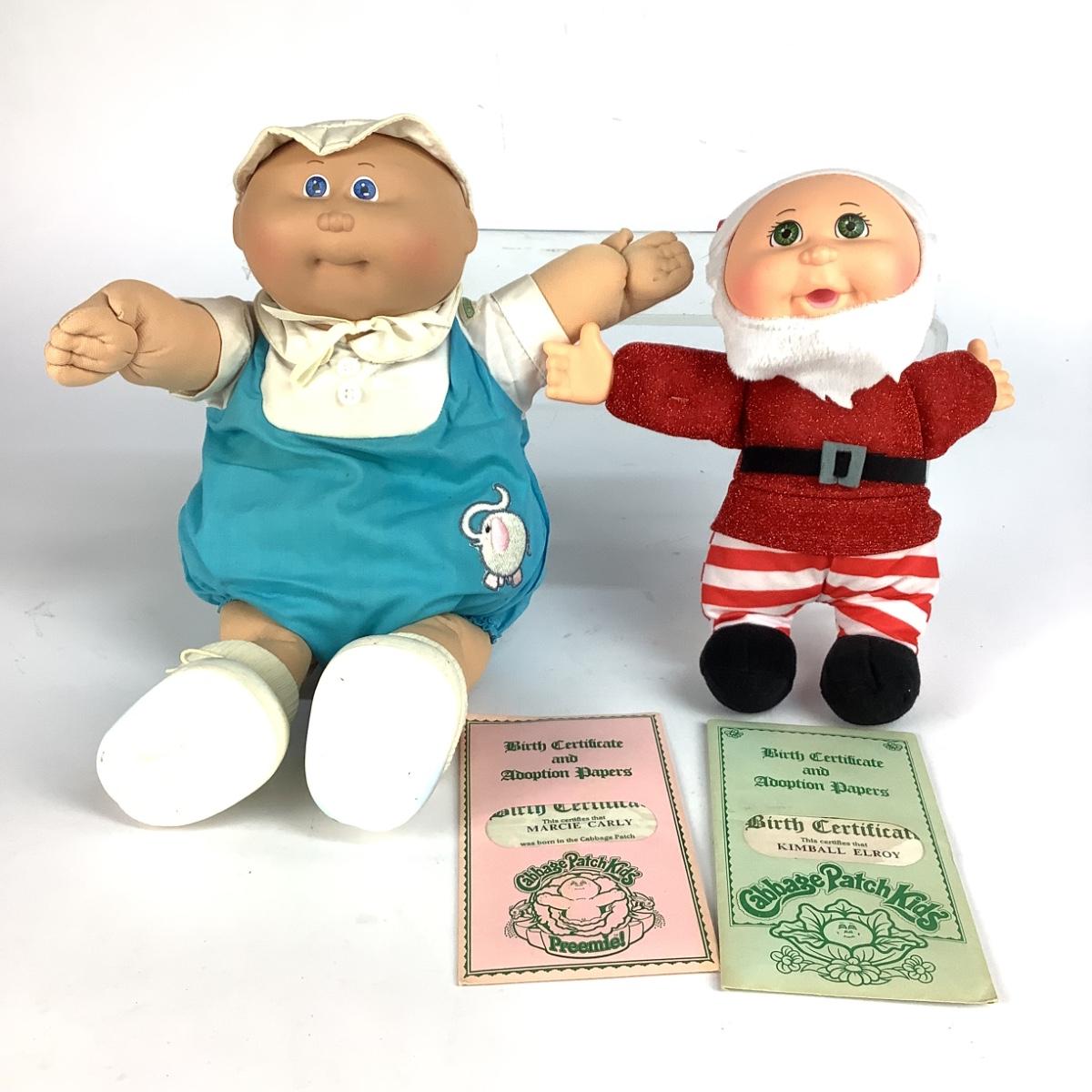 Coleco Cabbage Patch Kid and Holiday Collectible Cutie Helper dolls with hard face molds, black signature and two birth certificates.