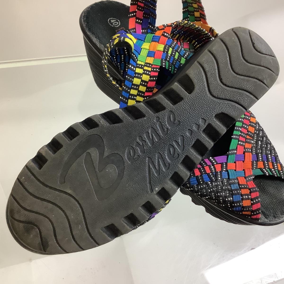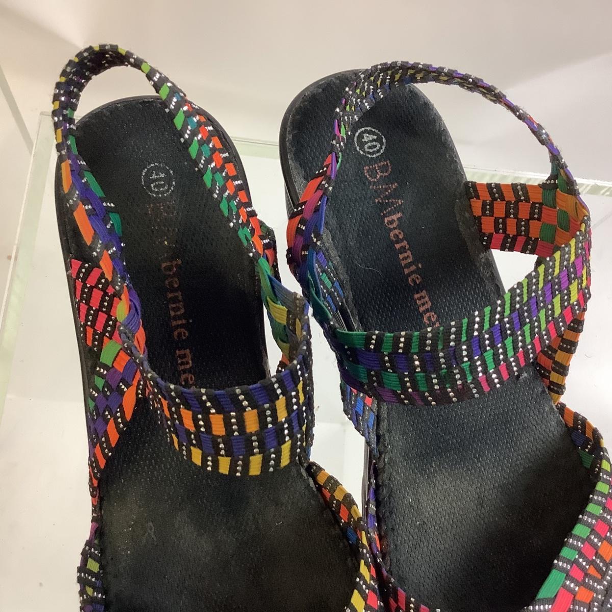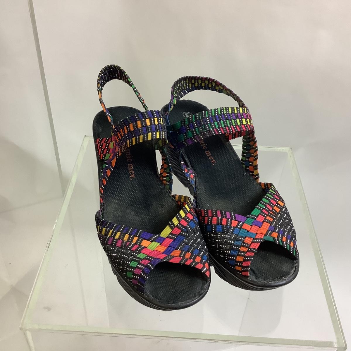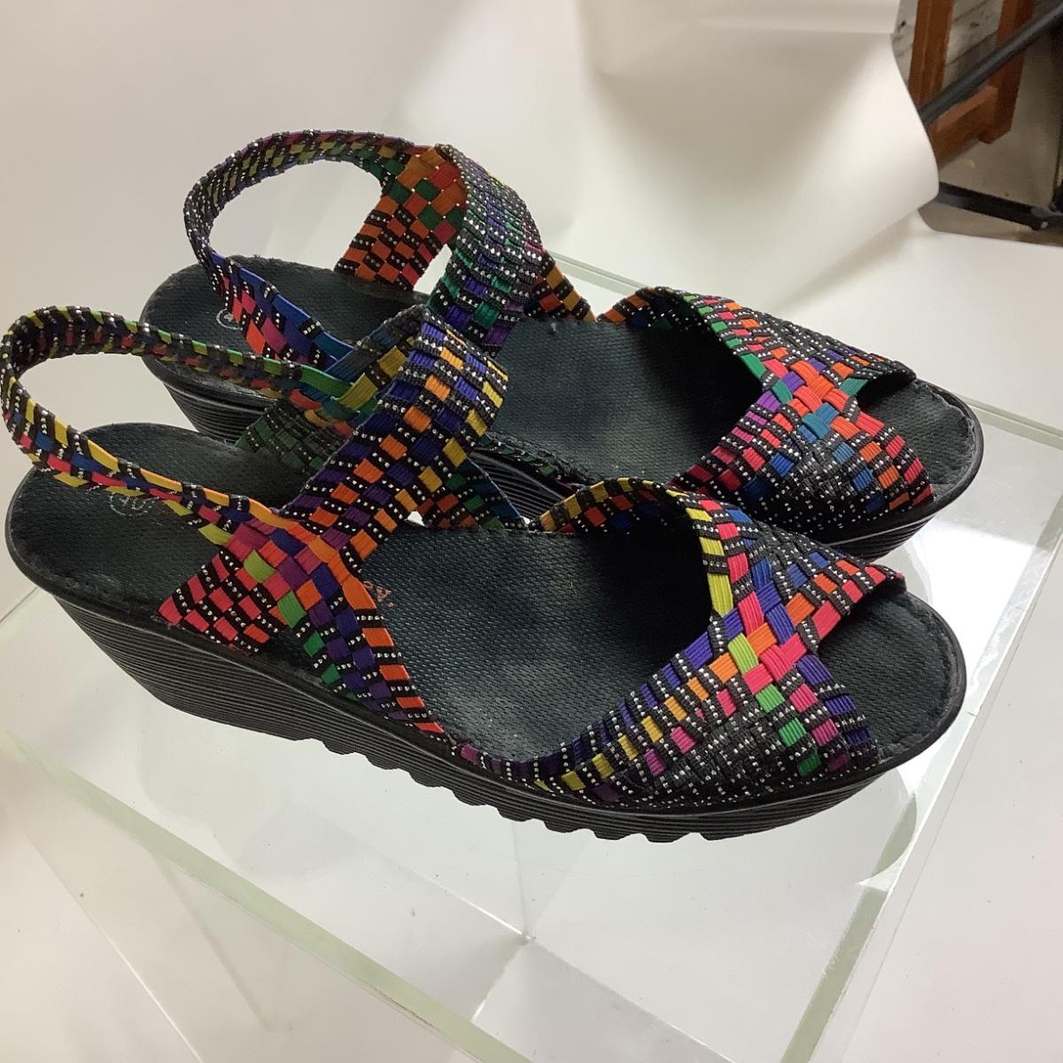 Sandals are size 9, elastic multicolor stitched, slip on style with wedge heal.