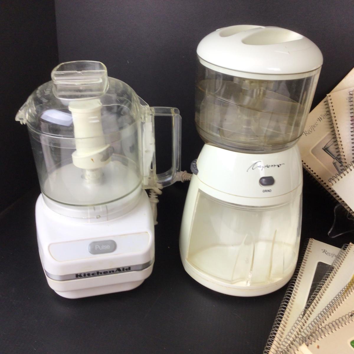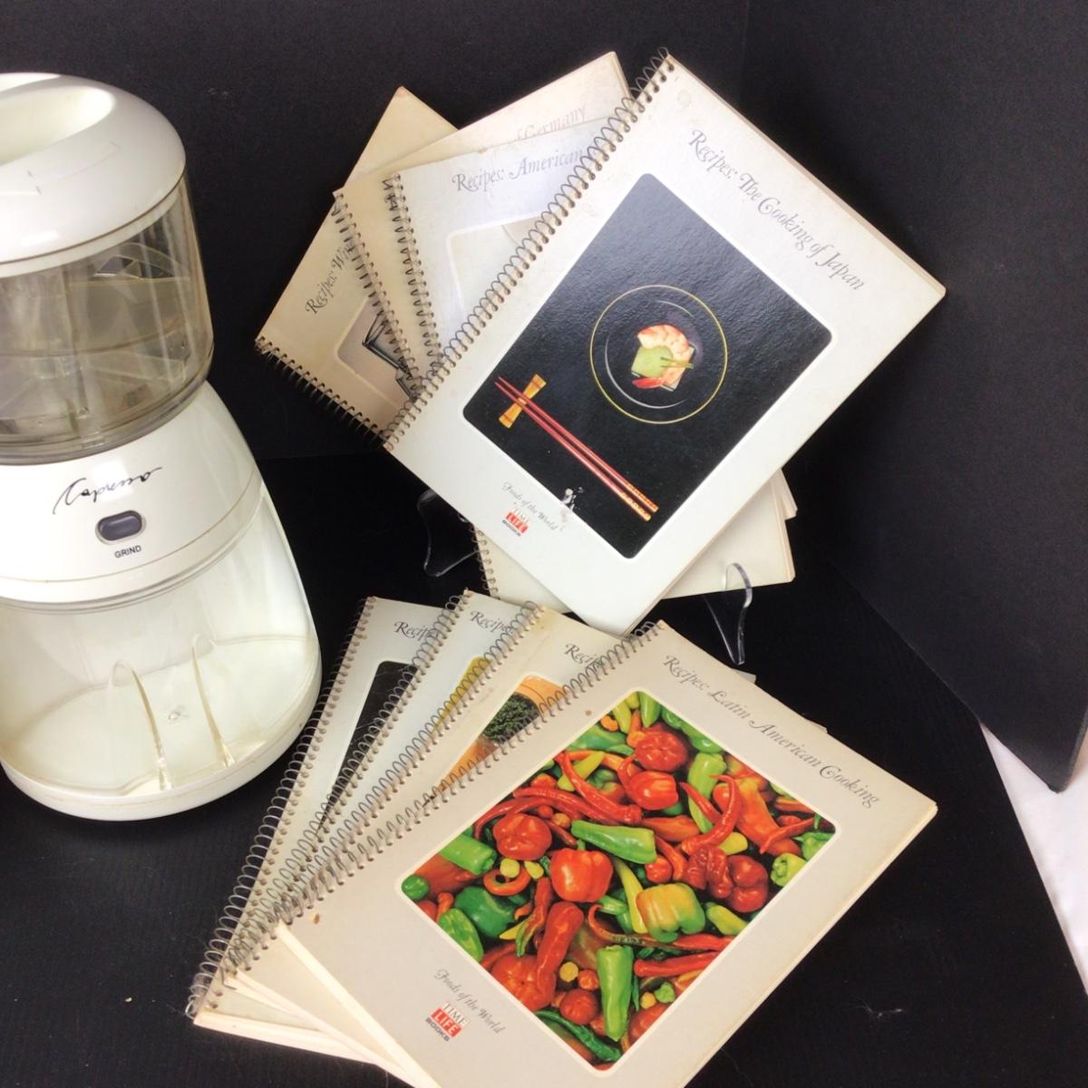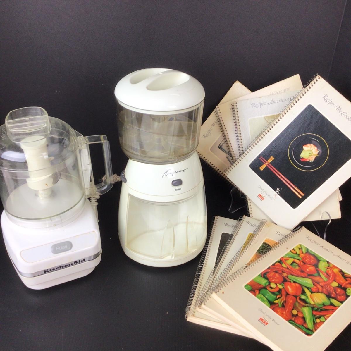 Kitchen Aid food chopper, Capresso coffee bean grinder and assorted Time cookbooks from around the world.