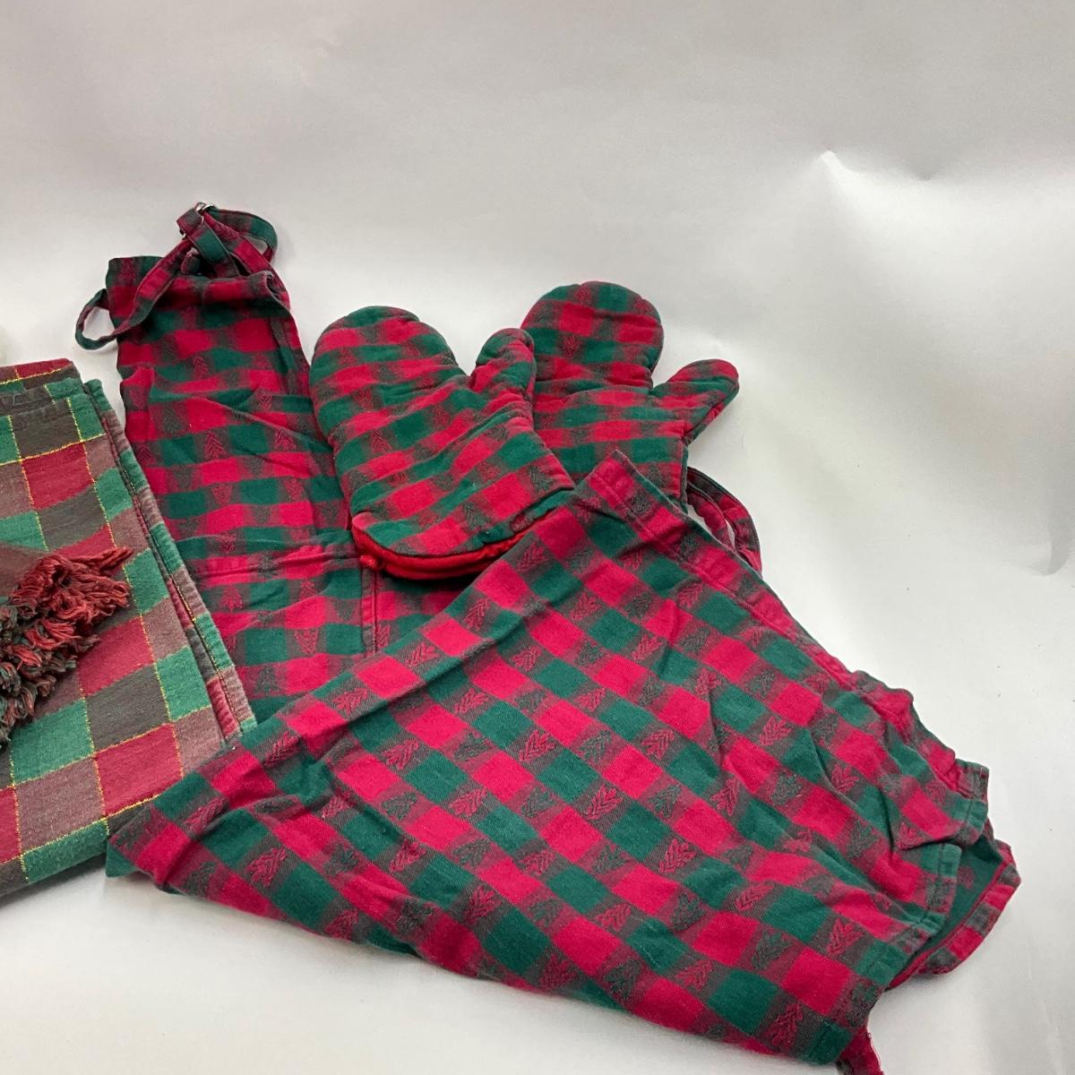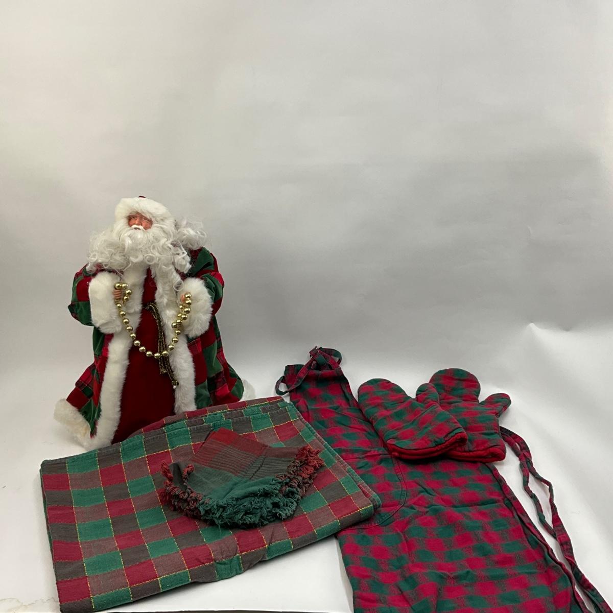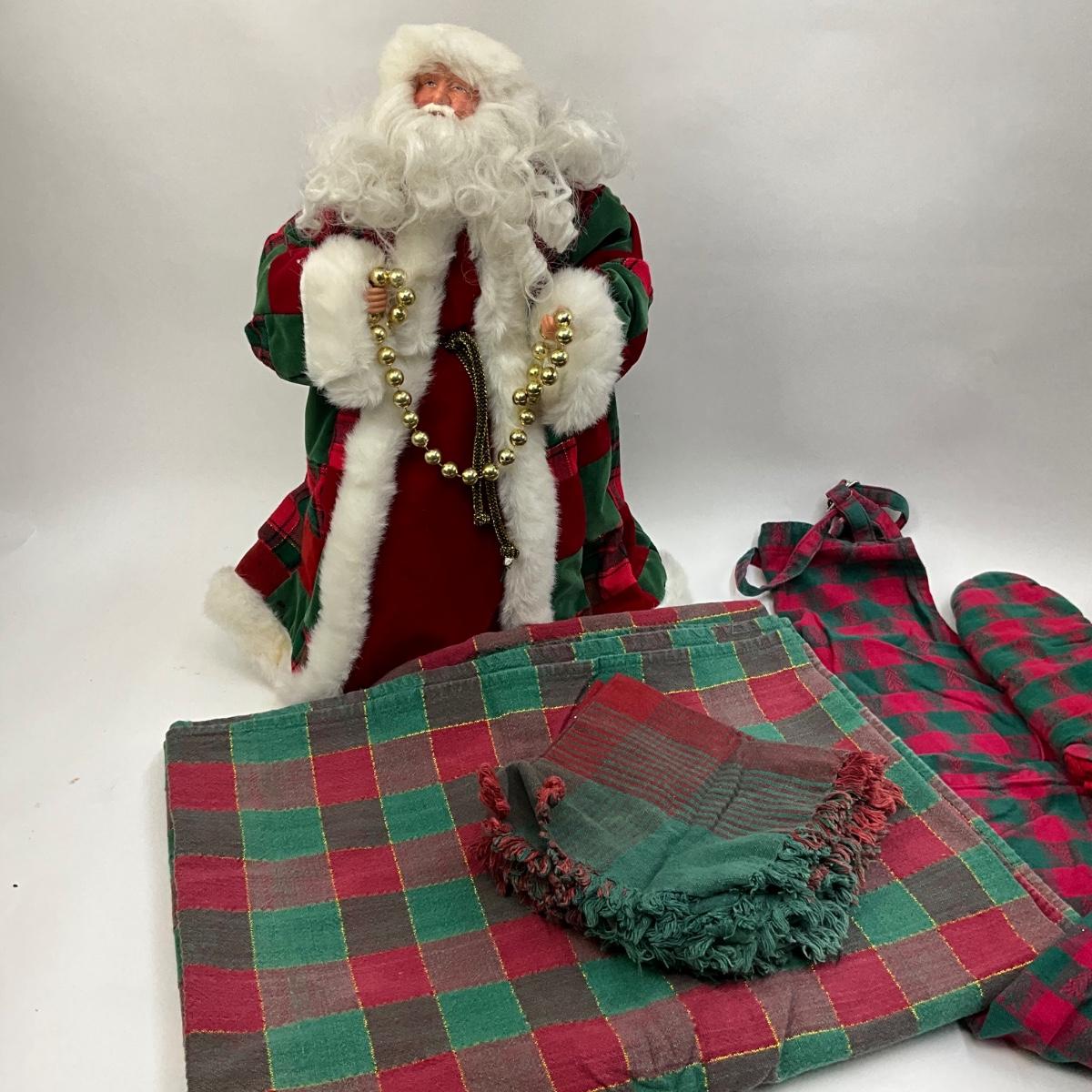 567 Lot of Red and Green Check Linen Lot with matching Santa Figure