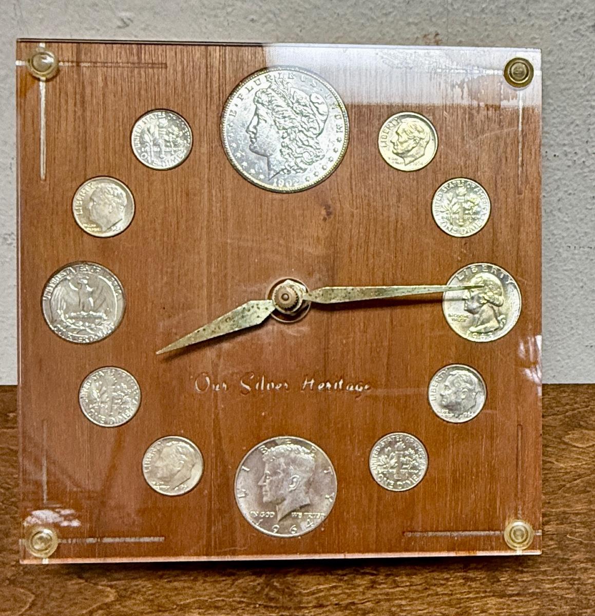 Vintage Our Silver Heritage Clock 1964 Silver Coins Morgan Dollar