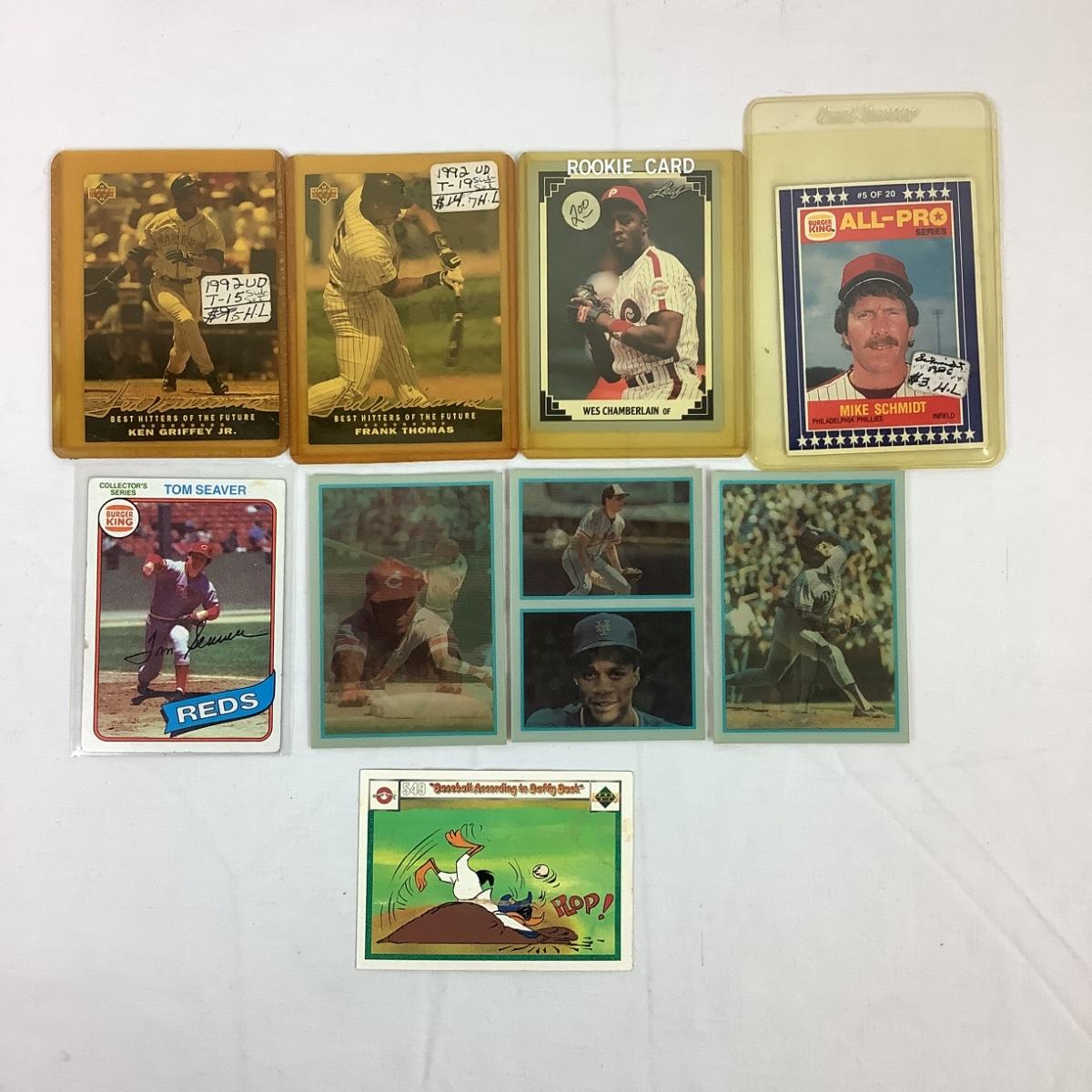 Assorted Lot of Baseball Cards 1986 Sportflics #43, 47, 48. 1991 Leaf Wes Chamberlain #178, 1986 BK Mike Schmidt #5-20, 1980 BK Topps Tom Seaver #10, & Daffy Duck "Baseball According to Daffy Duck" #549 & 2 other Upperdeck Baseball Cards.