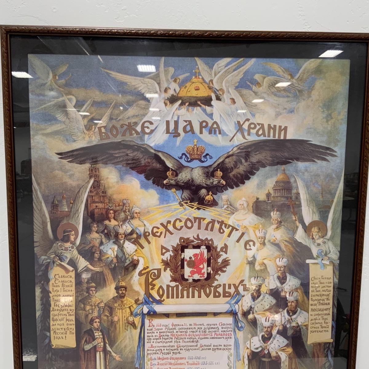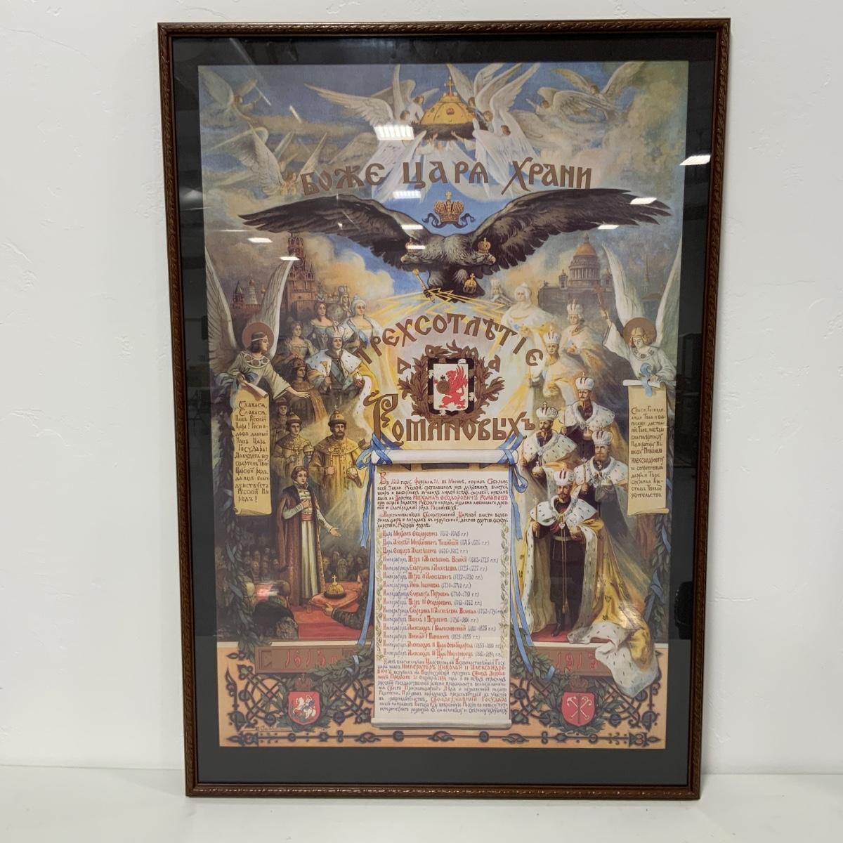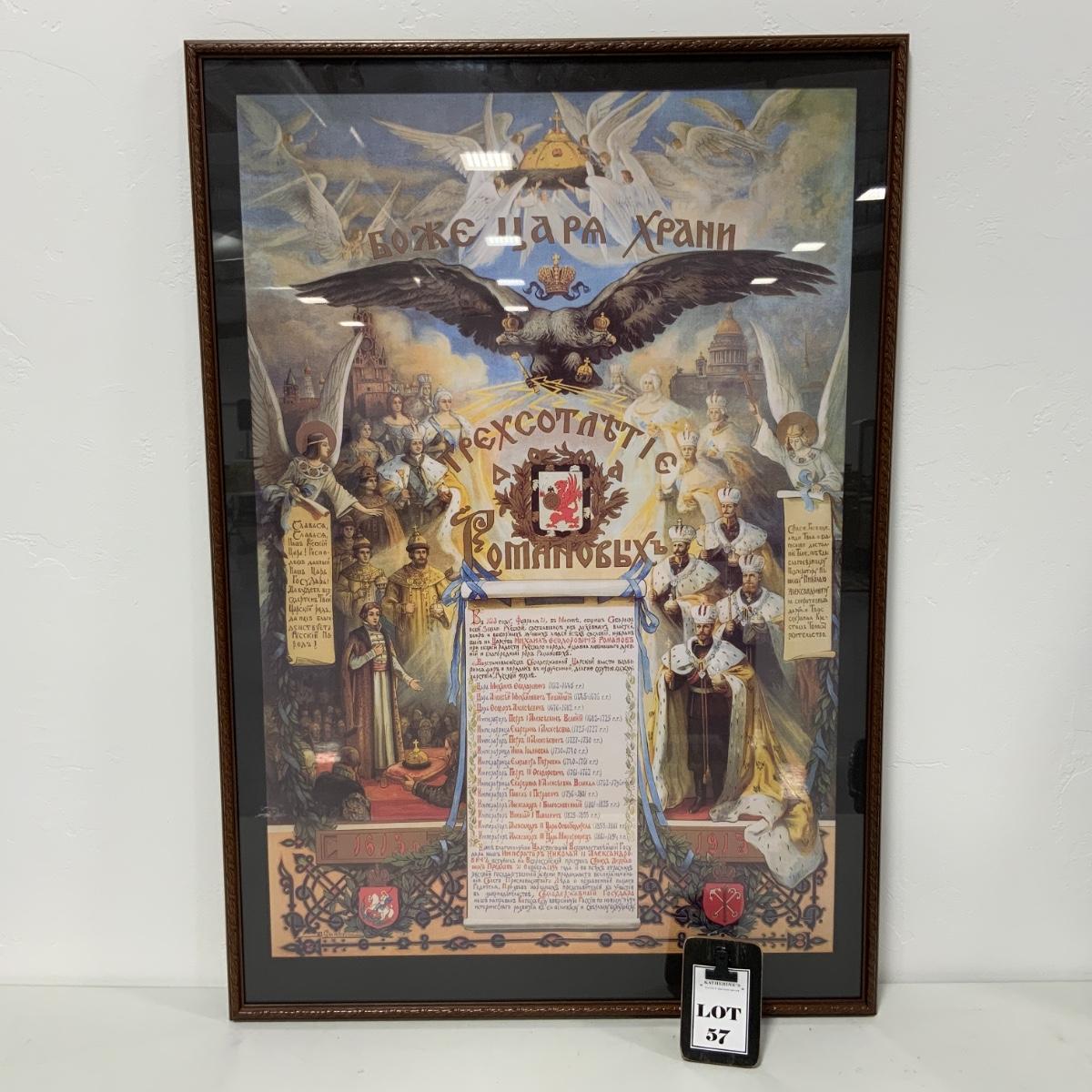 From the Estate of Peter Radovanovich: Framed Russian Poster “ God Save the Czar” reproduction. Originally printed in 1913 this poster commemorates the three-hundredth anniversary of the Romanov dynasty's rule over Russia. Each of the Czars are pictured amongst angels and other pieces of symbolism. Framed under conservation glass by a reputable local frame shop. Frame Measures 37.5” x 26.75”. Please see photos for details and condition. ::: Shipping is available on this lot. If you require shipping you must let us know at the close of the auction. We will coordinate with you after the item has been won. Shipping fees will include insurance up to or exceeding the value of all items being mailed. If you have any questions regarding this lot please contact the auctioneer either via this website, by direct email or by phone. PICK UP TIMES and other important information can be found in the TERMS and DESCRIPTION of the auction. Please take a look for pertinent information. Thanks!