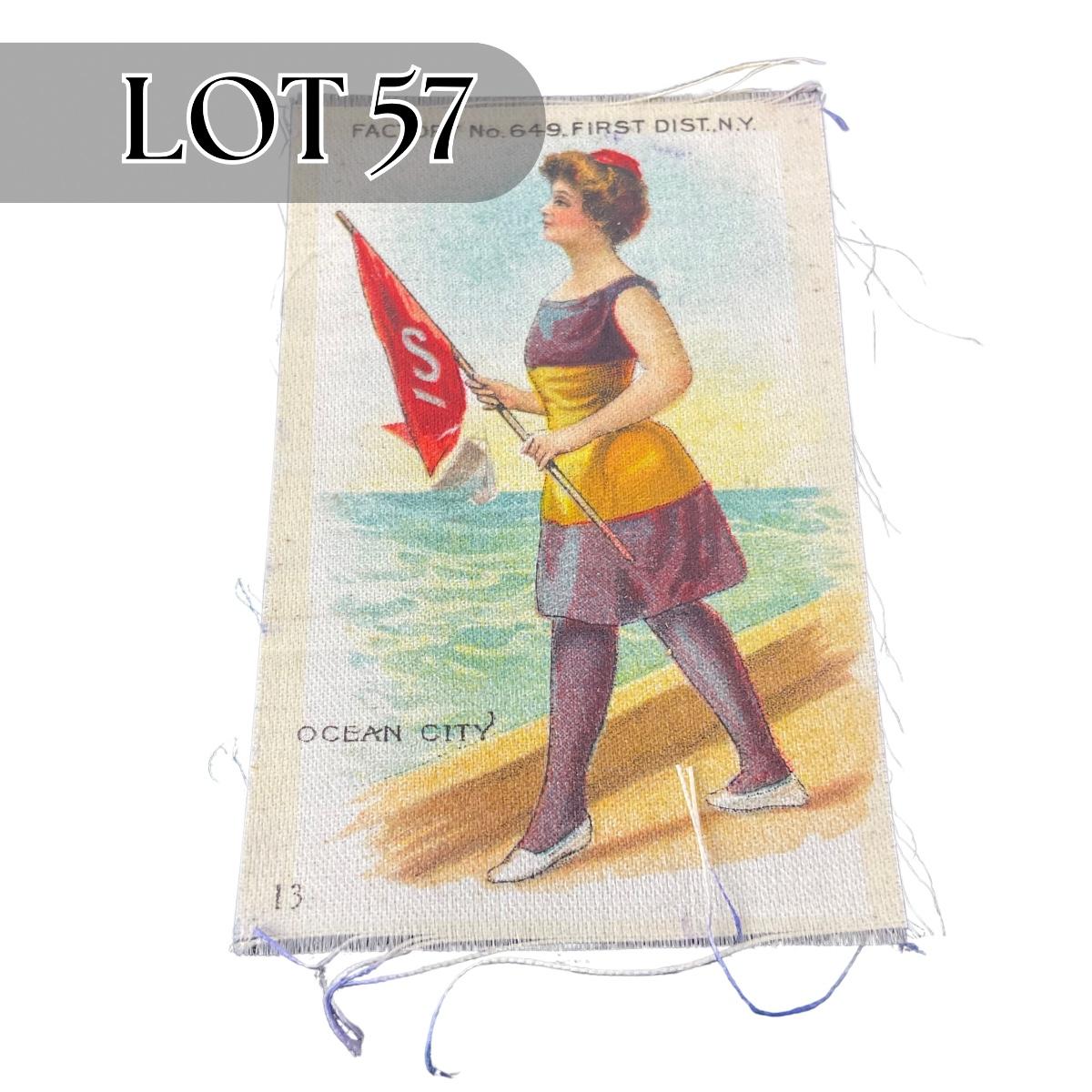 One antique Edwardian bathing beauty tobacco silk. #13 Ocean City silk. Please see photos for details and condition. Any condition statement is given as a courtesy to a client, is an opinion, and should not be treated as a statement of fact. Reference to condition written, oral or within a condition report shall not be regarded as a full account of condition and may not include all defects, alterations, or restorations. Absence of a condition report does not imply a lot is flawless or lacking imperfections or damage. Katherine’s Auction & Appraisal Service shall have no responsibility for any error or omission. Returns shall not be accepted on the basis of condition. ::: Shipping is available on this lot. If you require shipping you must let us know at the close of the auction. We will coordinate with you after the item has been won. Shipping fees will include insurance up to or exceeding the value of all items being mailed. If you have any questions regarding this lot please contact the auctioneer either via this website, by direct email or by phone. PICK UP TIMES and other important information can be found in the TERMS and DESCRIPTION of the auction. Please take a look for pertinent information. Thanks!