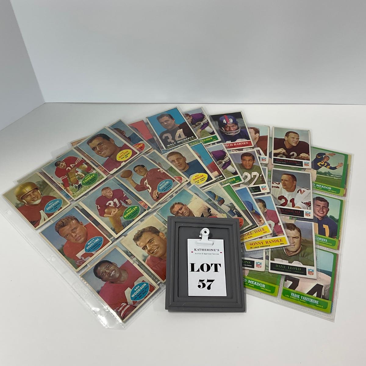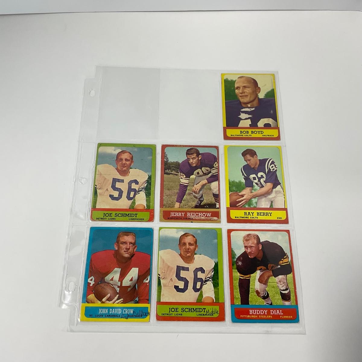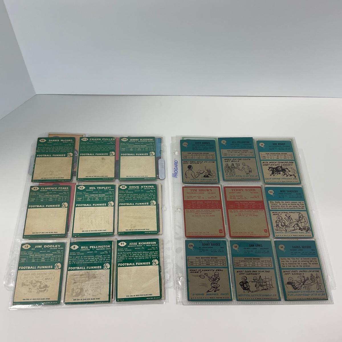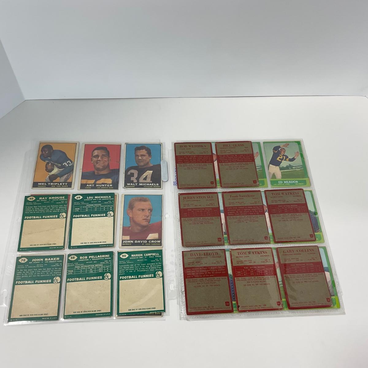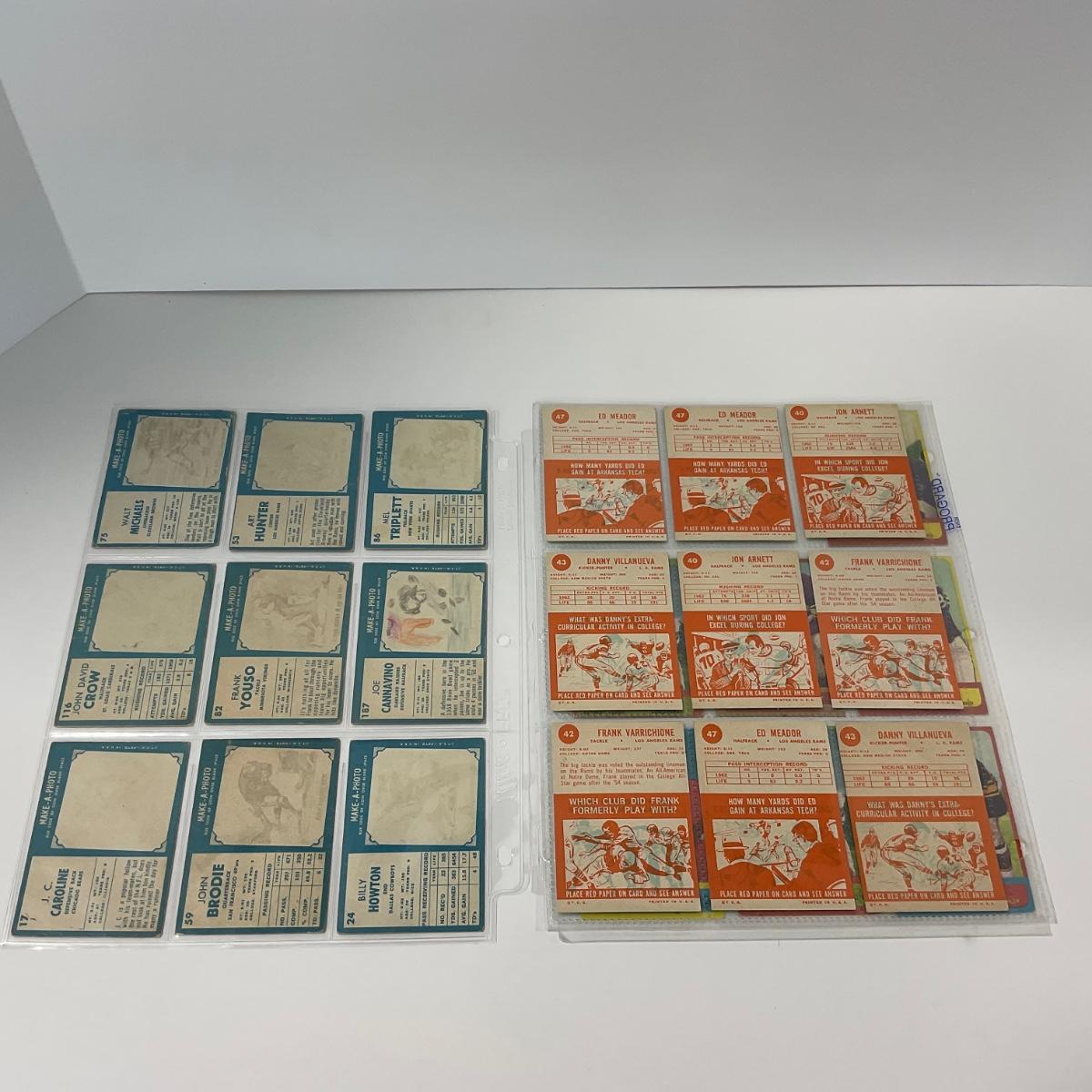 Nine pages of vintage 1960’s football cards (not all pages are completely full). Please see photos for details and condition. ::: Shipping is available on this lot. If you require shipping you must let us know at the close of the auction. We will coordinate with you after the item has been won. Shipping fees will include insurance up to or exceeding the value of all items being mailed. If you have any questions regarding this lot please contact the auctioneer either via this website, by direct email or by phone. PICK UP TIMES and other important information can be found in the TERMS and DESCRIPTION of the auction. Please take a look for pertinent information. Thanks!