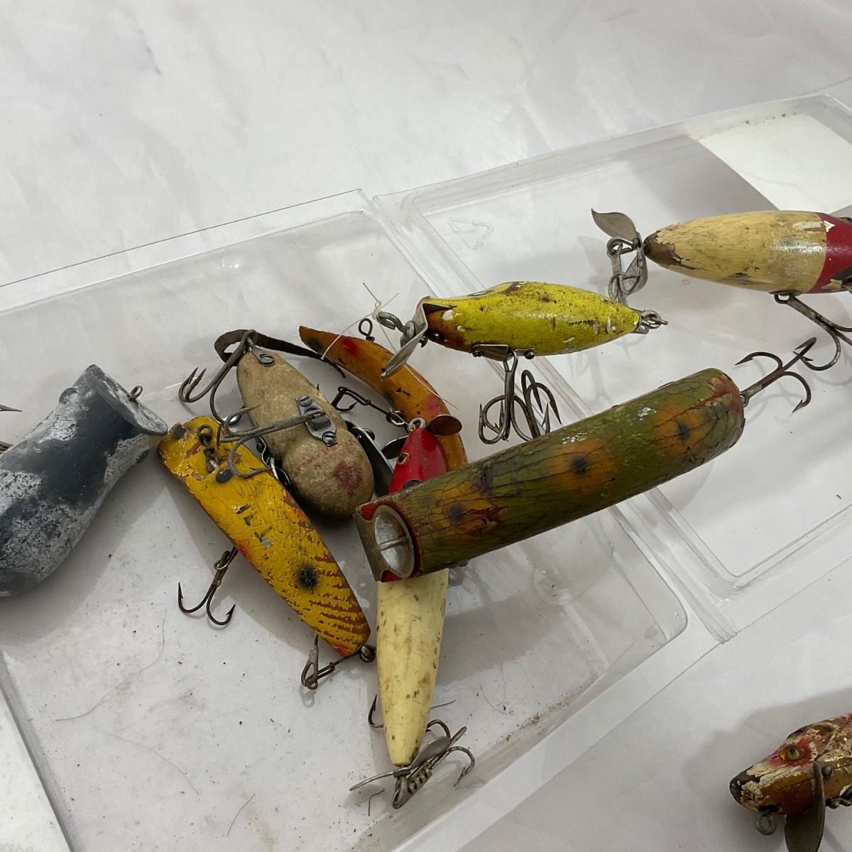 Over ten vintage fishing lures. In very rough shape and worn. Please see photos for details and condition. ::: Shipping is available on this lot. If you require shipping you must let us know at the close of the auction. We will coordinate with you after the item has been won. Shipping fees will include insurance up to or exceeding the value of all items being mailed. If you have any questions regarding this lot please contact the auctioneer either via this website, by direct email or by phone. PICK UP TIMES and other important information can be found in the TERMS and DESCRIPTION of the auction. Please take a look for pertinent information. Thanks!