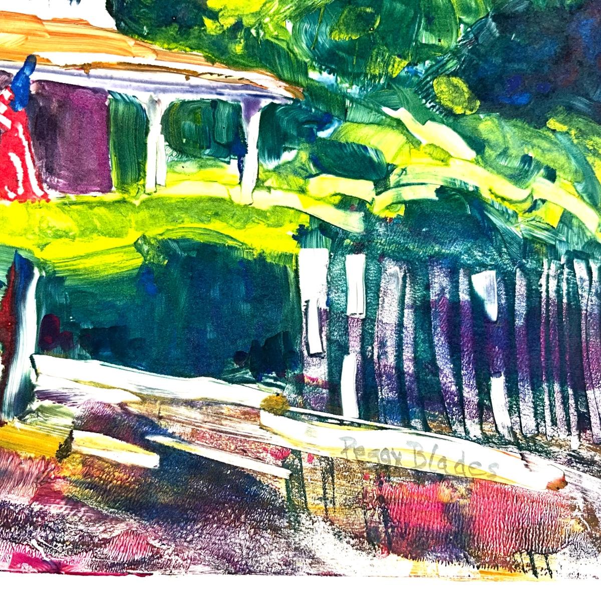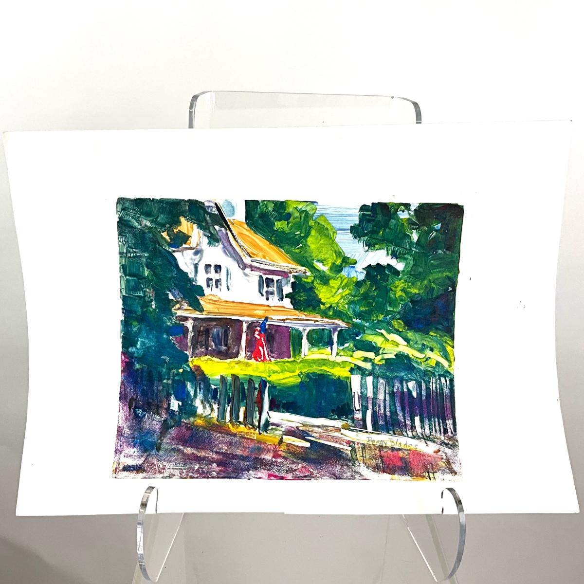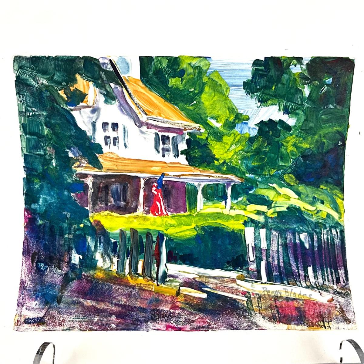 570 Original Monotype Print of House with Flag by Peggy Blades