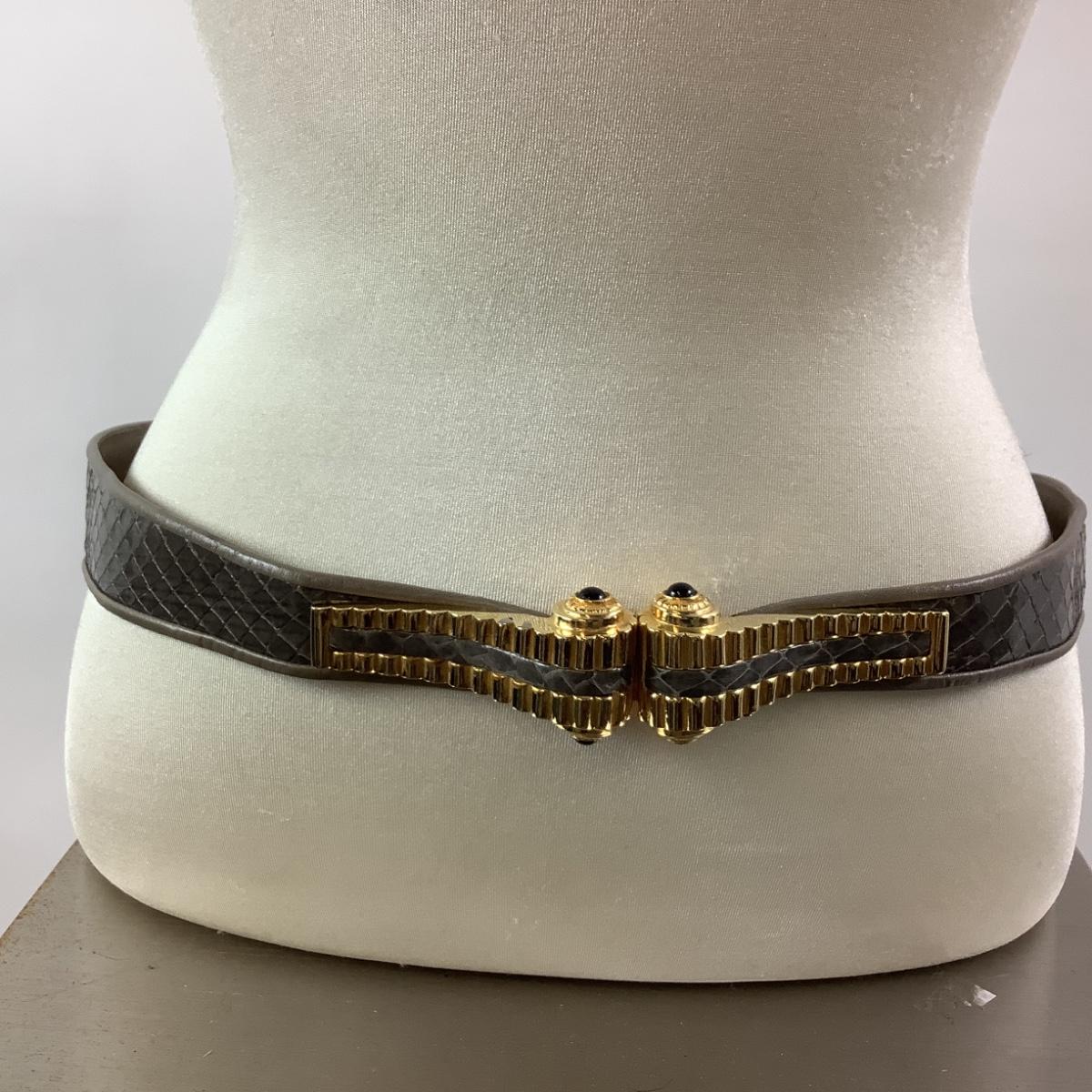 Belt is grey snakeskin, buckle is black and gold, adjustable. The belt comes with the original dust bag.