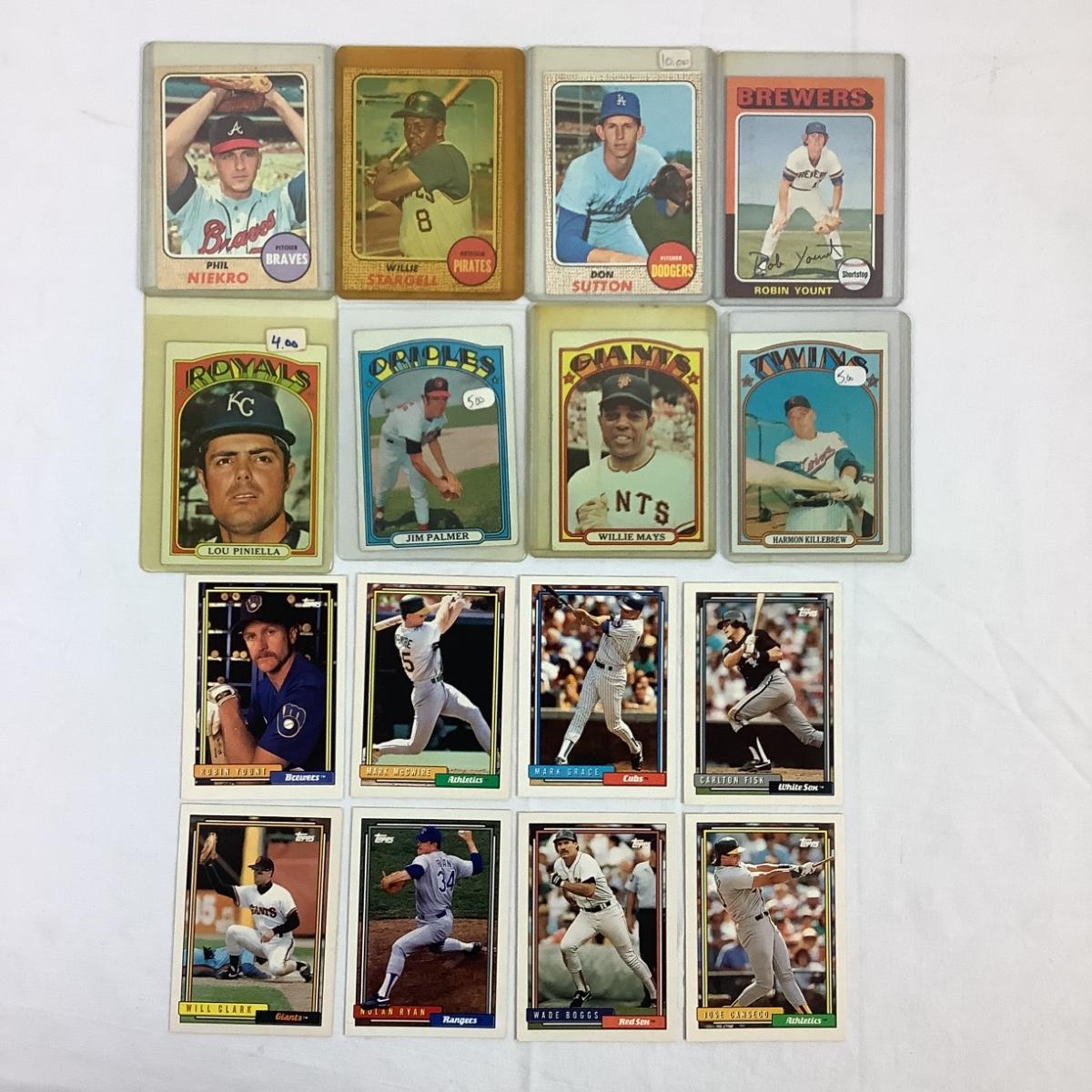 Assorted Baseball Card Lot 1972 Topps Jim Palmer #270, Willie Mays #49, Lou Piniella #580, Harmon Killebrew #51. 1968 Topps Phil Niekro #257, Willie Stargell #86, Don Sutton #103. 1975 Topps Robin Yount #223. & Set of 8 1992 Topps Card.