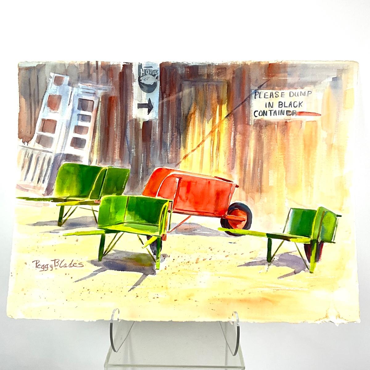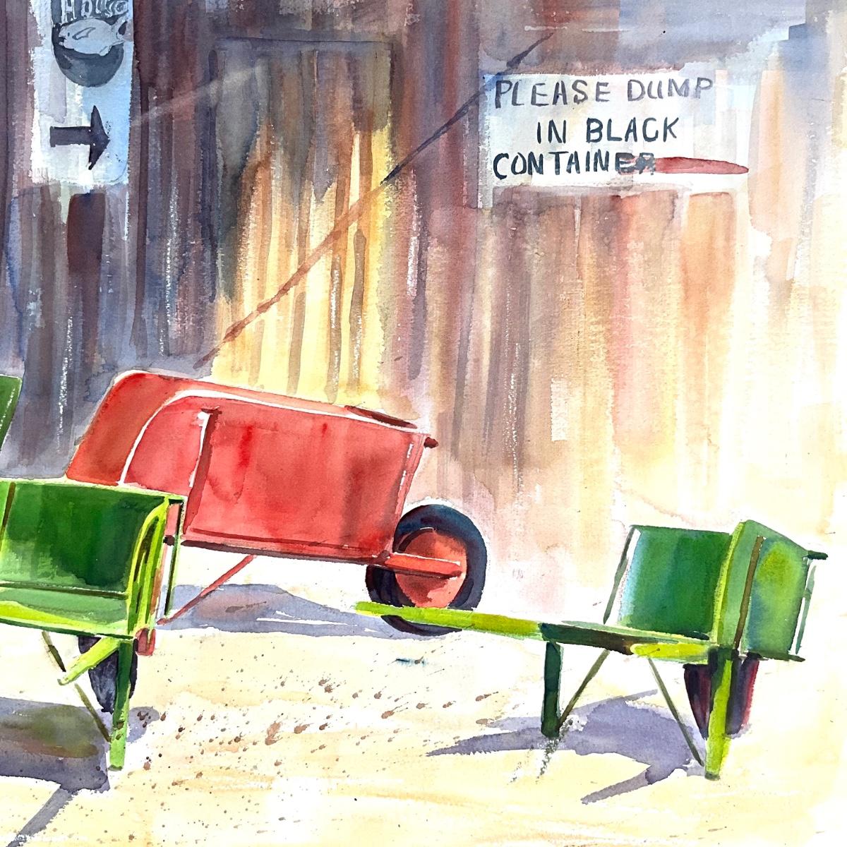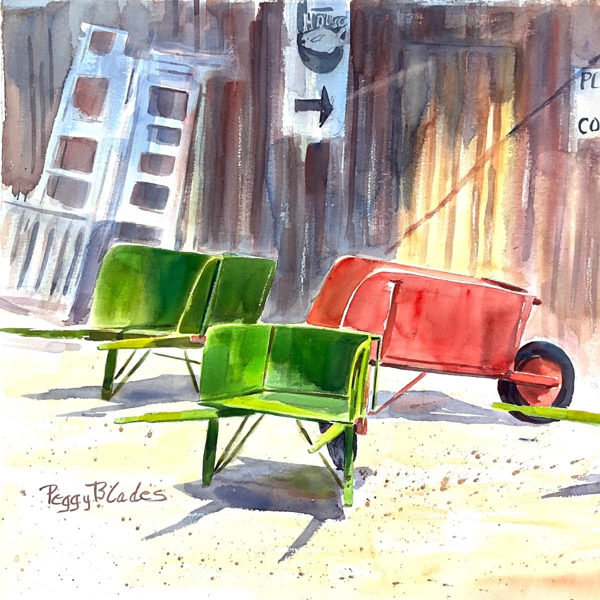 574 Original Watercolor of Wheelbarrows by Peggy Blades