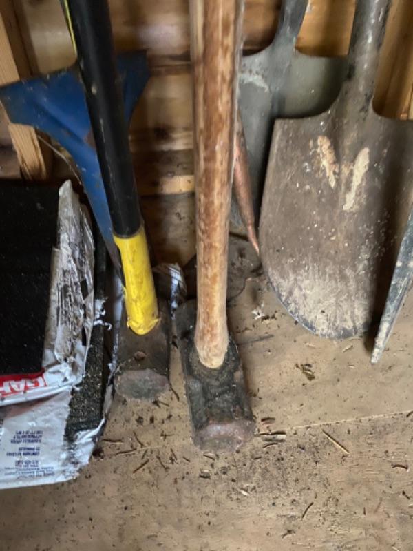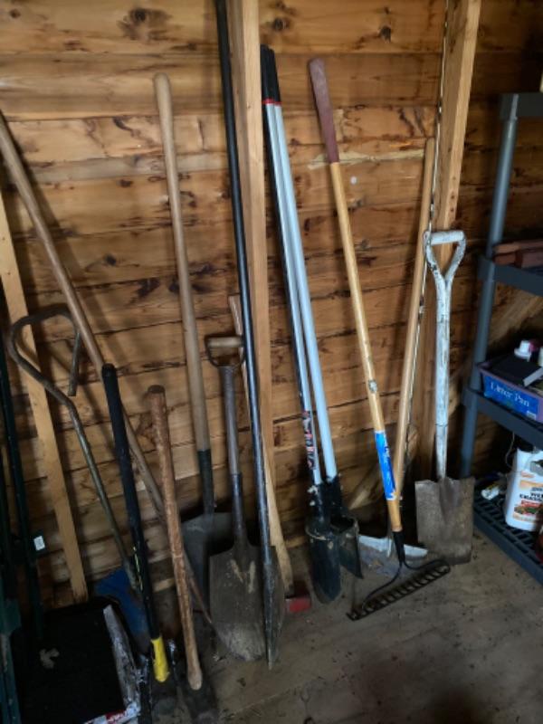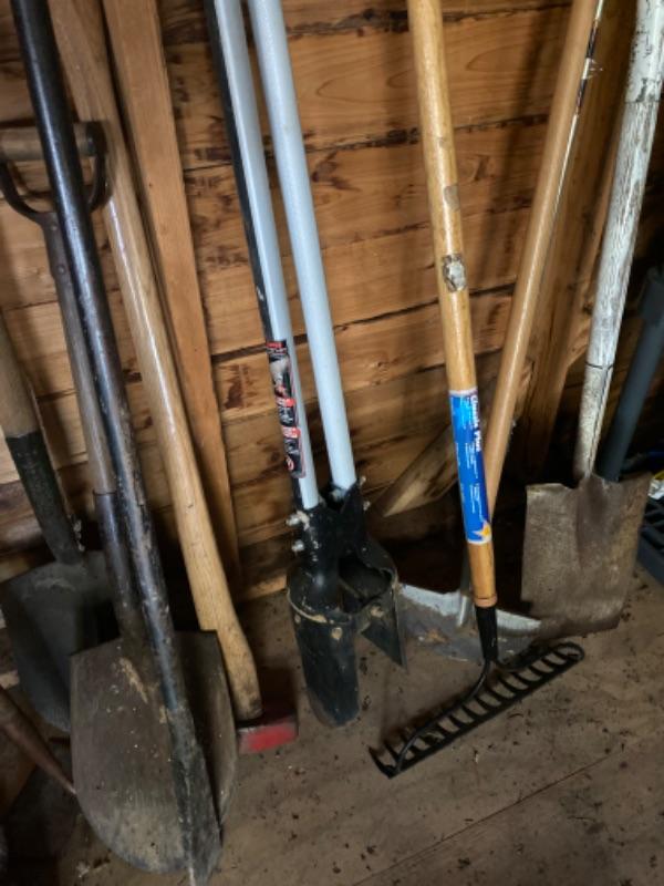Lot of garden tools , shovels, post digger rakes, sledge hammer and more