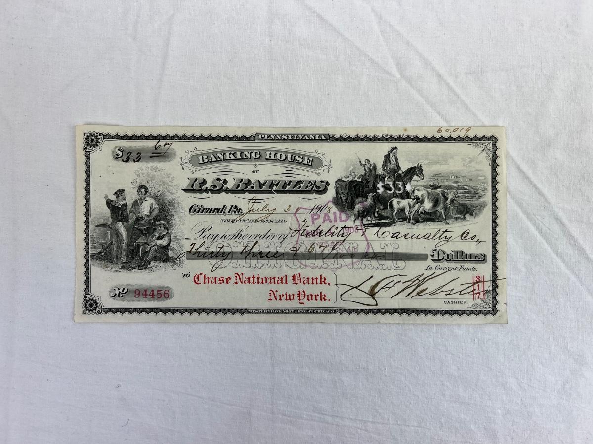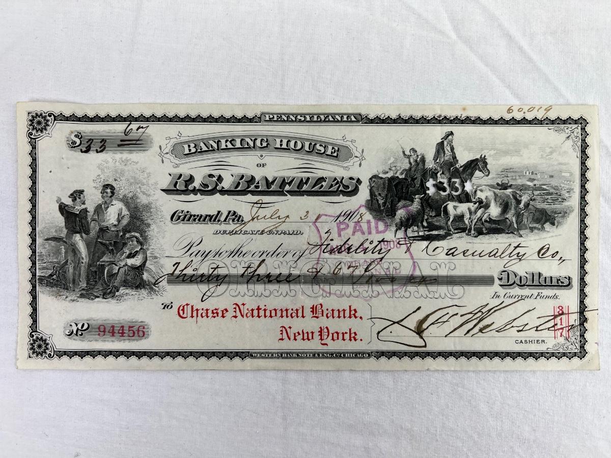 578  Antique 1908 Bank Check Girard Pennsylvania - R.S. Battles Banking House