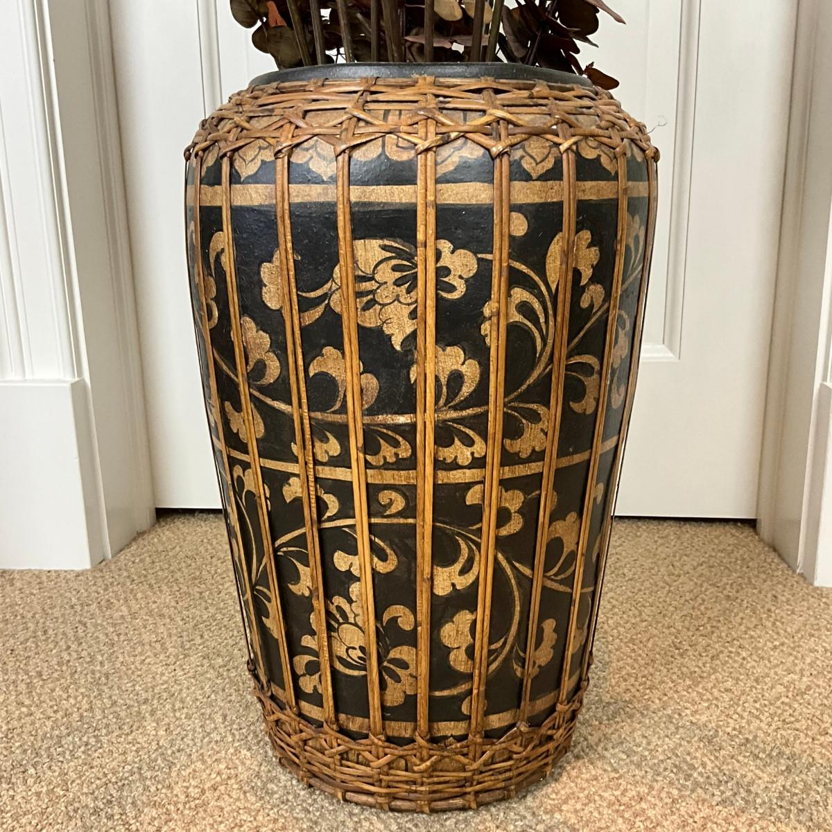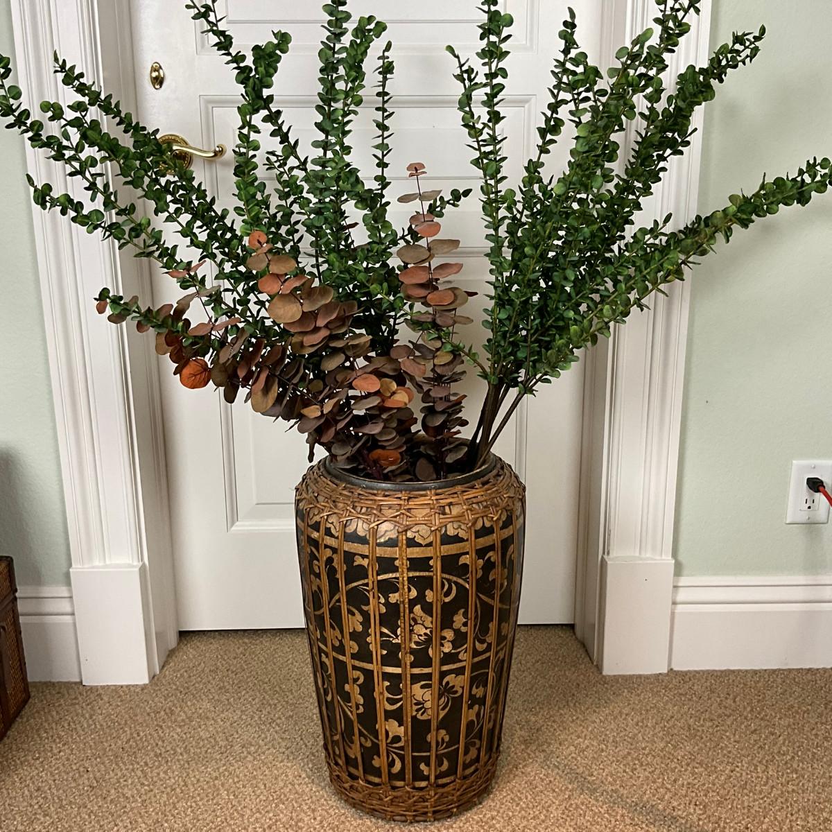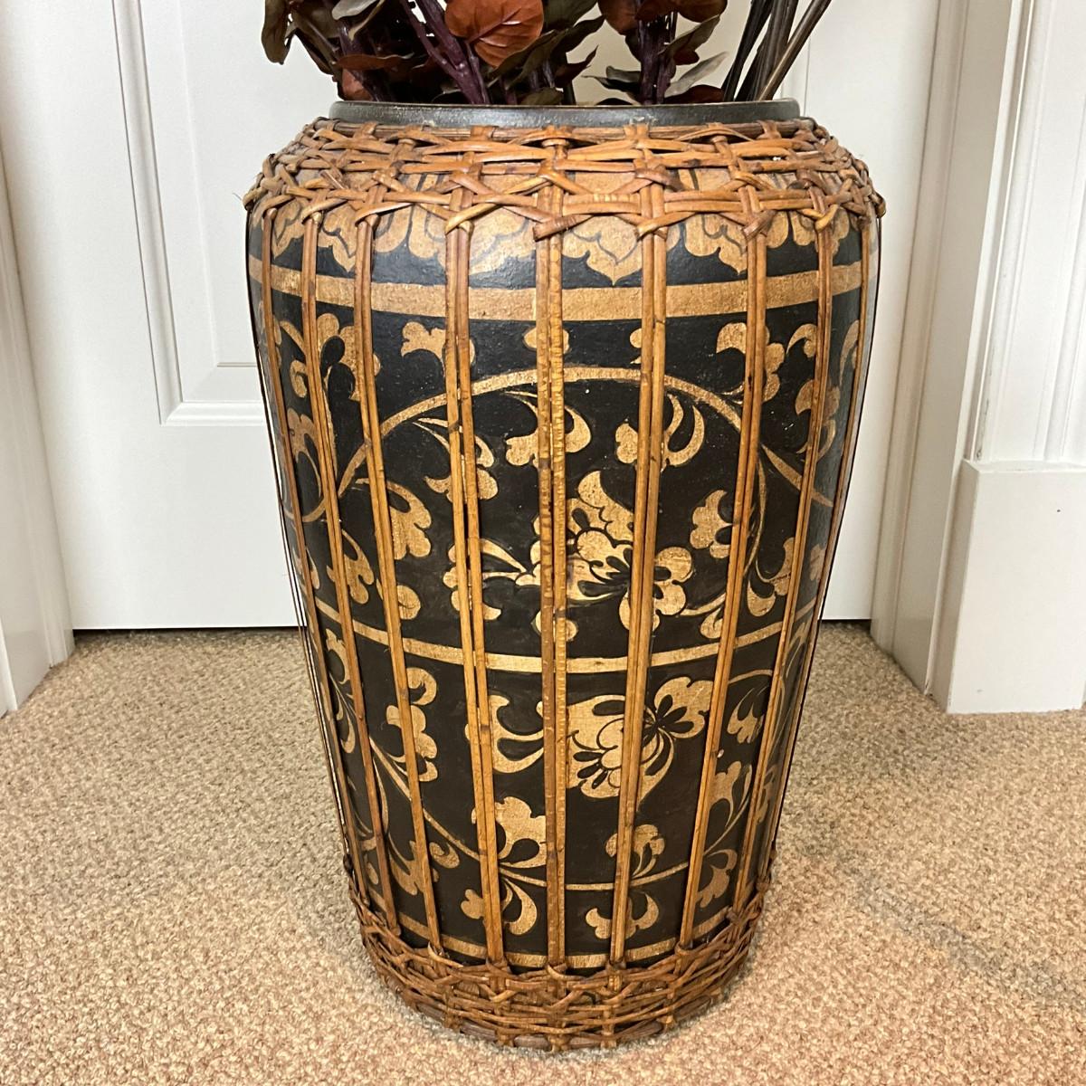 584 Rattan Wrapped Terracotta Decorative Vase W/ Eucalyptus