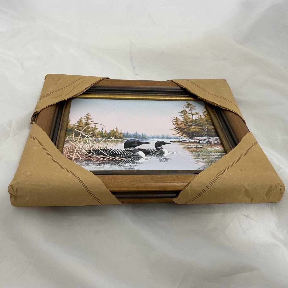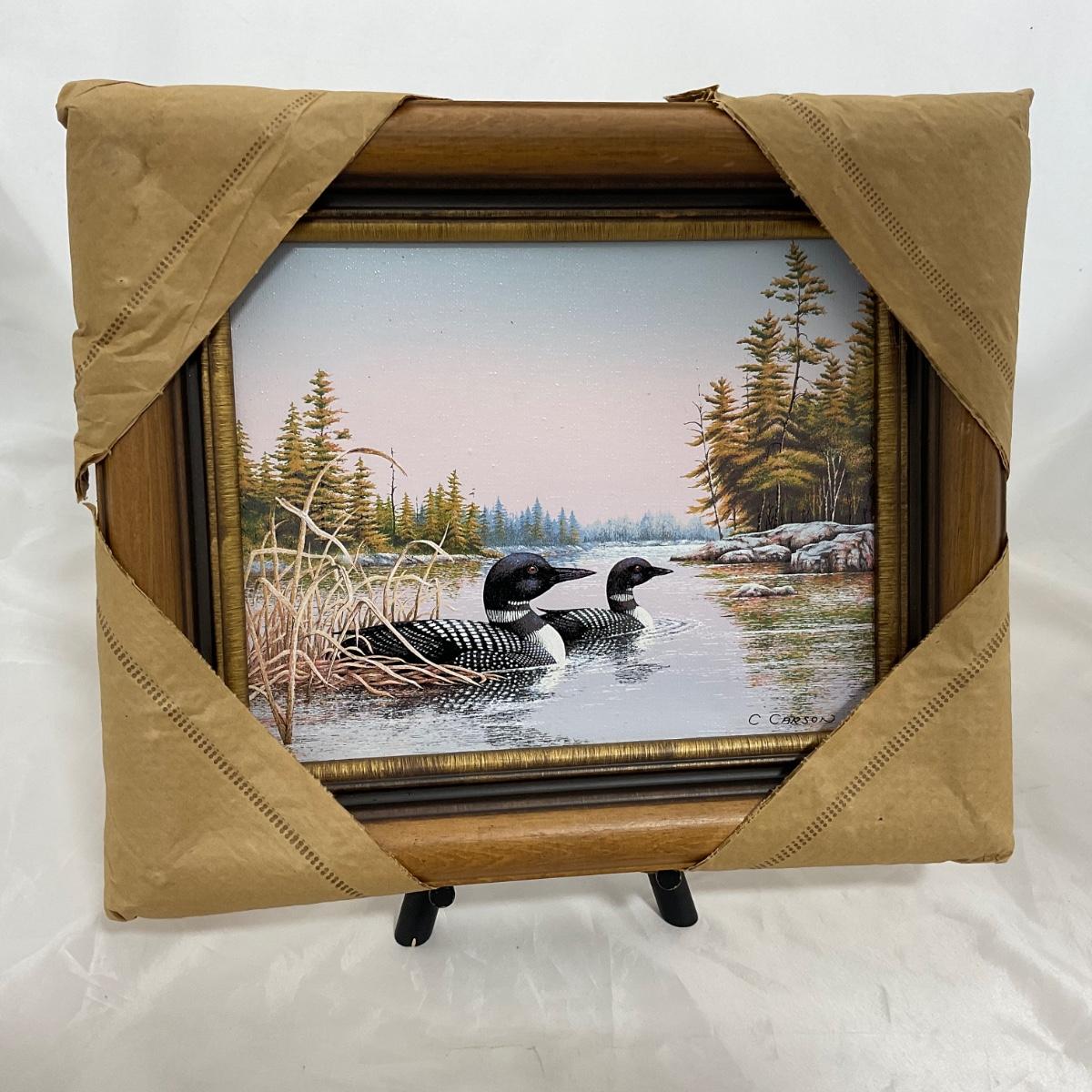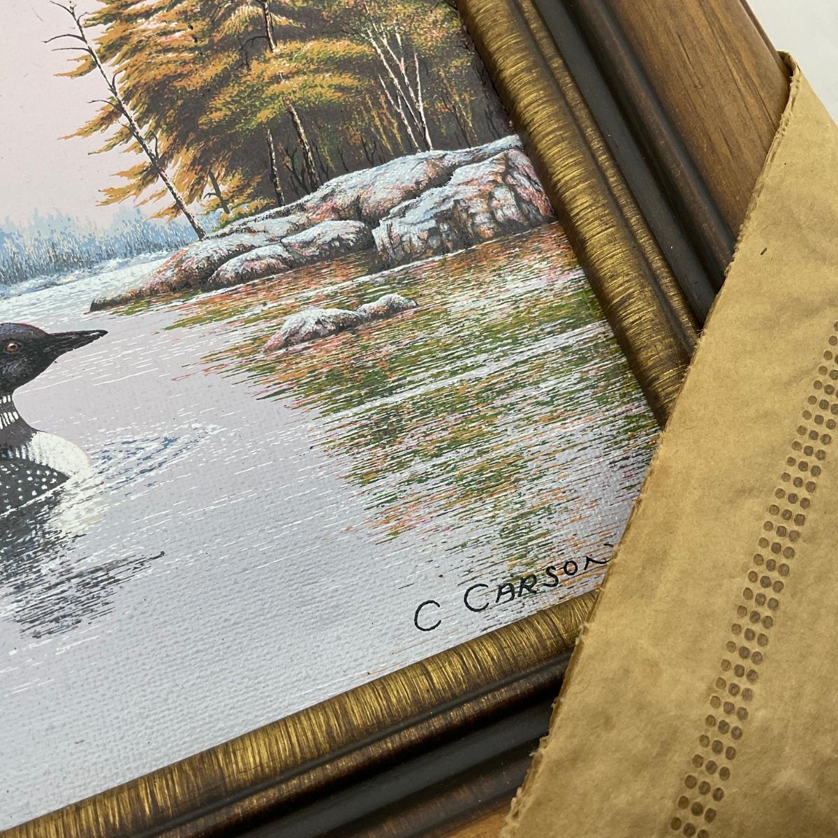 One original Loons oil painting on canvas by C. Carson 11 inches by 13 inches in size. Please see photos for details and condition. ::: Shipping is available on this lot. If you require shipping you must let us know at the close of the auction. We will coordinate with you after the item has been won. Shipping fees will include insurance up to or exceeding the value of all items being mailed. If you have any questions regarding this lot please contact the auctioneer either via this website, by direct email or by phone. PICK UP TIMES and other important information can be found in the TERMS and DESCRIPTION of the auction. Please take a look for pertinent information. Thanks!