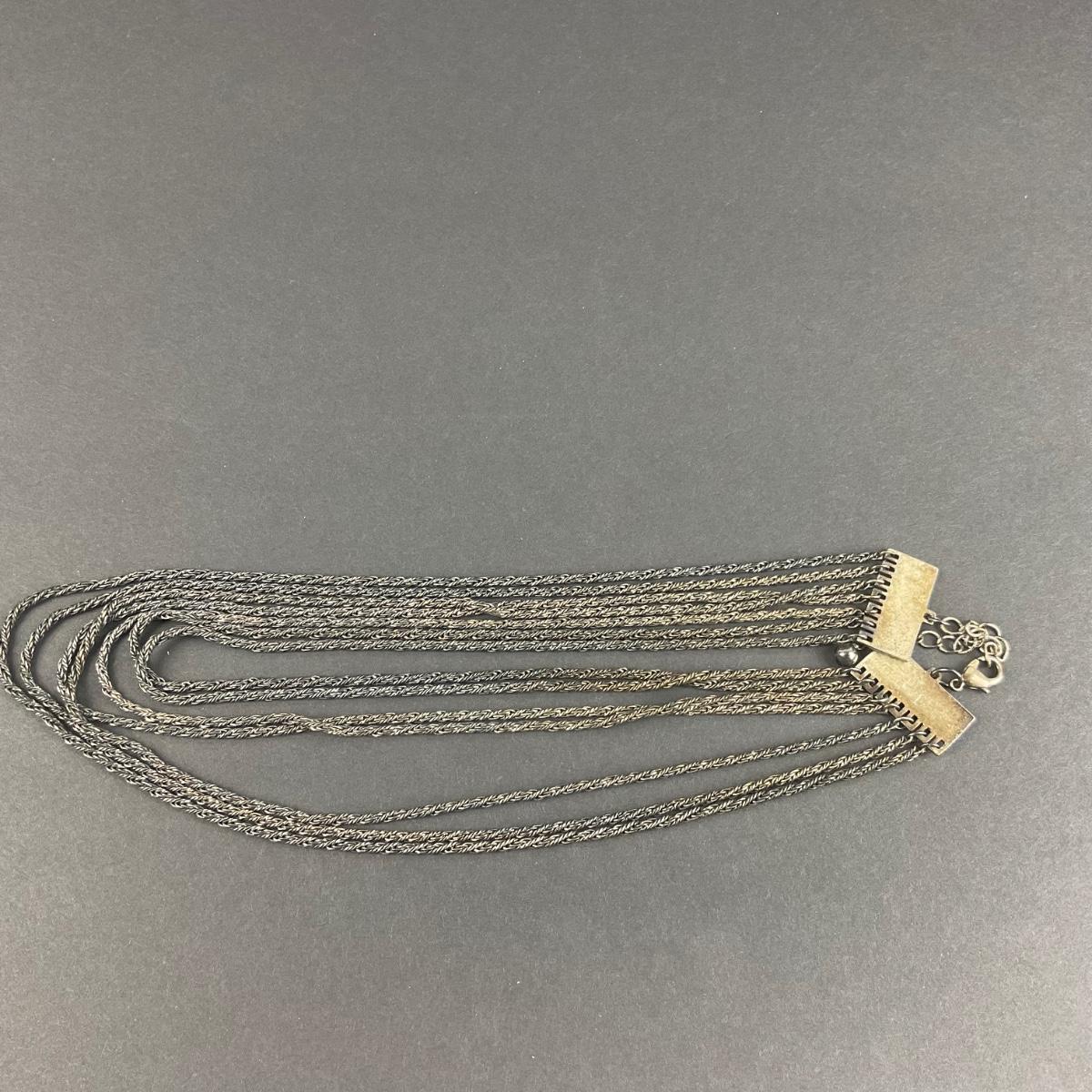 One vintage unique metal multi strand necklace. This piece is NOT sterling. Please see photos for details and condition. Any condition statement is given as a courtesy to a client, is an opinion, and should not be treated as a statement of fact. Reference to condition written, oral or within a condition report shall not be regarded as a full account of condition and may not include all defects, alterations, or restorations. Absence of a condition report does not imply a lot is flawless or lacking imperfections or damage. Katherine’s Auction & Appraisal Service shall have no responsibility for any error or omission. Returns shall not be accepted on the basis of condition. ::: Shipping is available on this lot. If you require shipping you must let us know at the close of the auction. We will coordinate with you after the item has been won. Shipping fees will include insurance up to or exceeding the value of all items being mailed. If you have any questions regarding this lot please contact the auctioneer either via this website, by direct email or by phone. PICK UP TIMES and other important information can be found in the TERMS and DESCRIPTION of the auction. Please take a look for pertinent information. Thanks!