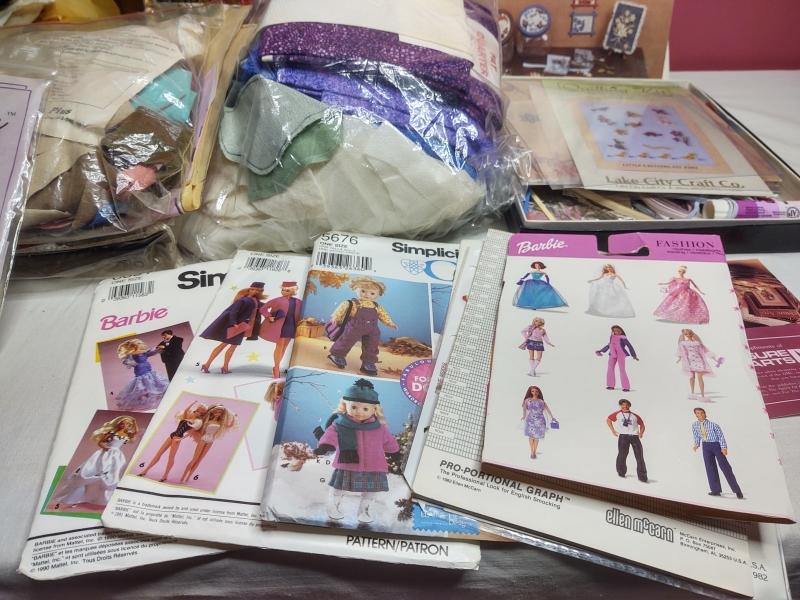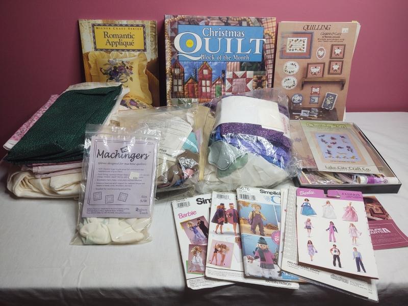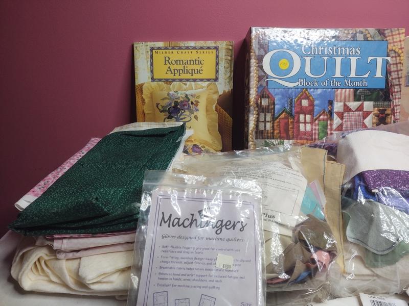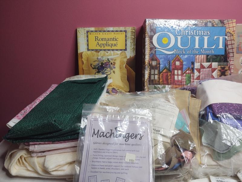 Lot includes books, patterns, and cloth squares. Not pictured is a small amount of pressed batting for quilting.