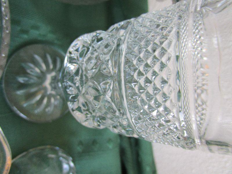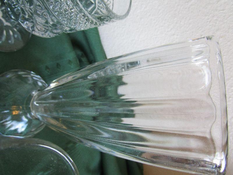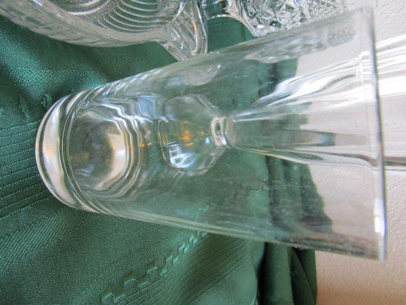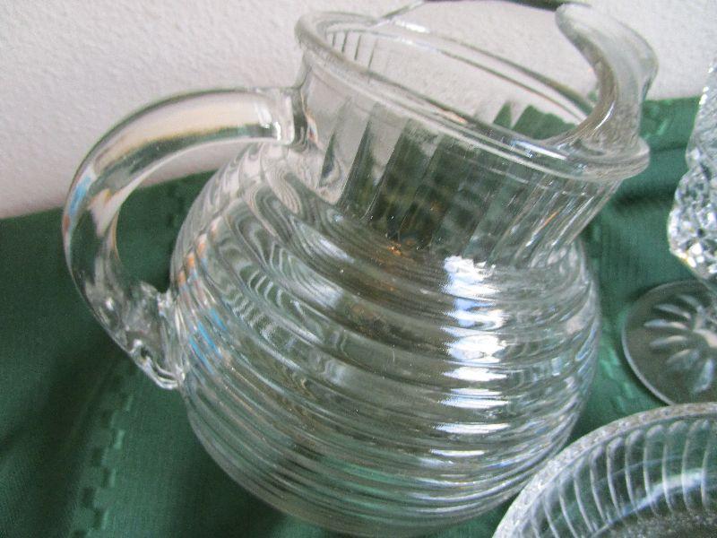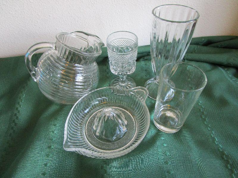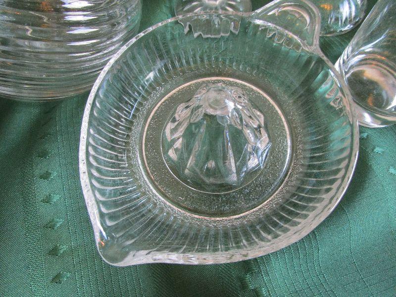 Clear one quart pitcher; heavy duty orange juicer; and three glasses. All very nice condition.