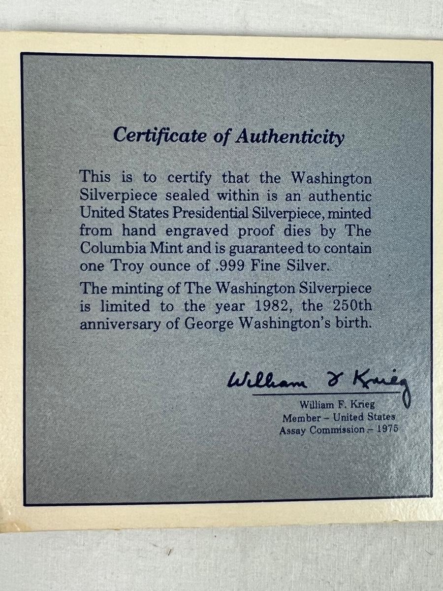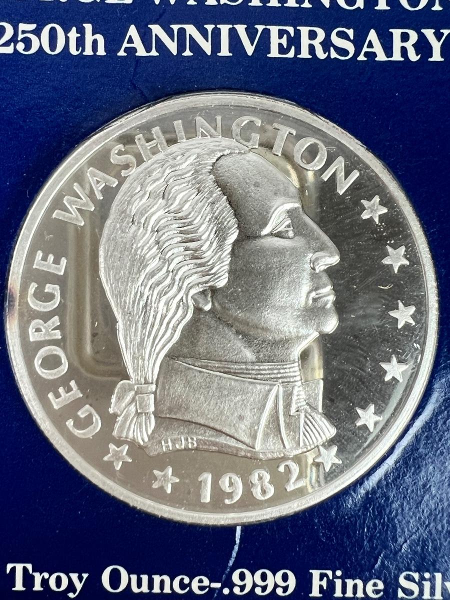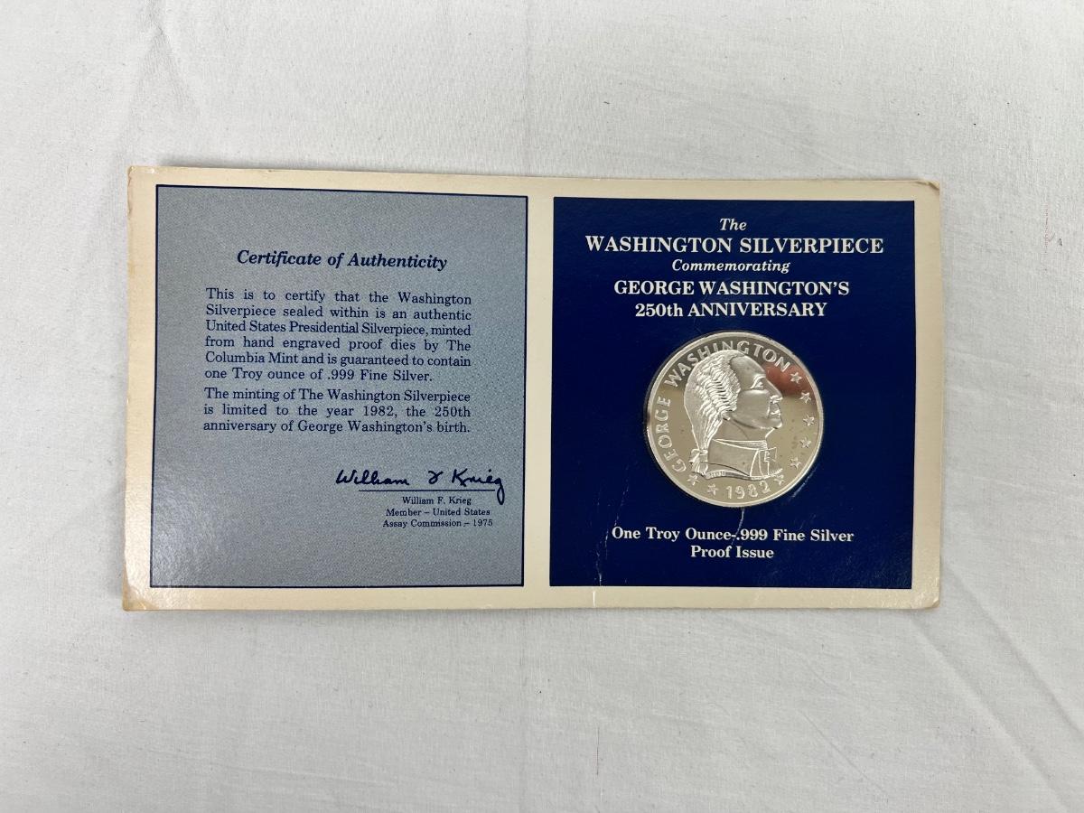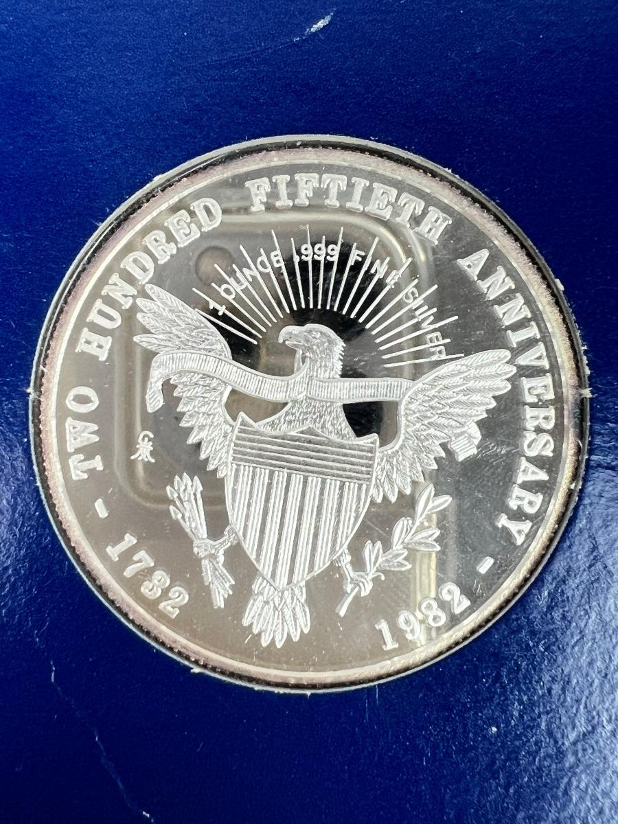 Medal George Washington 250th Anniversary Silver 1 Troy Oz .999 w/ Stamp & Certificate of Authenticity.