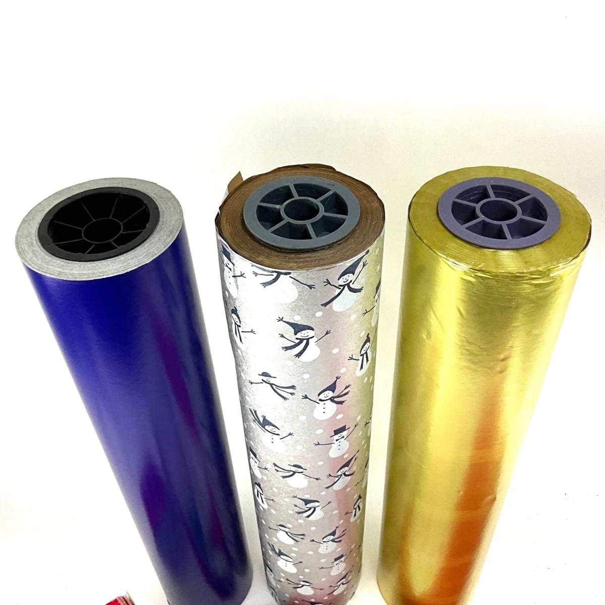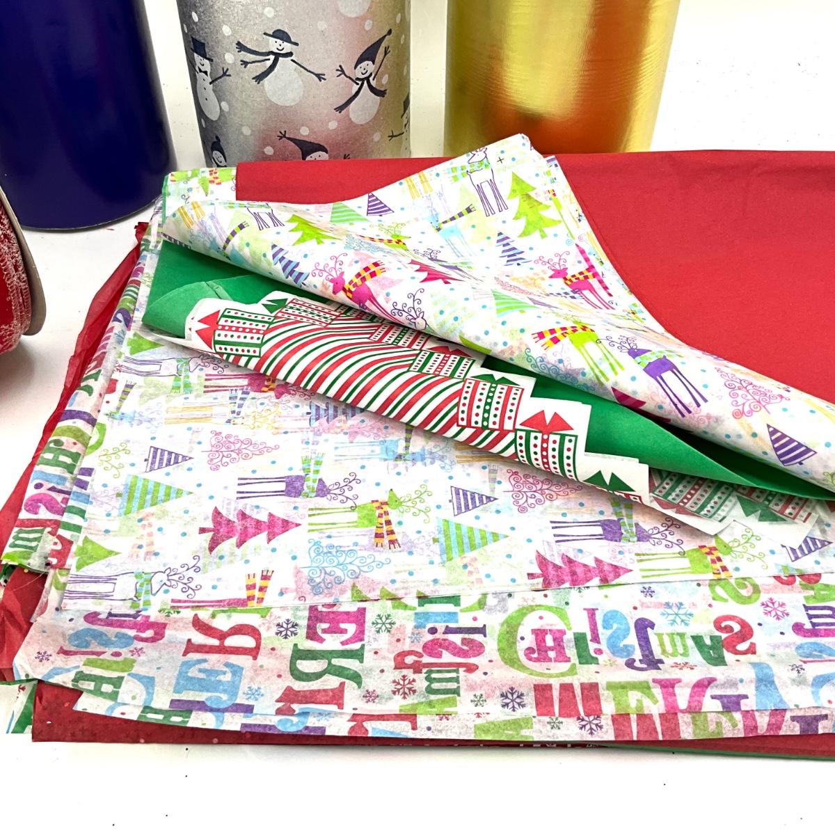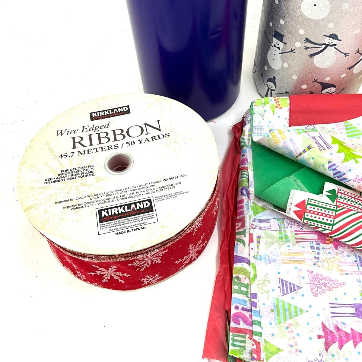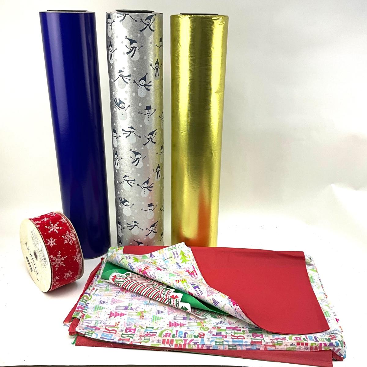 Tissue paper, gold, blue and snowman print wrapping paper on large rool with roll of red snowflake ribbon