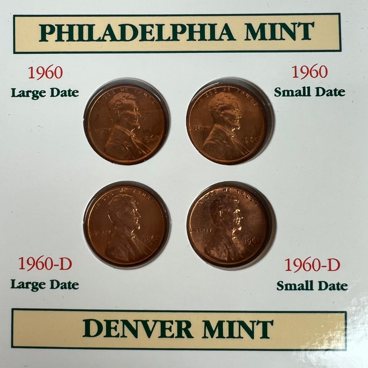 4 Major Varieties of 1960 Lincoln Cents Philadelphia & Denver Mint.